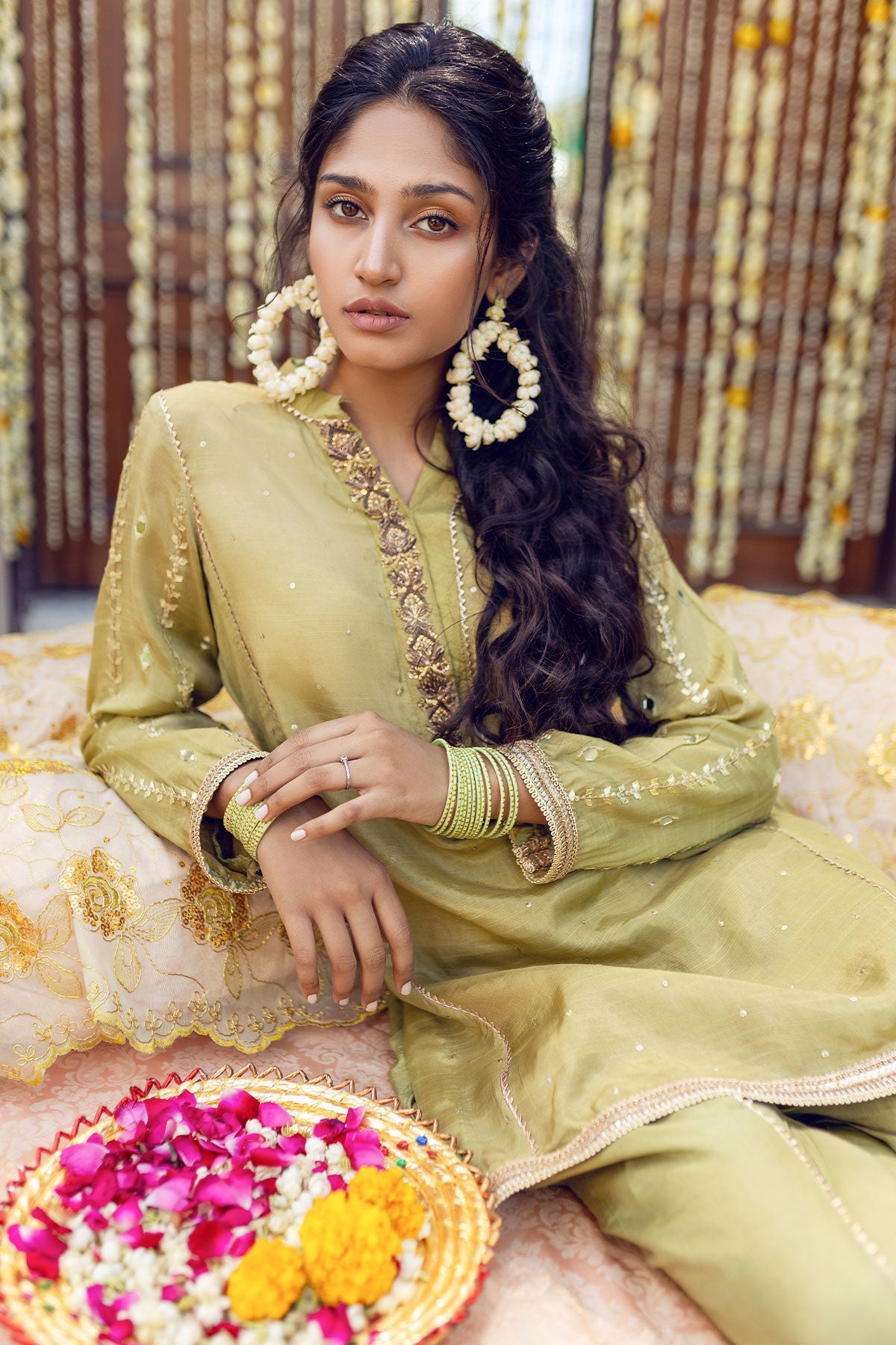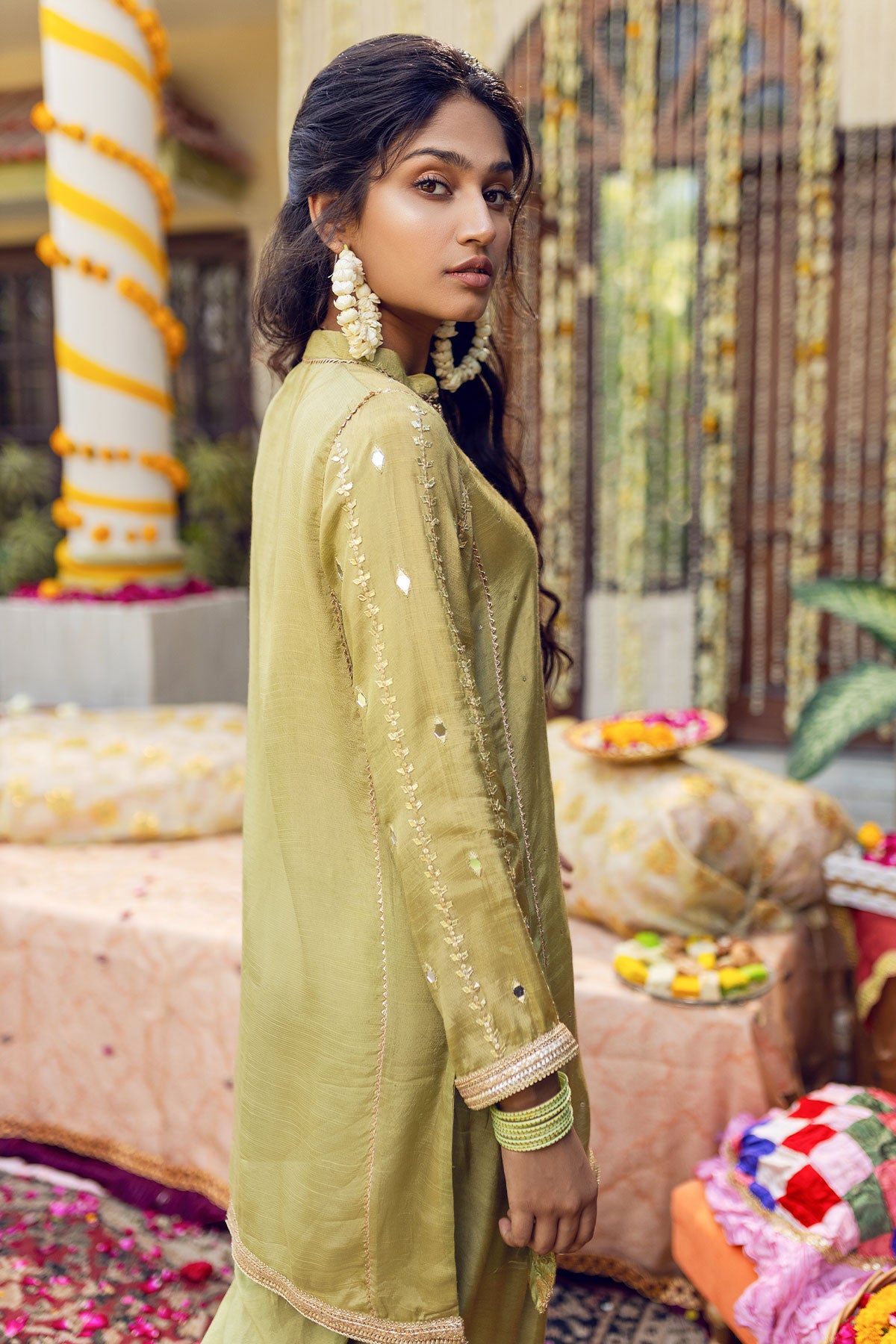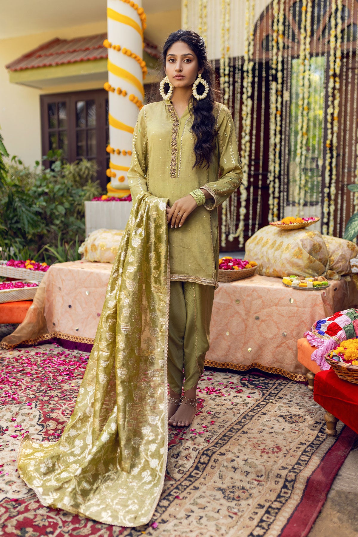 Dazzle in this classic short shirt enhanced with mirror work and tilla details on the sleeves, the neckline features zardozi craftsmanship and sequins sprayed all over. It comes with tulip shalwar.