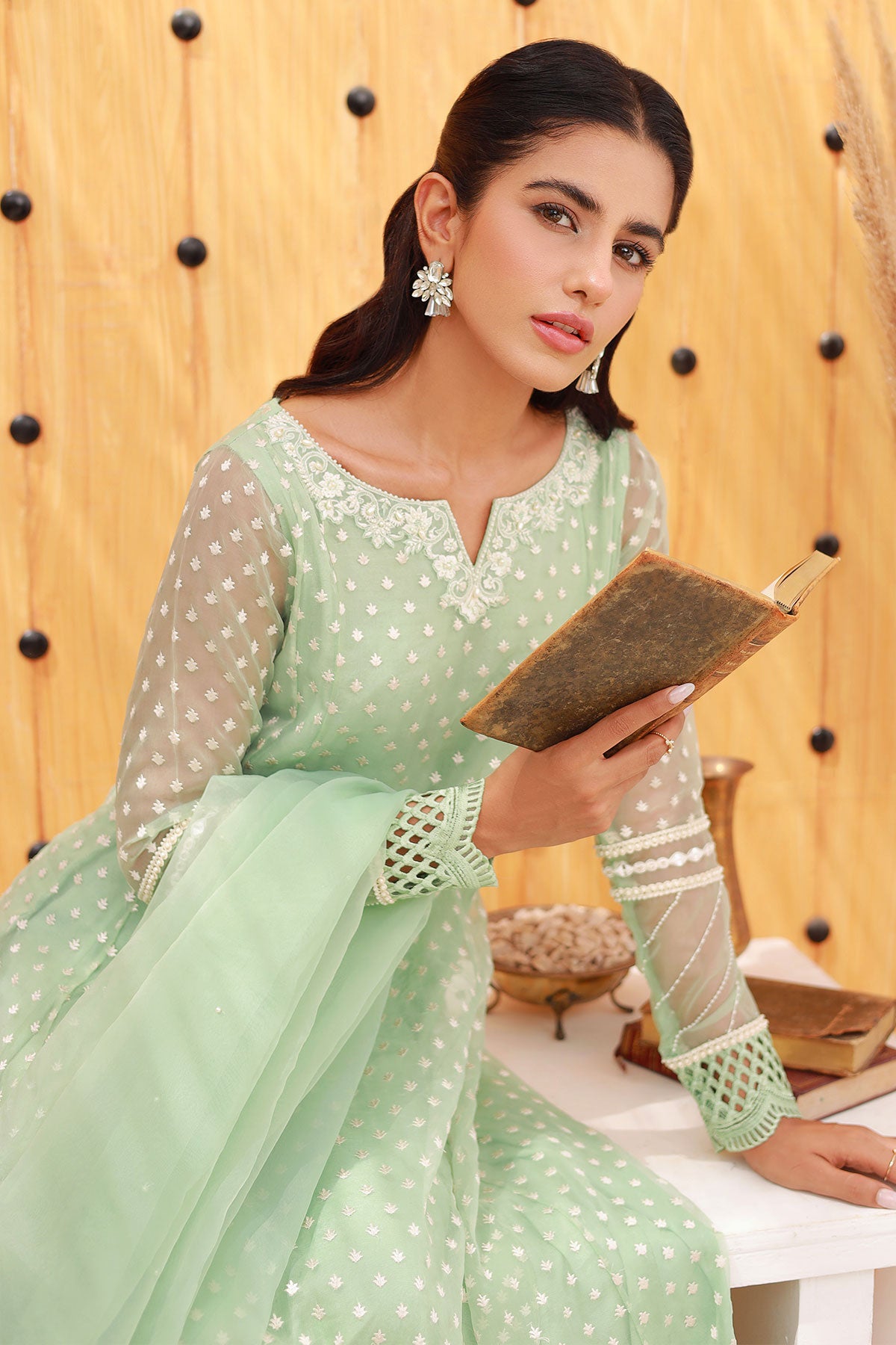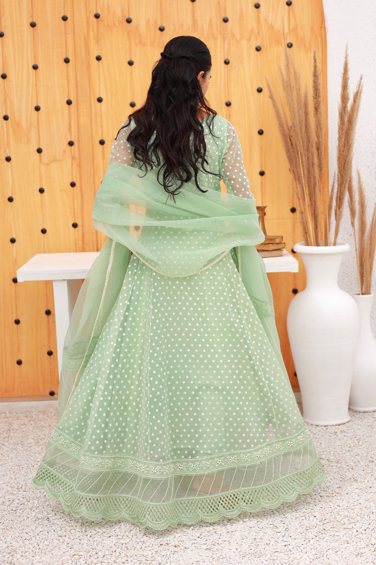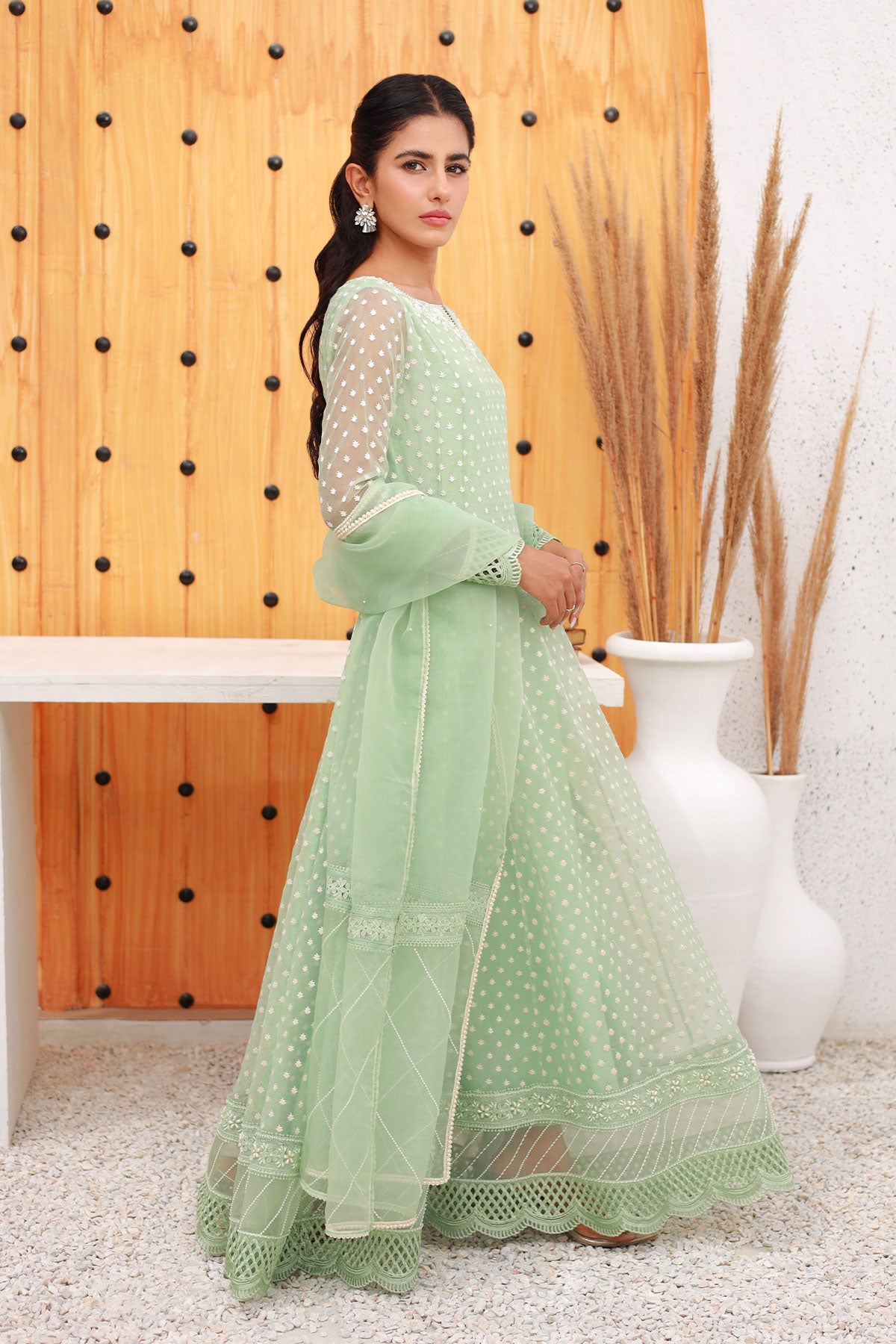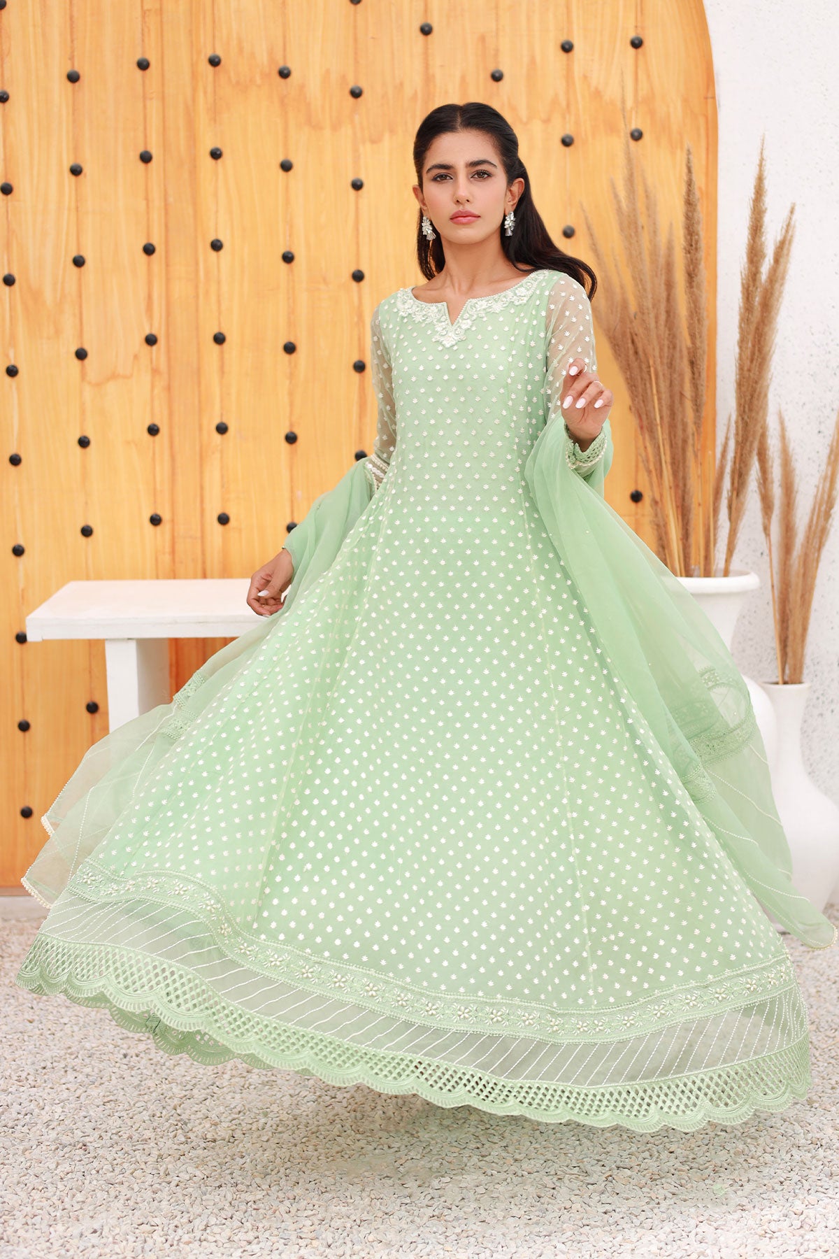Mint green Anarkali style dress with embroidered neckline, pearls details on neckline, sleeves and daaman with a cutwork border.