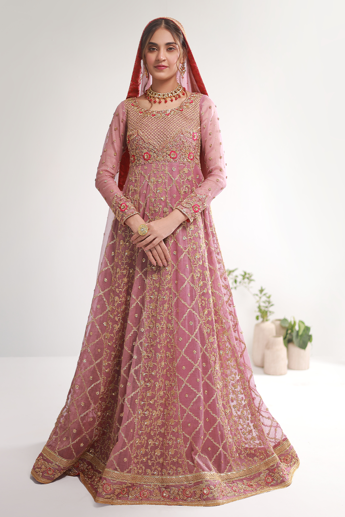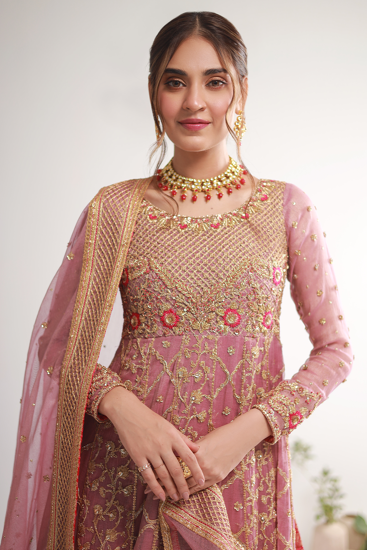 Powder Pink Bridal - Beautifully embroidered khaad net full legth gown with fine handwork on it. The exquisite embellished panel and intricate craftsmanship makes it fascinating and mysteriously attractive.