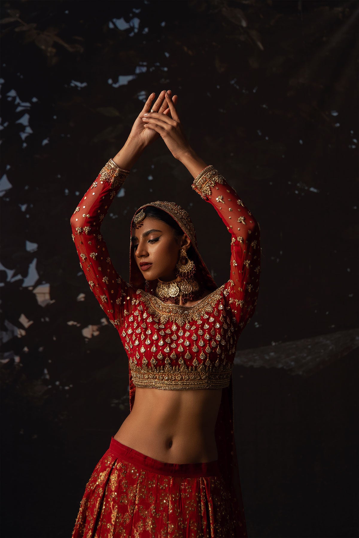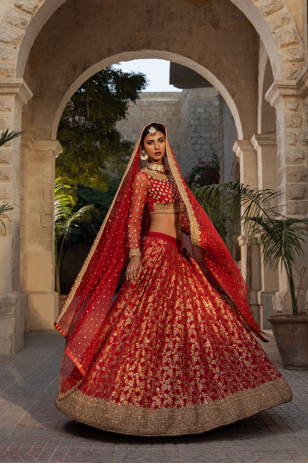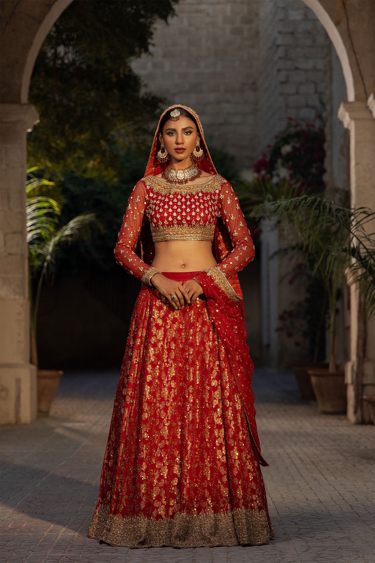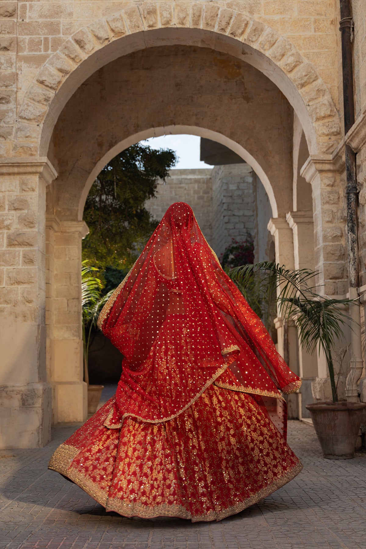 Imbued with meticulous care, diligence, and love, this exquisite bridal ensemble is a testament to timeless elegance and artisanal craftsmanship. The focal point is a stunning chiffon Banarsi lehnga, adorned with thick embellished borders intricately crafted with naqshi, dabka, and stones, adding a touch of opulence to every step. Complementing the lehnga is a meticulously handcrafted choli, elevated by the shimmering brilliance of kundan, naqshi, and kora detailing, exuding regal charm and sophistication. Completing the ensemble is a net dupatta, featuring a thick matha patti on one side and delicate sequin spray all over, framed by three sides of thin borders, adding a mesmerizing finishing touch to this bridal masterpiece.
