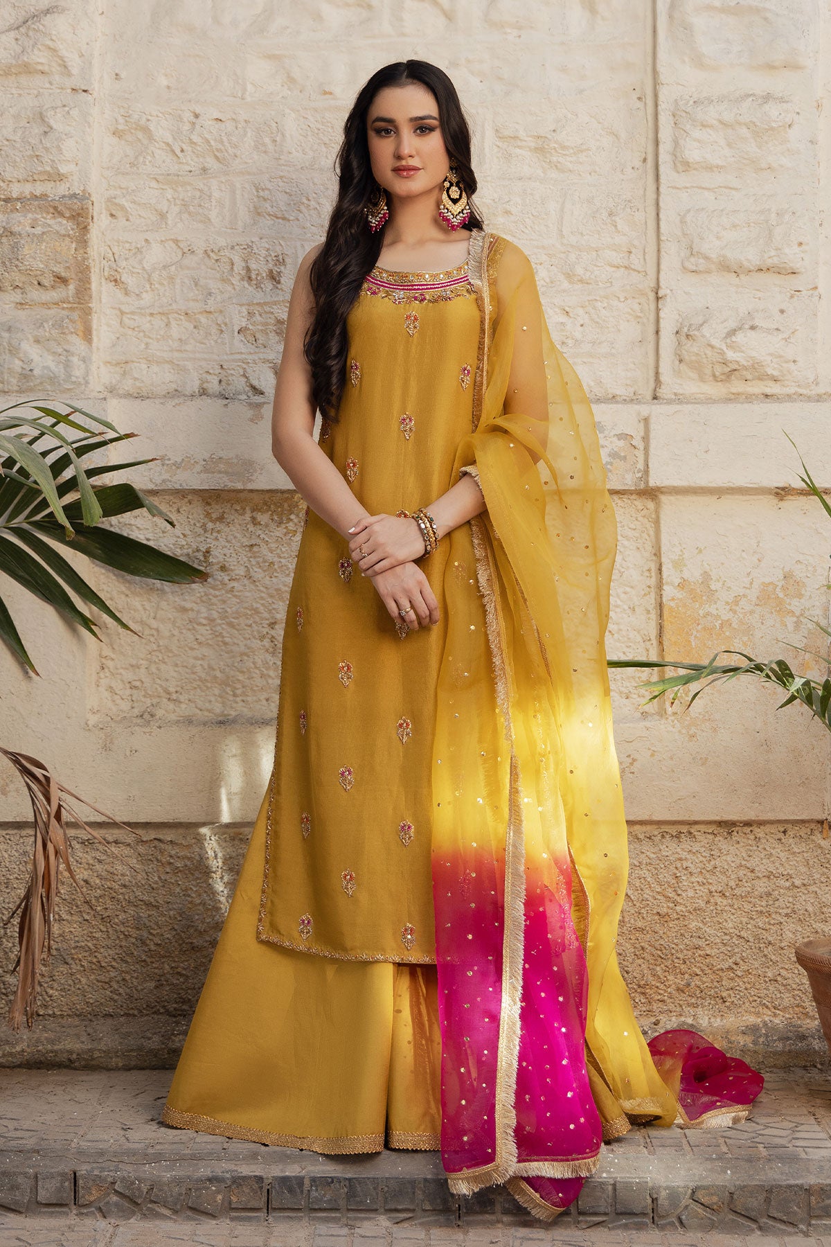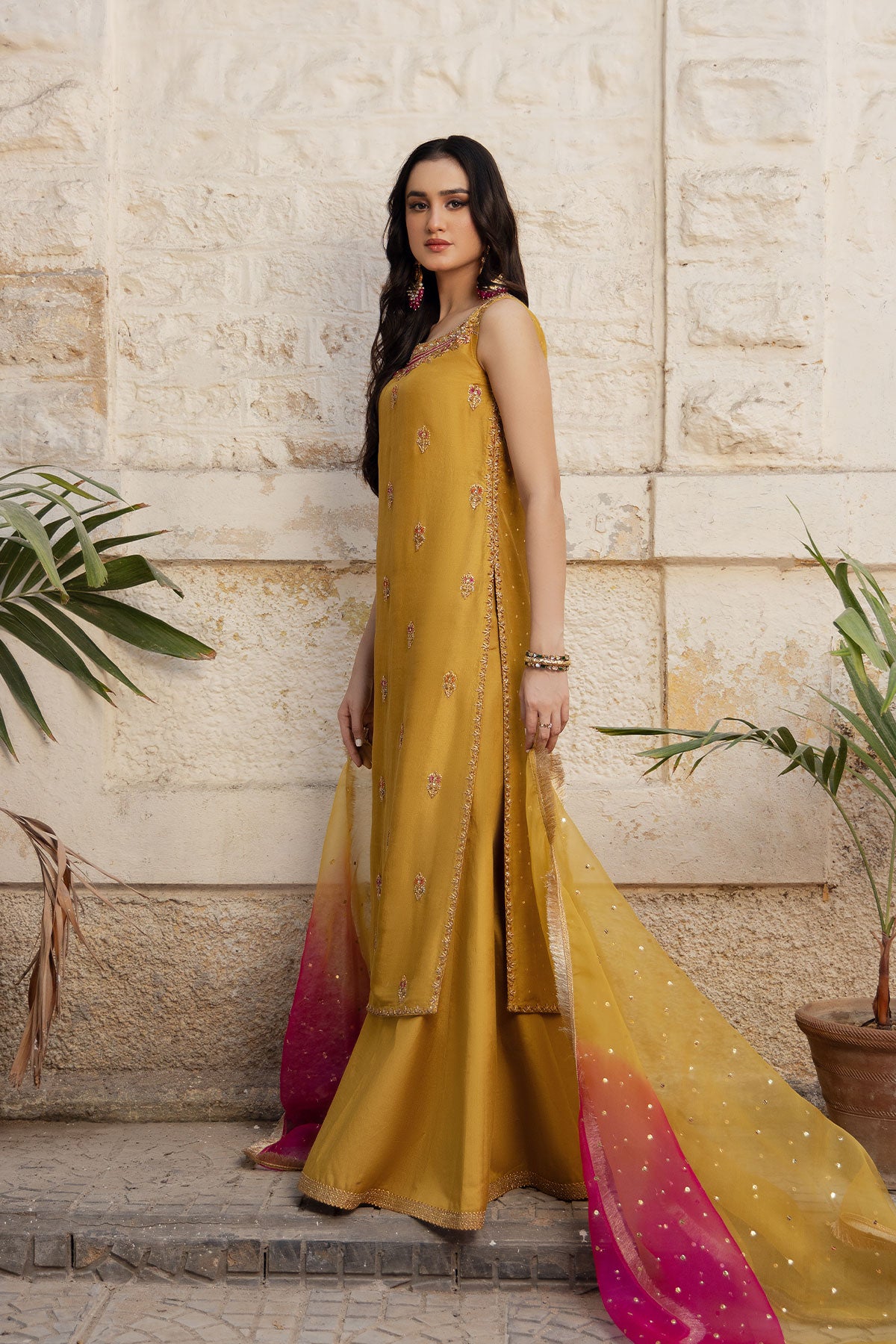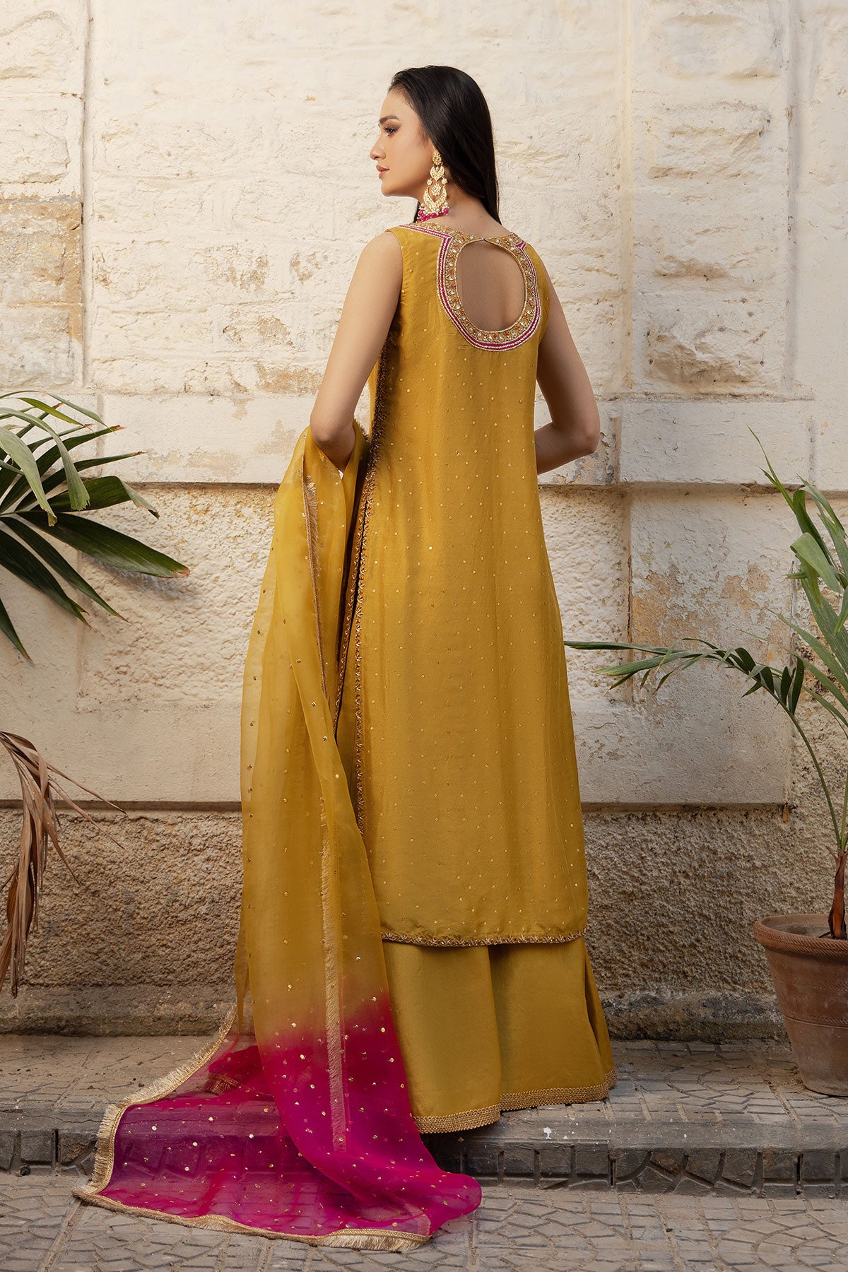 Experience Luxury in this formal ensemble. The olive green straight shirt, crafted from pure raw silk, exudes opulence with its intricately hand-embellished neckline, side chaak, daaman, and sleeves. Each delicate motif, adorned with colored French knots, kora, dabka, and naqshi, showcases artisanal craftsmanship at its finest. Paired with pure silk dhaka pants. The pure organza two-toned dupatta adds an ethereal touch with its sprayed and lace-detailed borders.