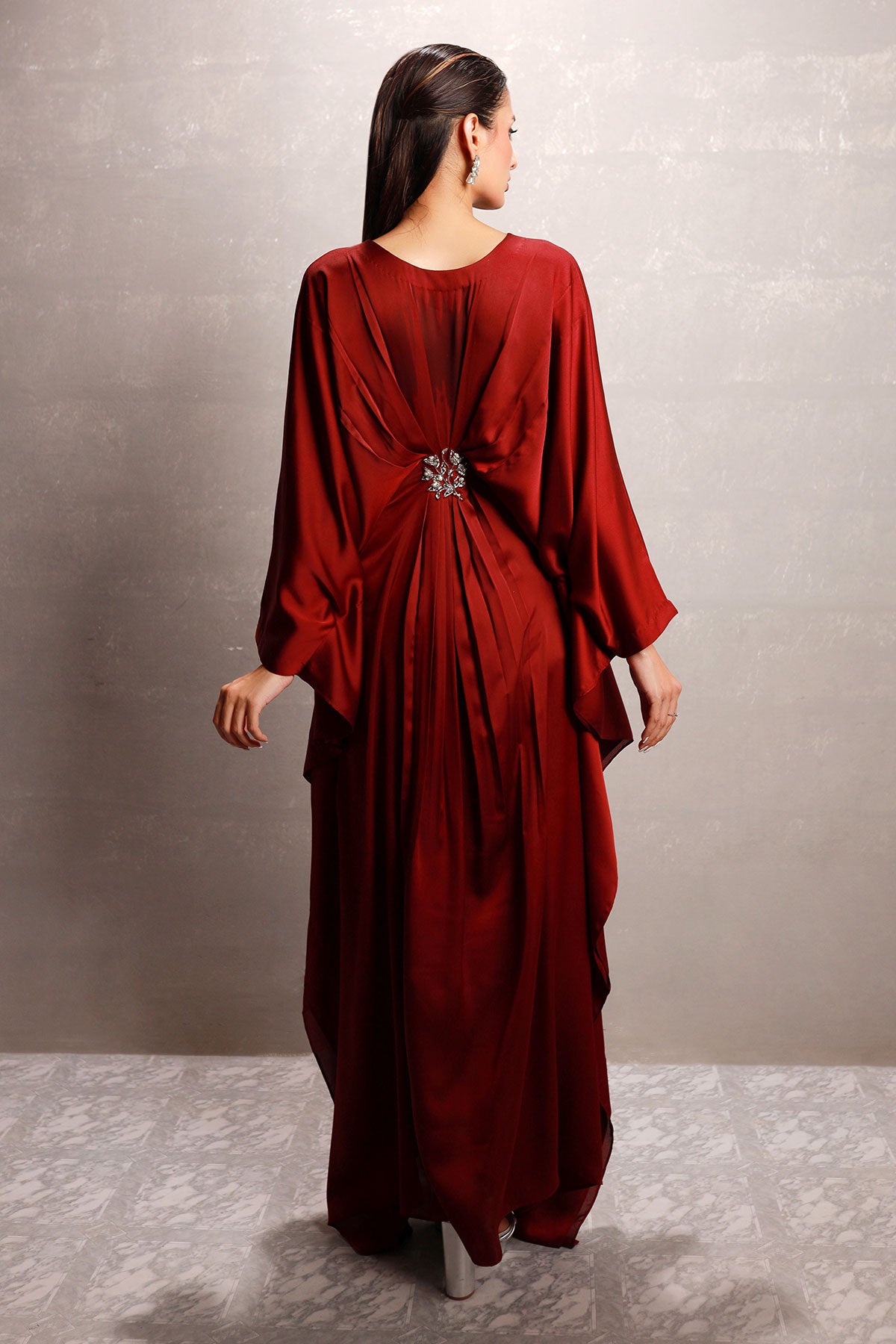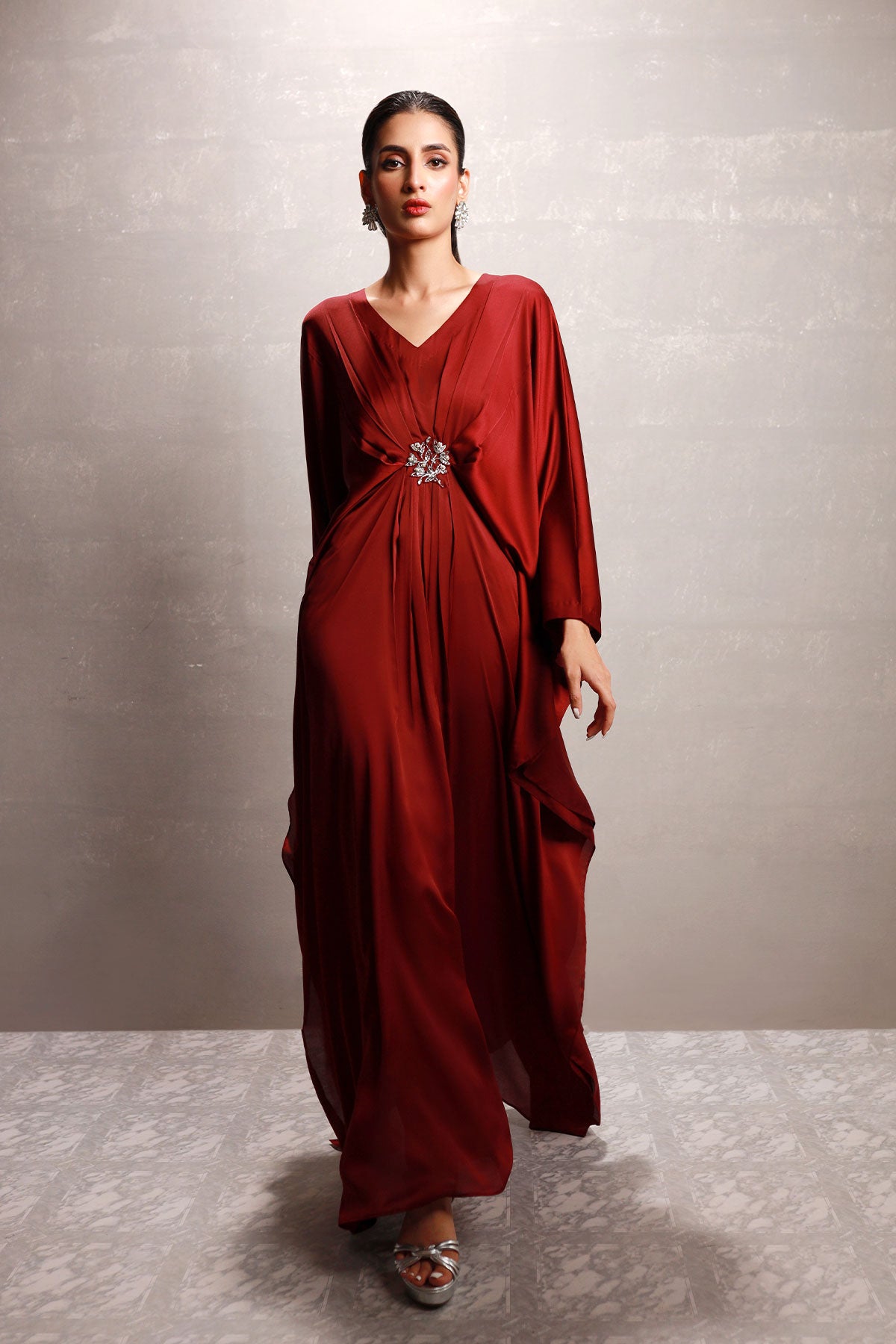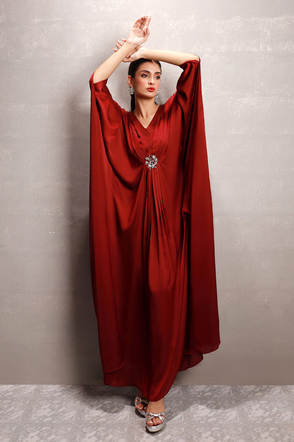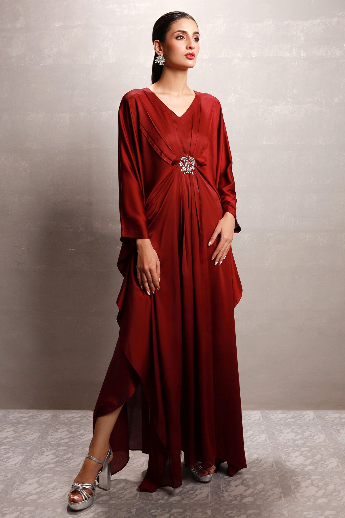 V neckline full length kaftan with a brooches details.