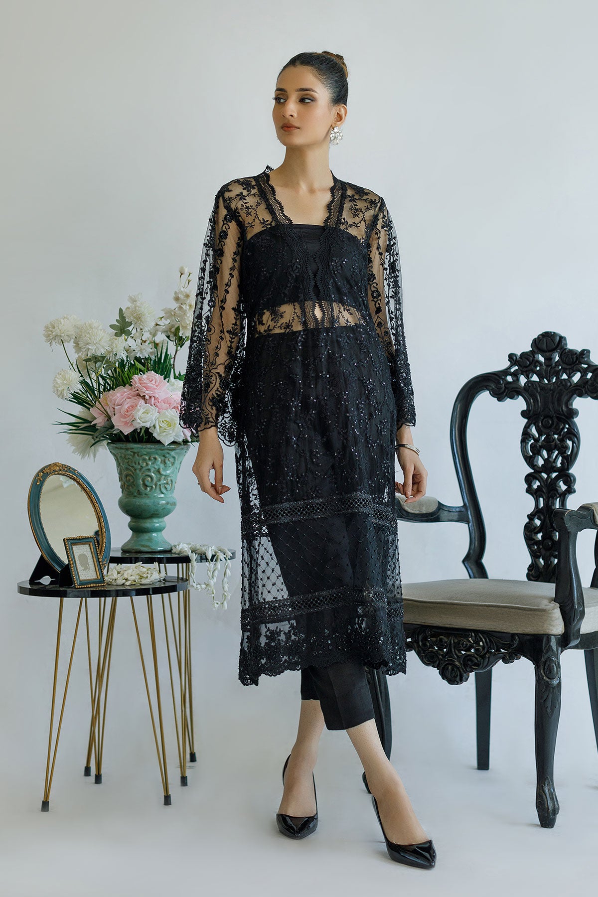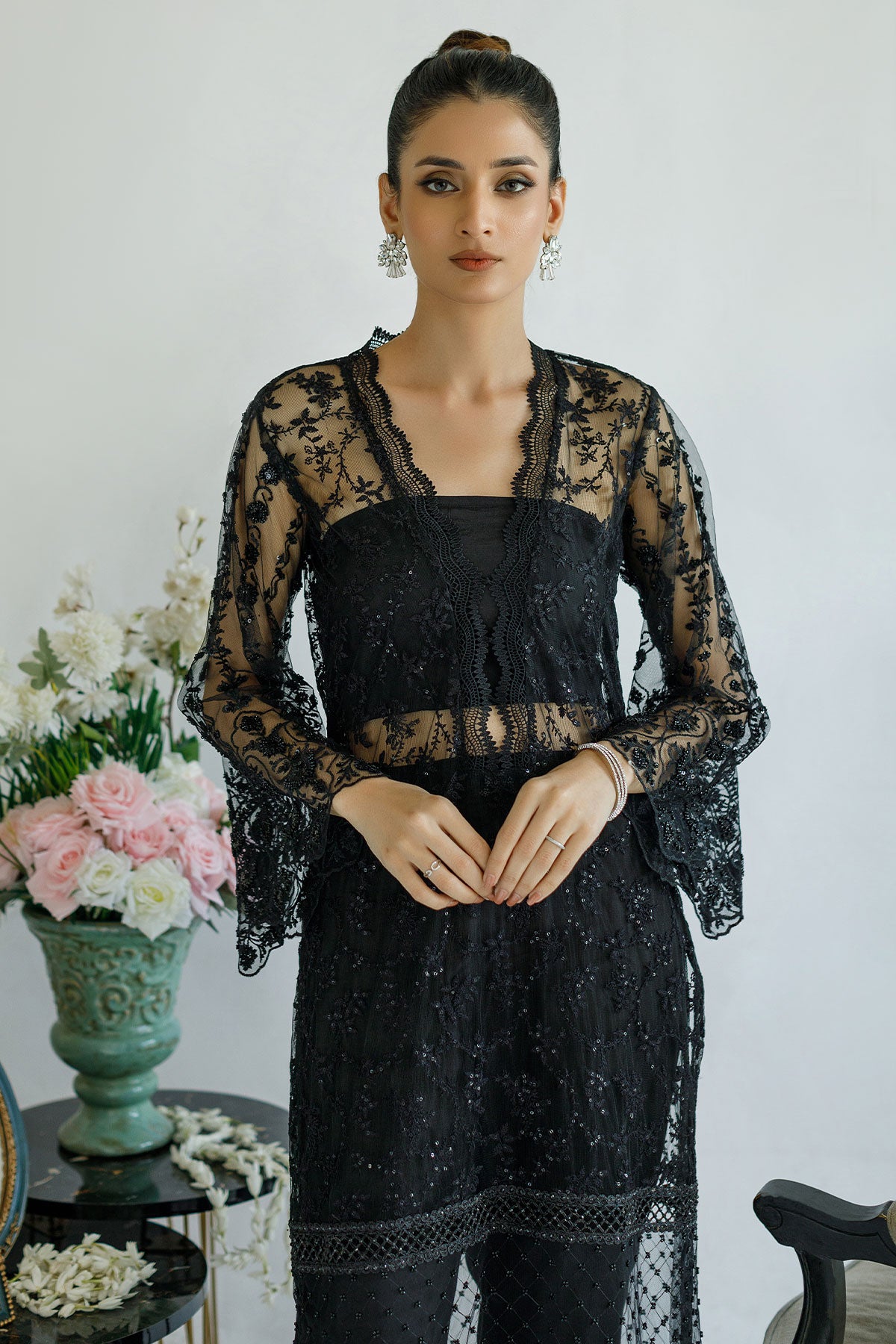 Black Embroidered Net outfit with V neckline and lace details on the border.