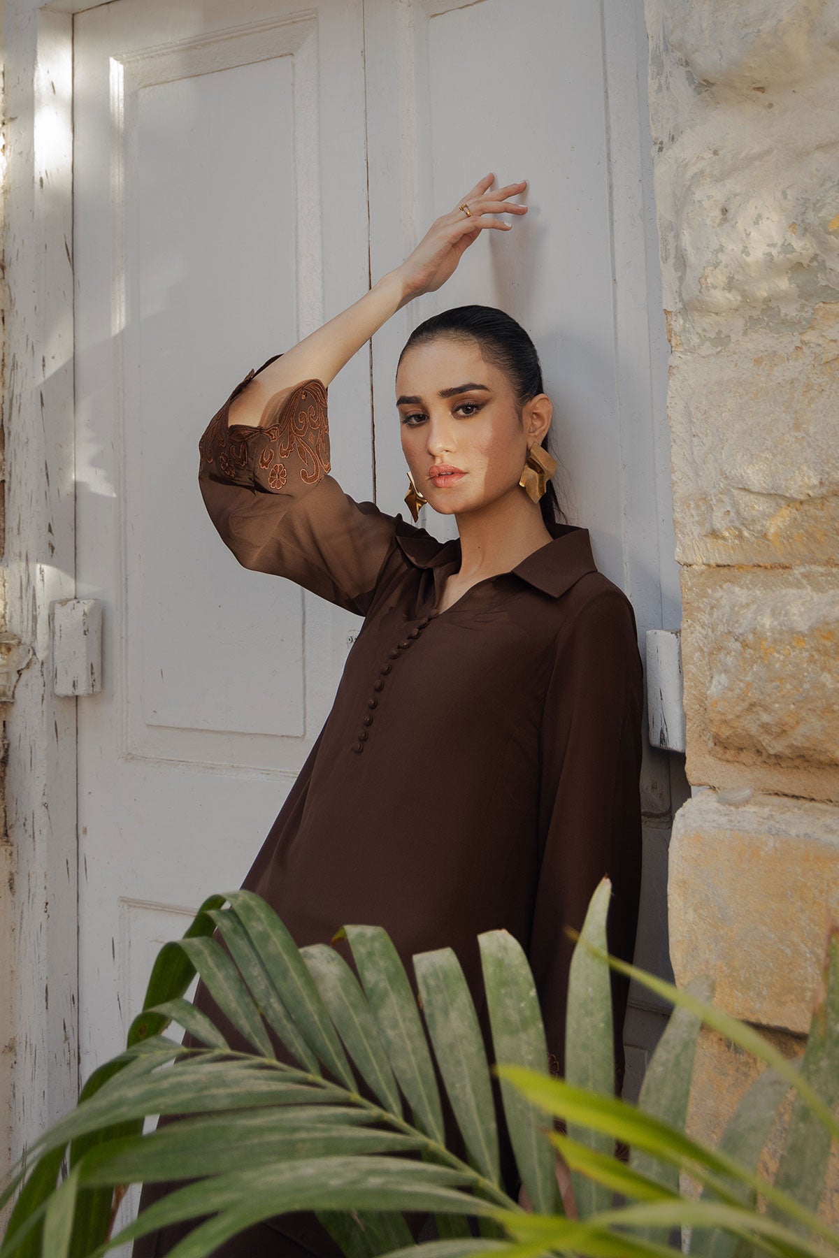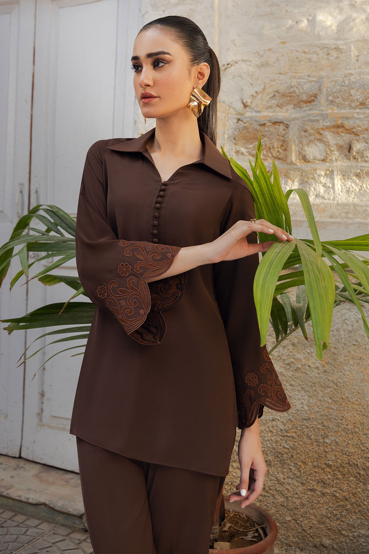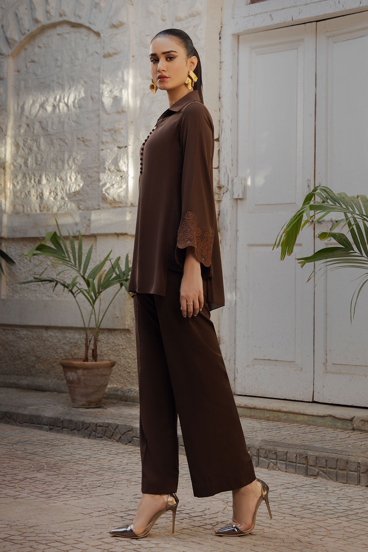 A chic chocolate brown co-ord set featuring intricately designed cutwork sleeves and a collar neckline with loop buttons. Paired effortlessly with straight pants, this ensemble exudes modern sophistication, combining intricate details with a classic silhouette for a stylish and refined look.