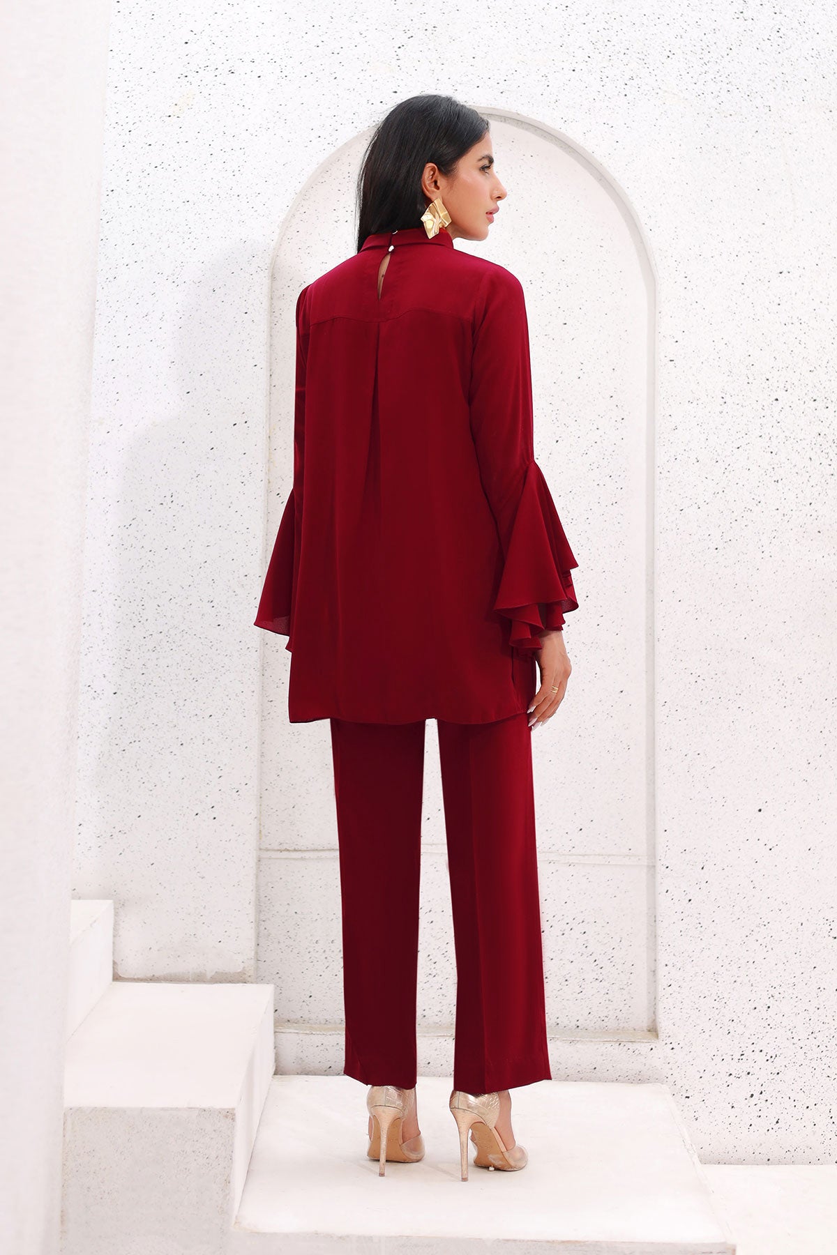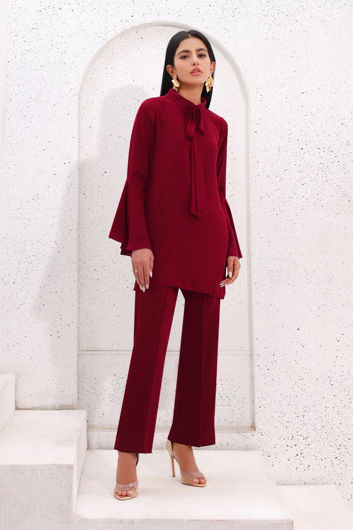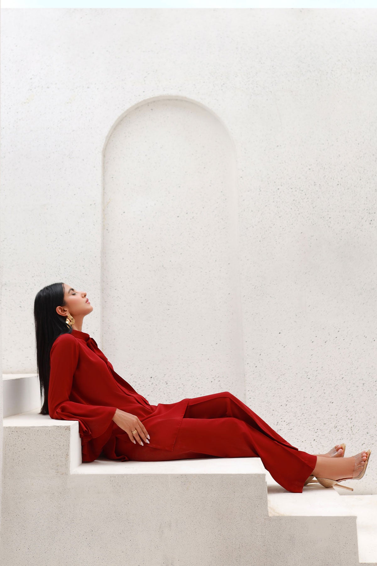 Make a statement in this deep red co-ord set, designed to exude sophistication and style. The top features a classy tie-knot neckline, adding a touch of elegance to the ensemble. With full sleeves boasting an exaggerated silhouette, this outfit effortlessly merges chic and timeless appeal. Paired with sleek straight-cut trousers, it promises a polished yet fashion-forward look that's perfect for any occasion.