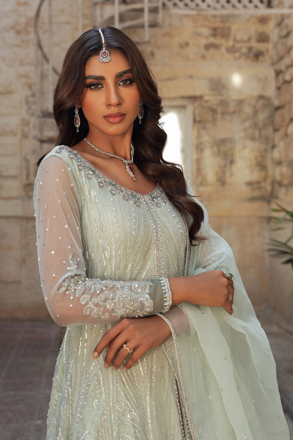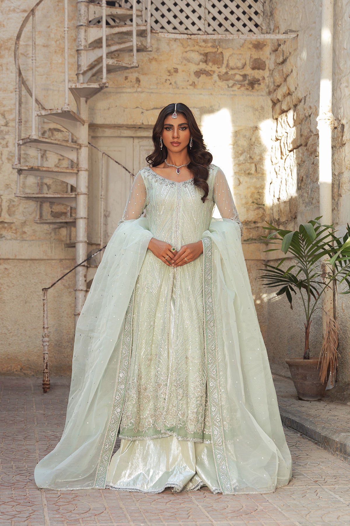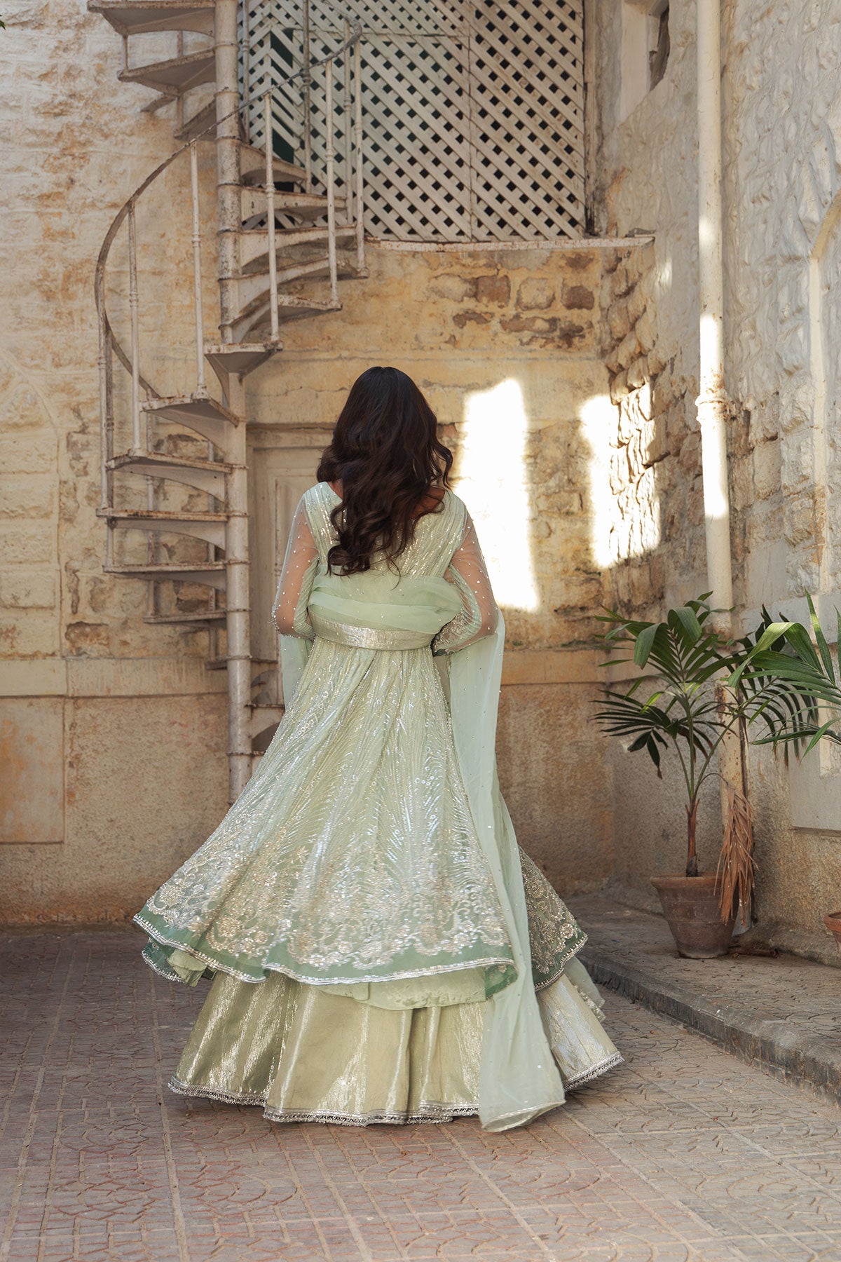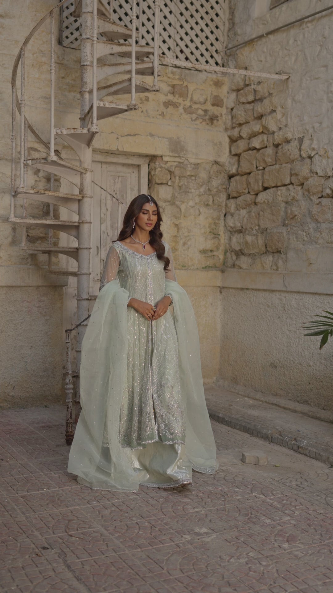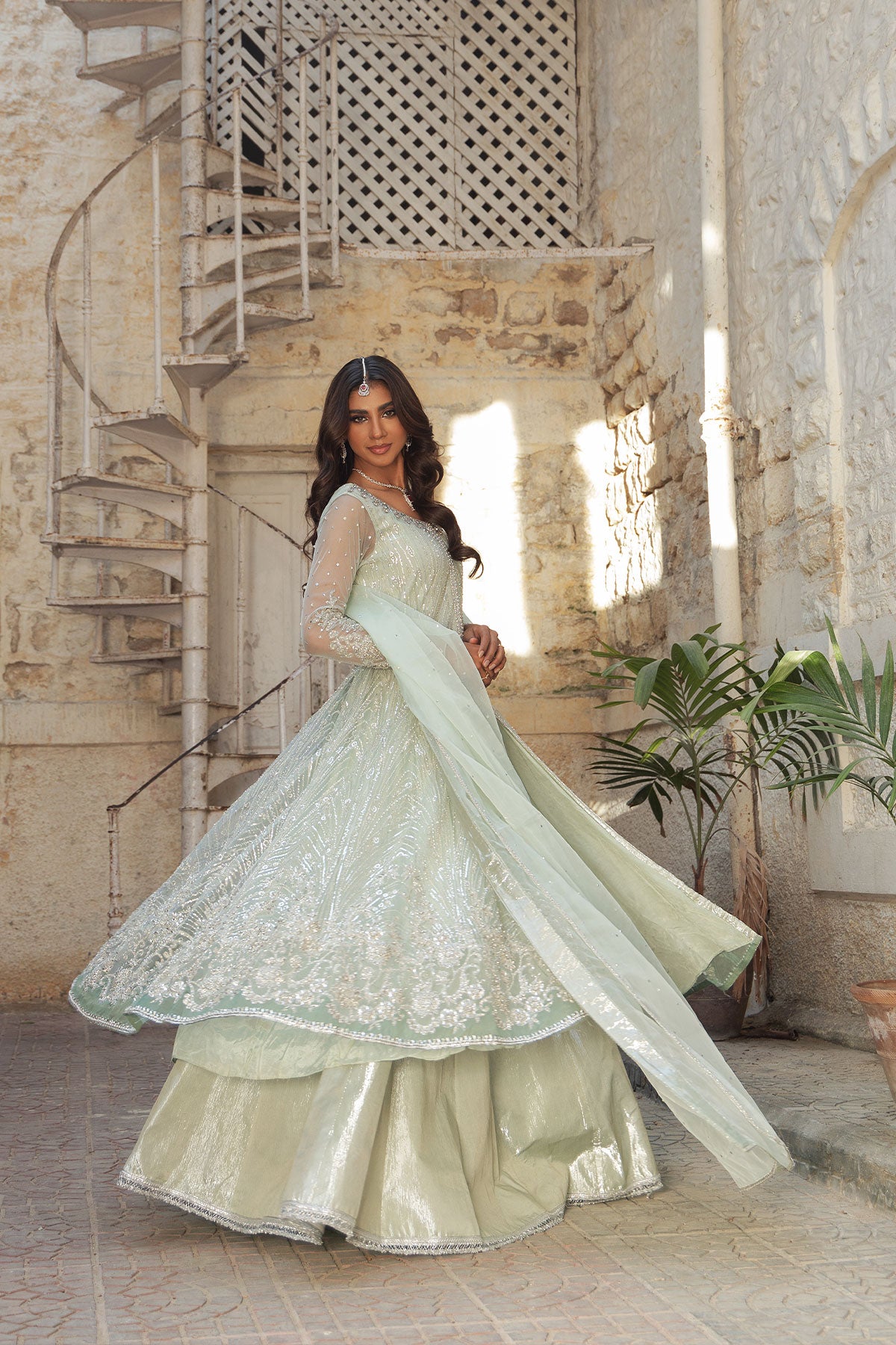 This timeless Bridal outfit featuring front-open shirt in mint green net, adorned with an array of exquisite embellishments. Delicate silver zardozi, Swarovski crystals, sequins, and resham work intertwine to create a masterpiece of artistry, meticulously handcrafted with meticulous attention to detail. Paired effortlessly with a shimmer tissue lehenga and a net dupatta featuring a contrasting matha patti border adorned with sequin spray, this ensemble transcends generations, becoming a cherished heirloom piece destined to be treasured for years to come.