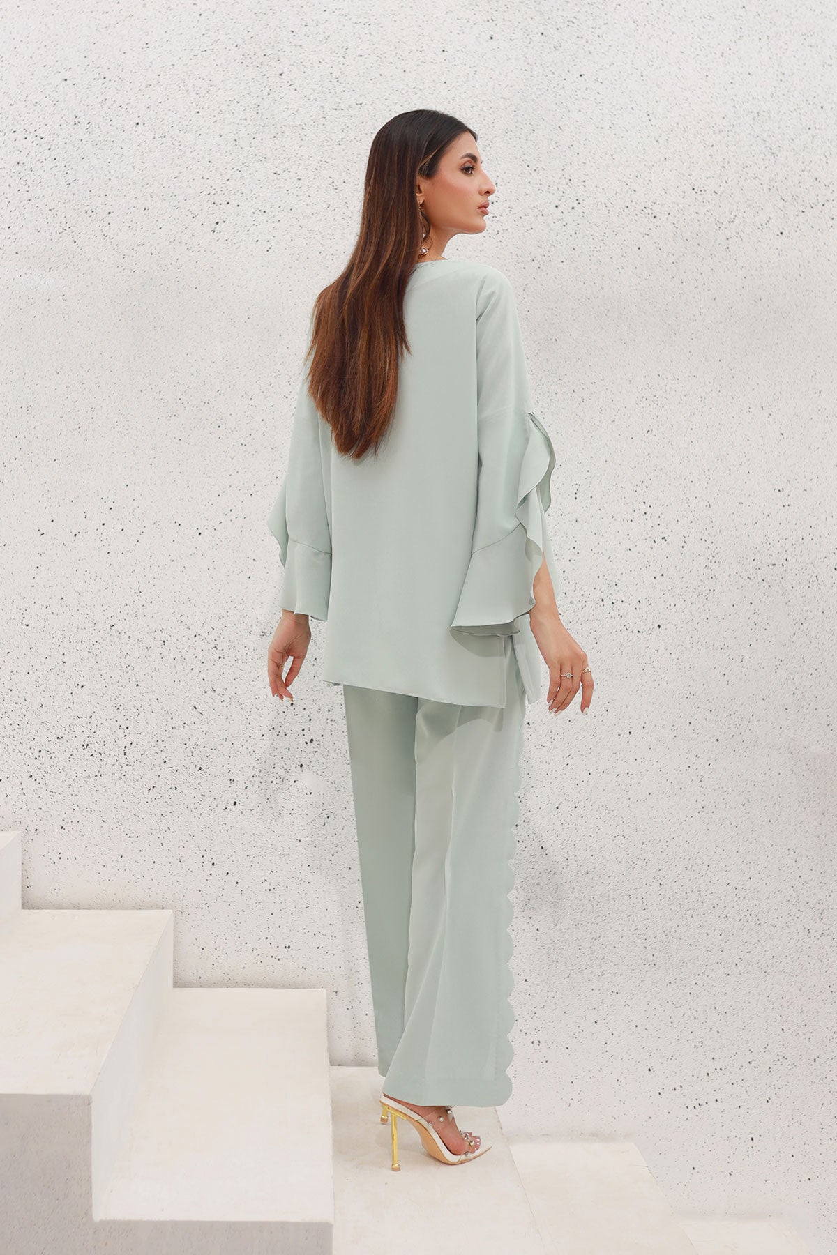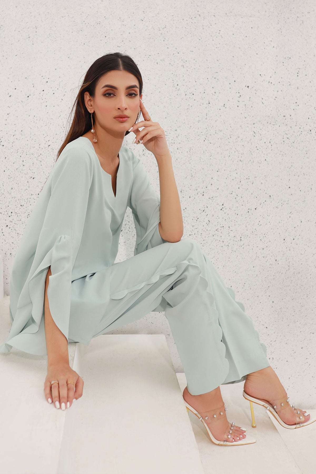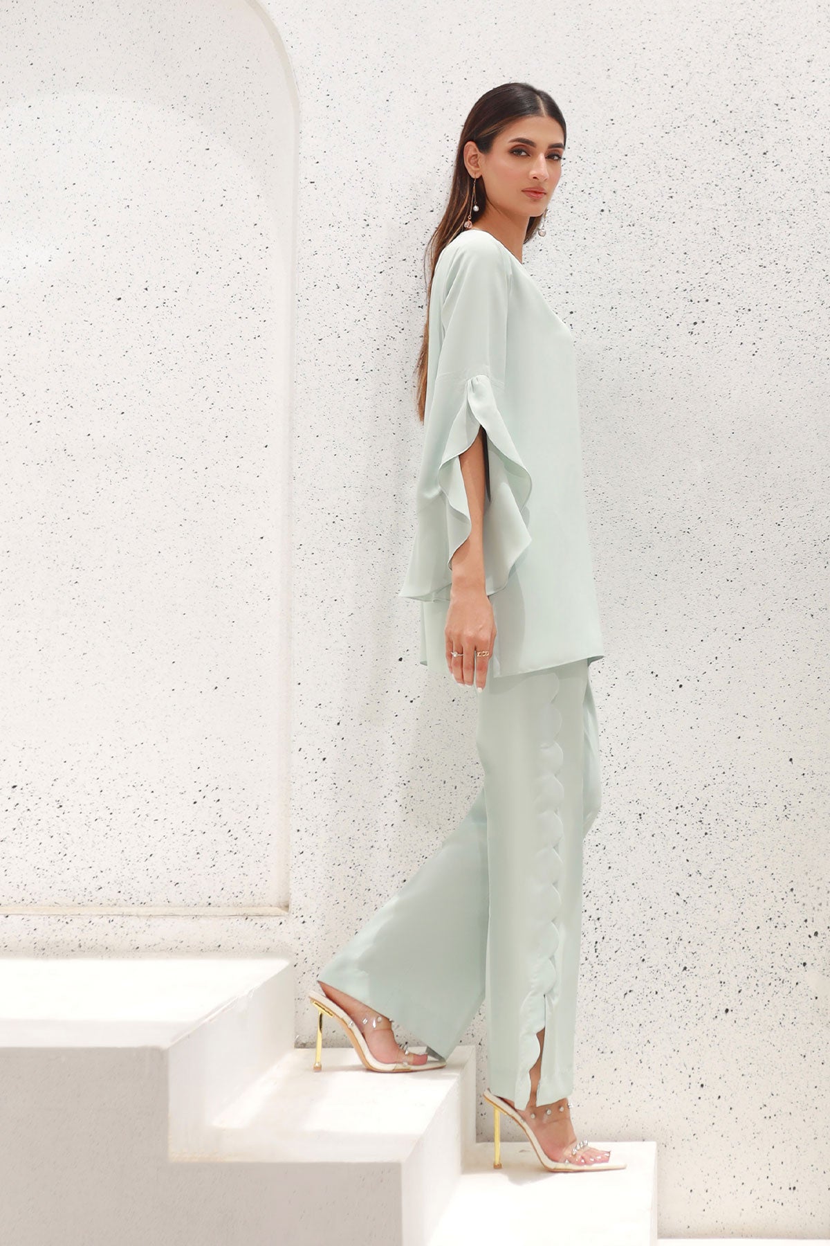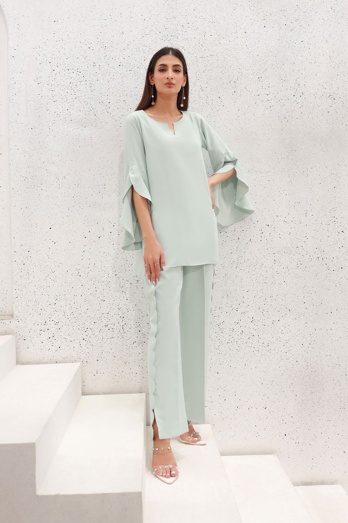 Step into refined style and turn heads with this effortlessly stylish ensemble. The contemporary top steals the spotlight with its enhanced sleeves, adding a touch of drama to your ensemble. Paired impeccably with straight-cut pants, adorned with scalloped details on the sides, this outfit strikes the perfect balance between chic and classy.