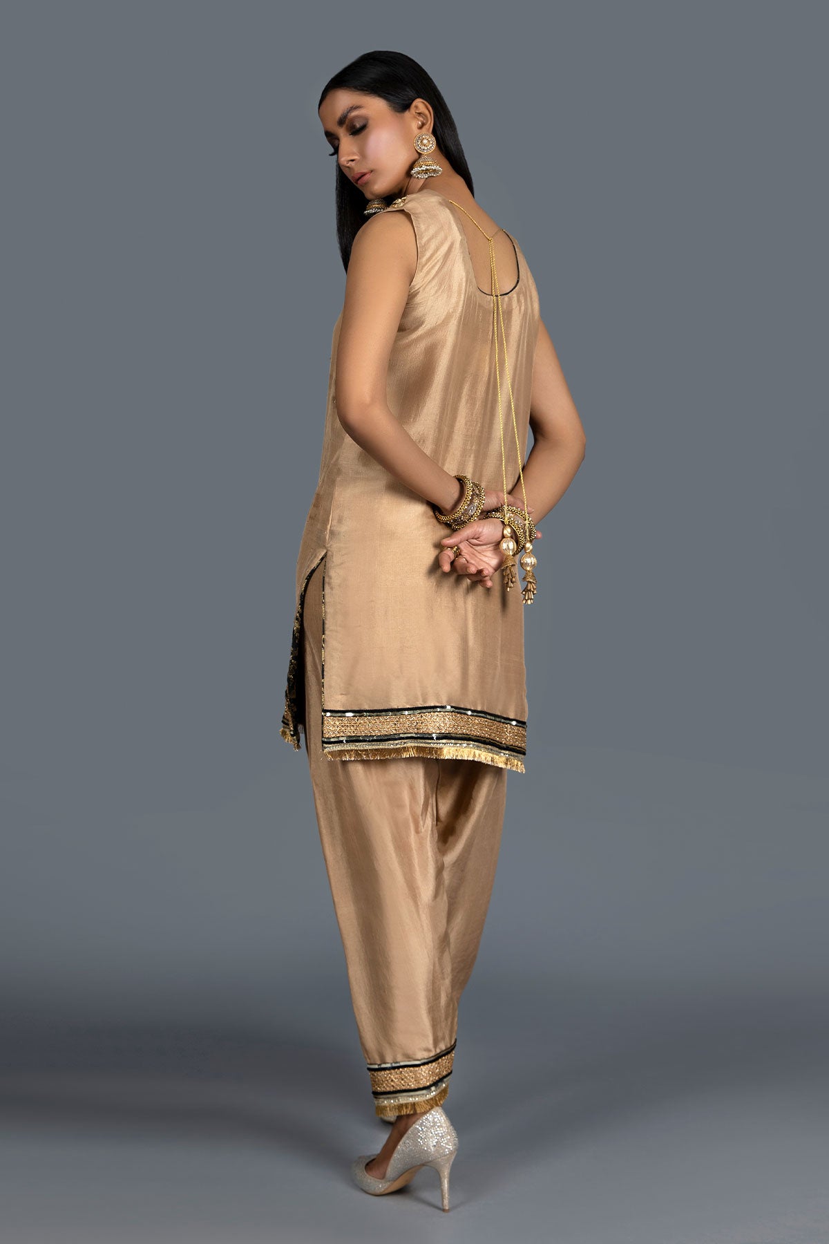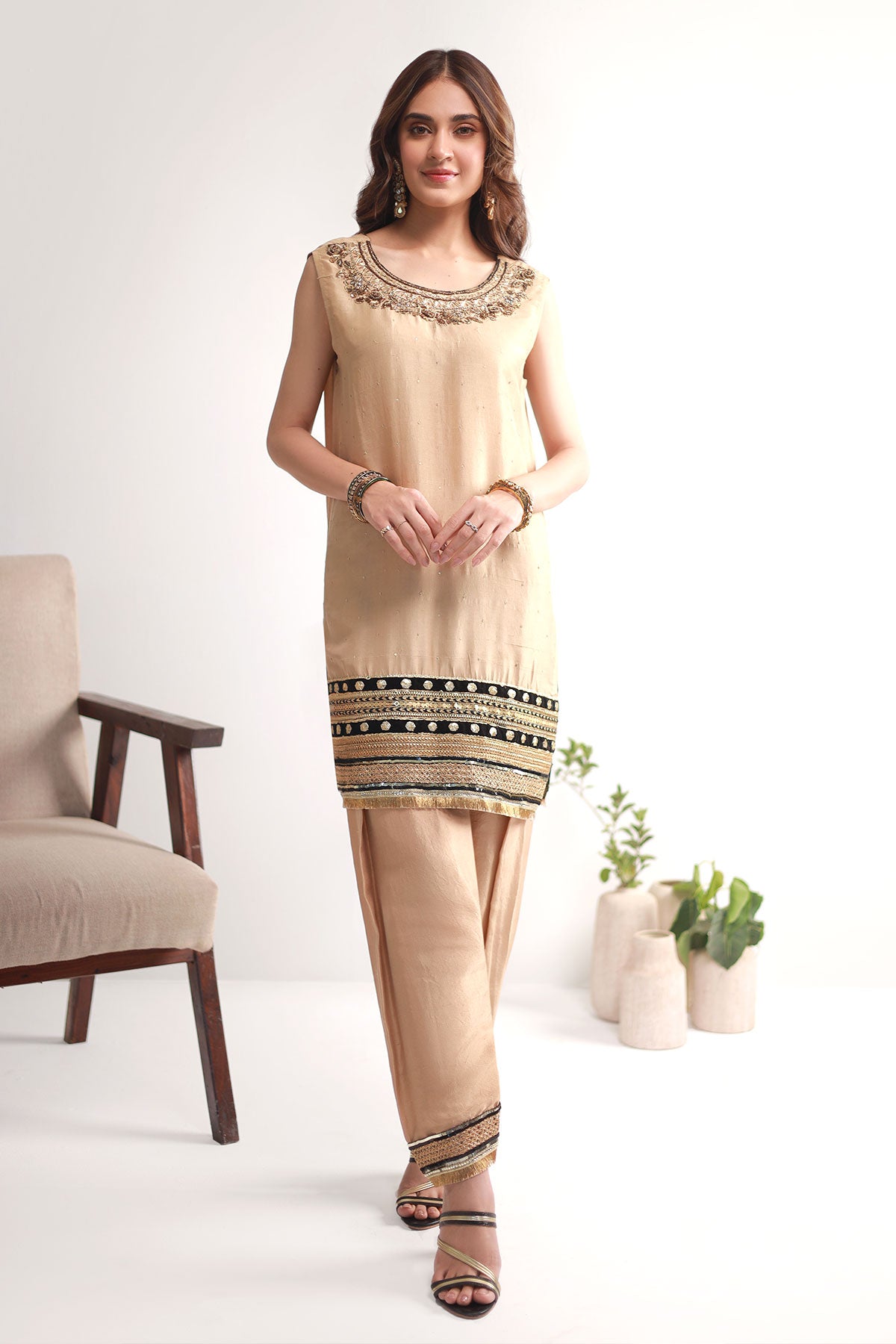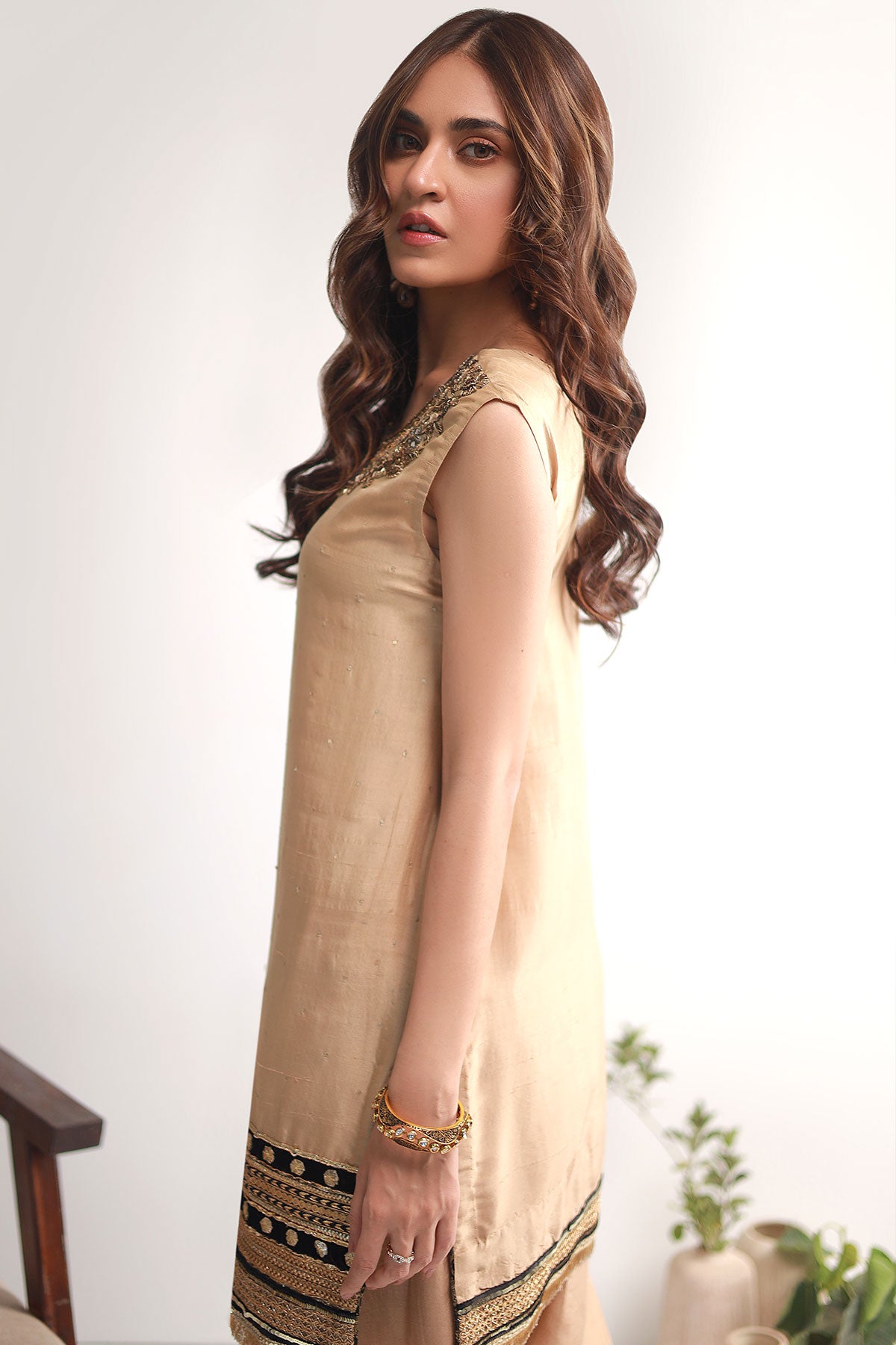 A short shirt featuring delicate neckline and hand embroidered border. It comes with shalwar enhanced.