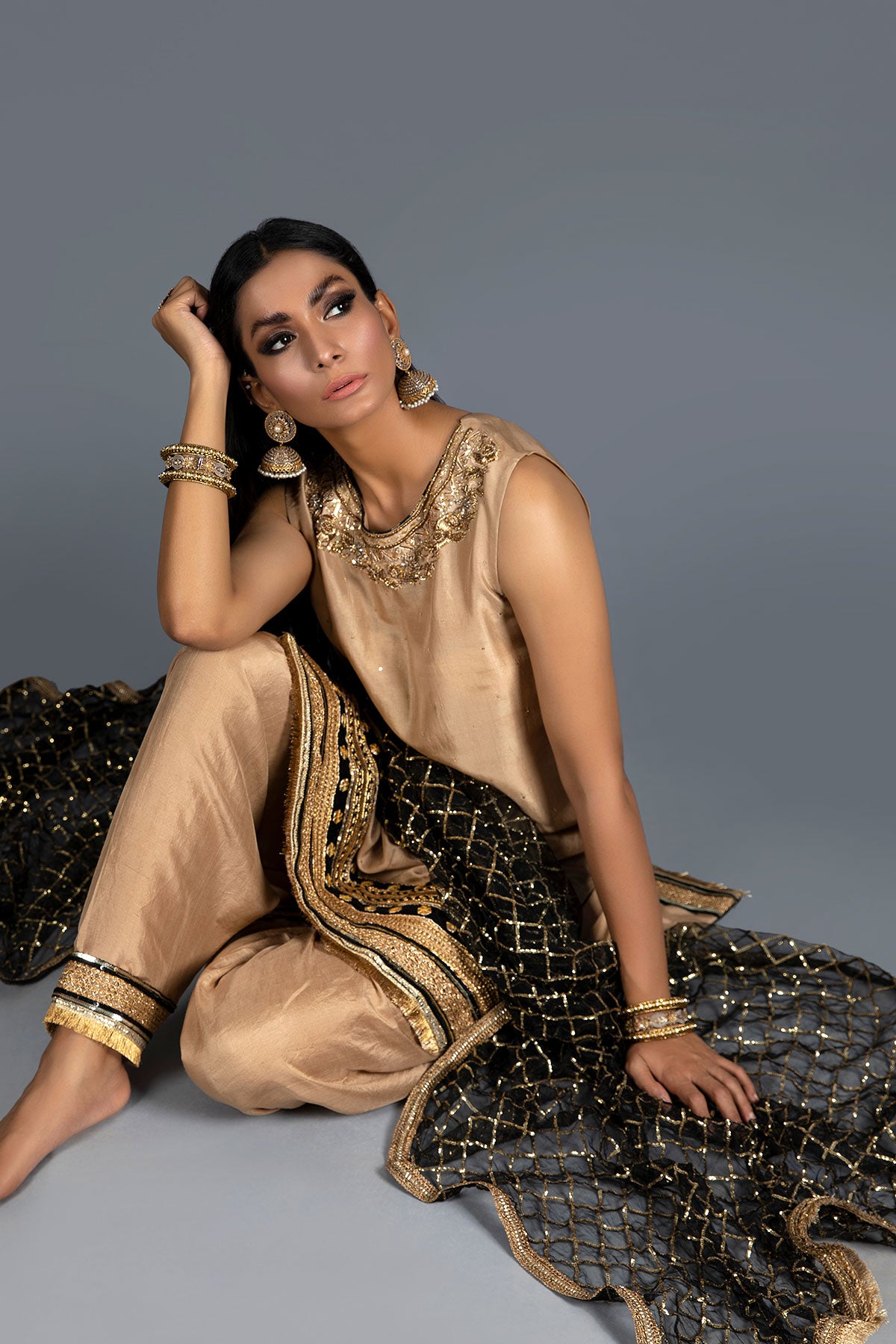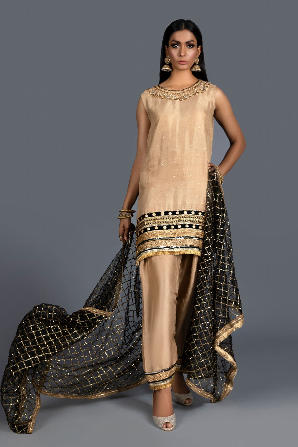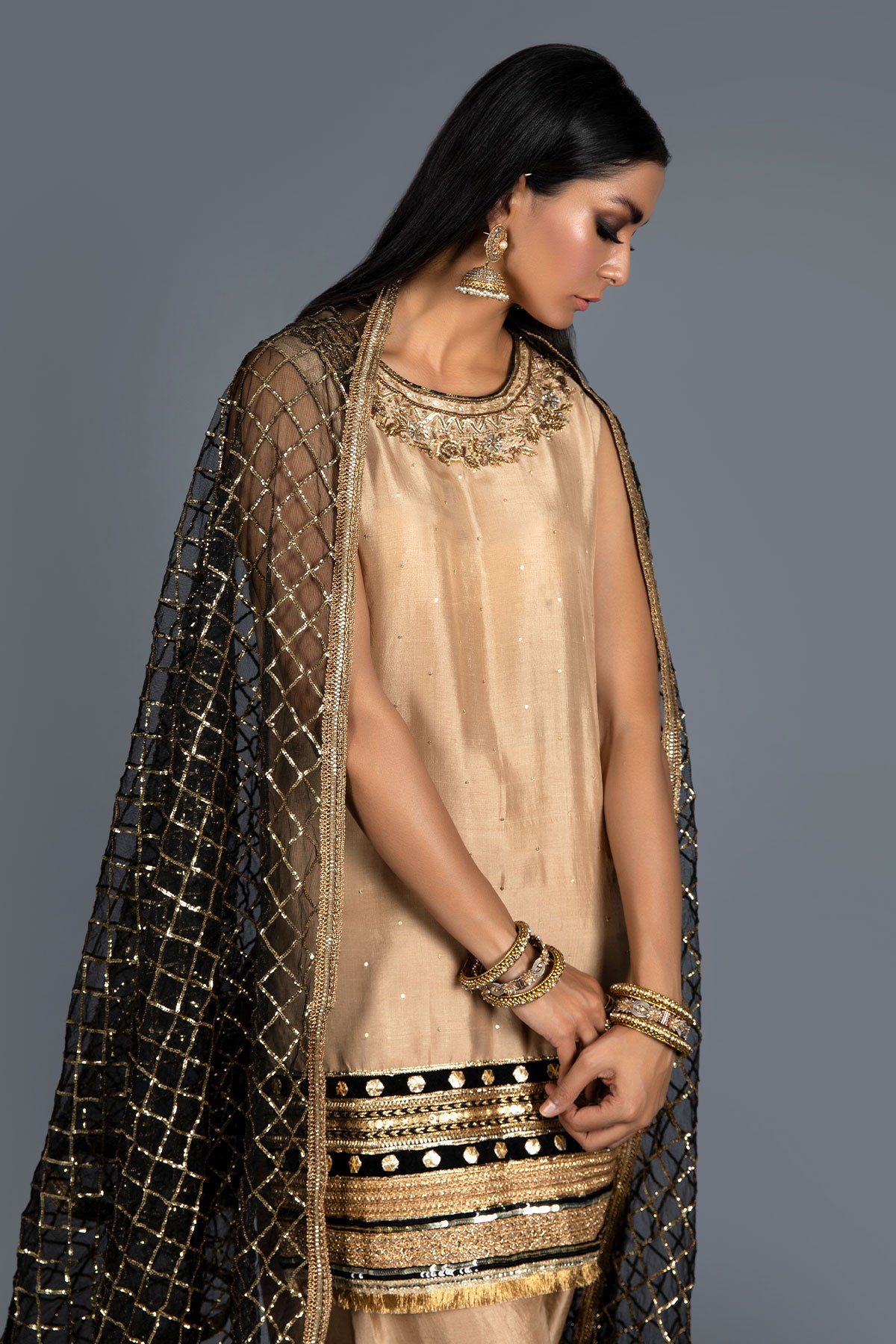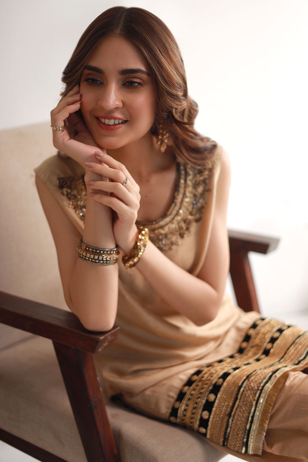 A short shirt featuring delicate neckline and hand embroidered border. It comes with shalwar enhanced.