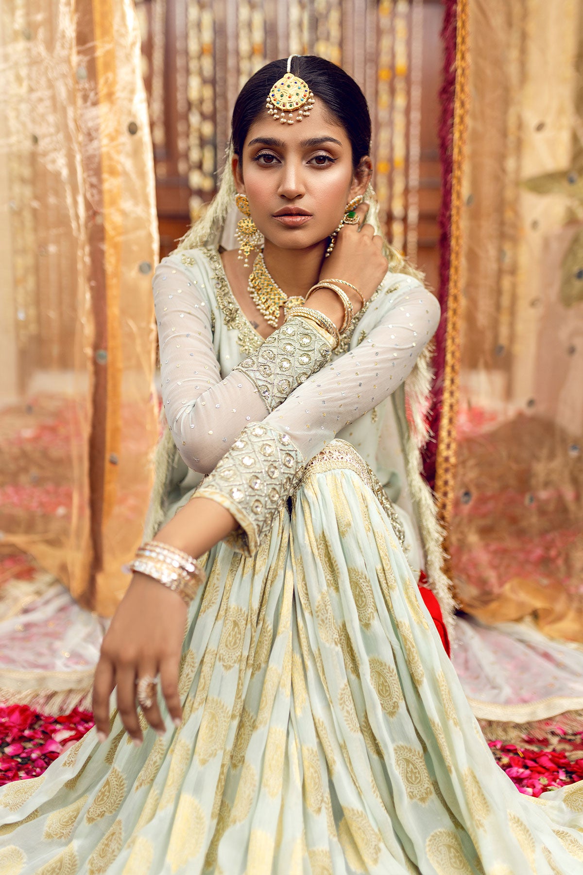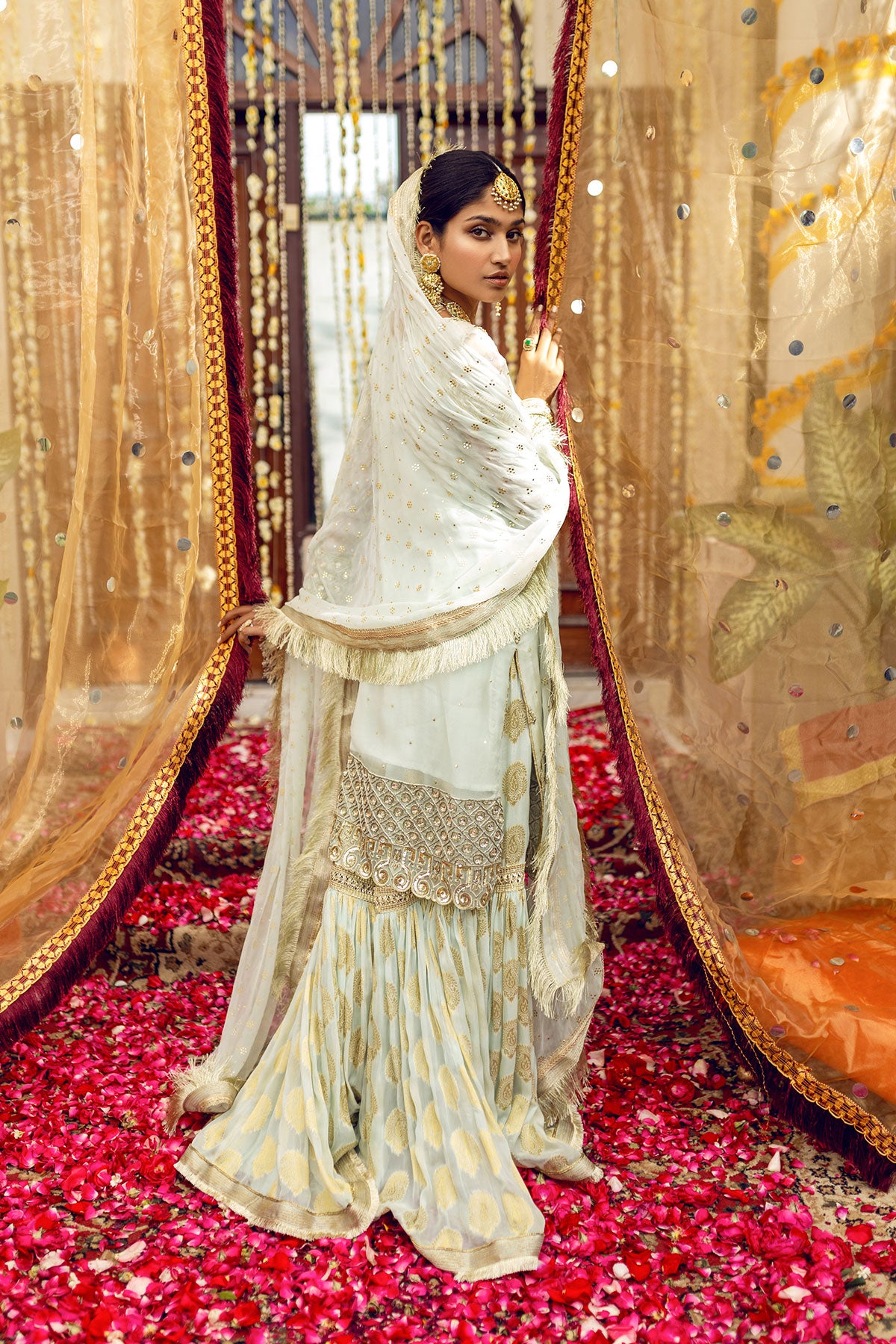 This show stealer outfit is a perfect ensemble for a nikah bride featuring traditional gharara style on banarsi Chiffon fabric with gotta and tilla details on it.
