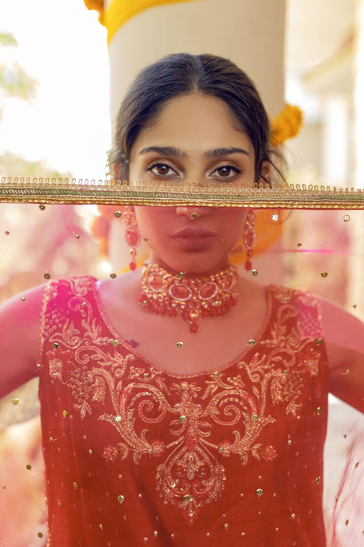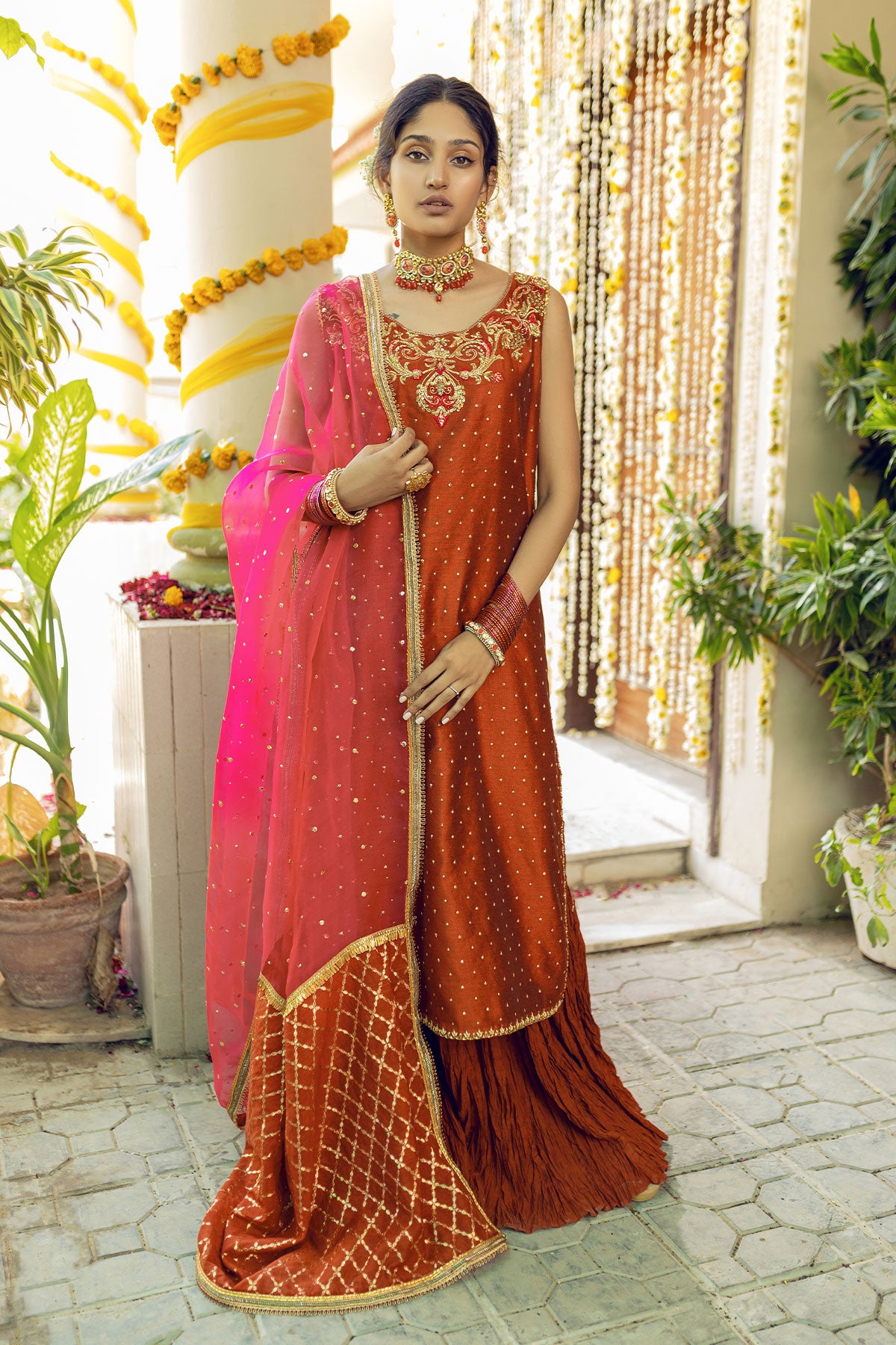 A gorgeous long shirt with zardozi detailed neckline with contrasting pink resham work and sequins sprayed all over along with embroidered framed border. Paired up with crush Lehnga and contrasting hot pink Dupatta.