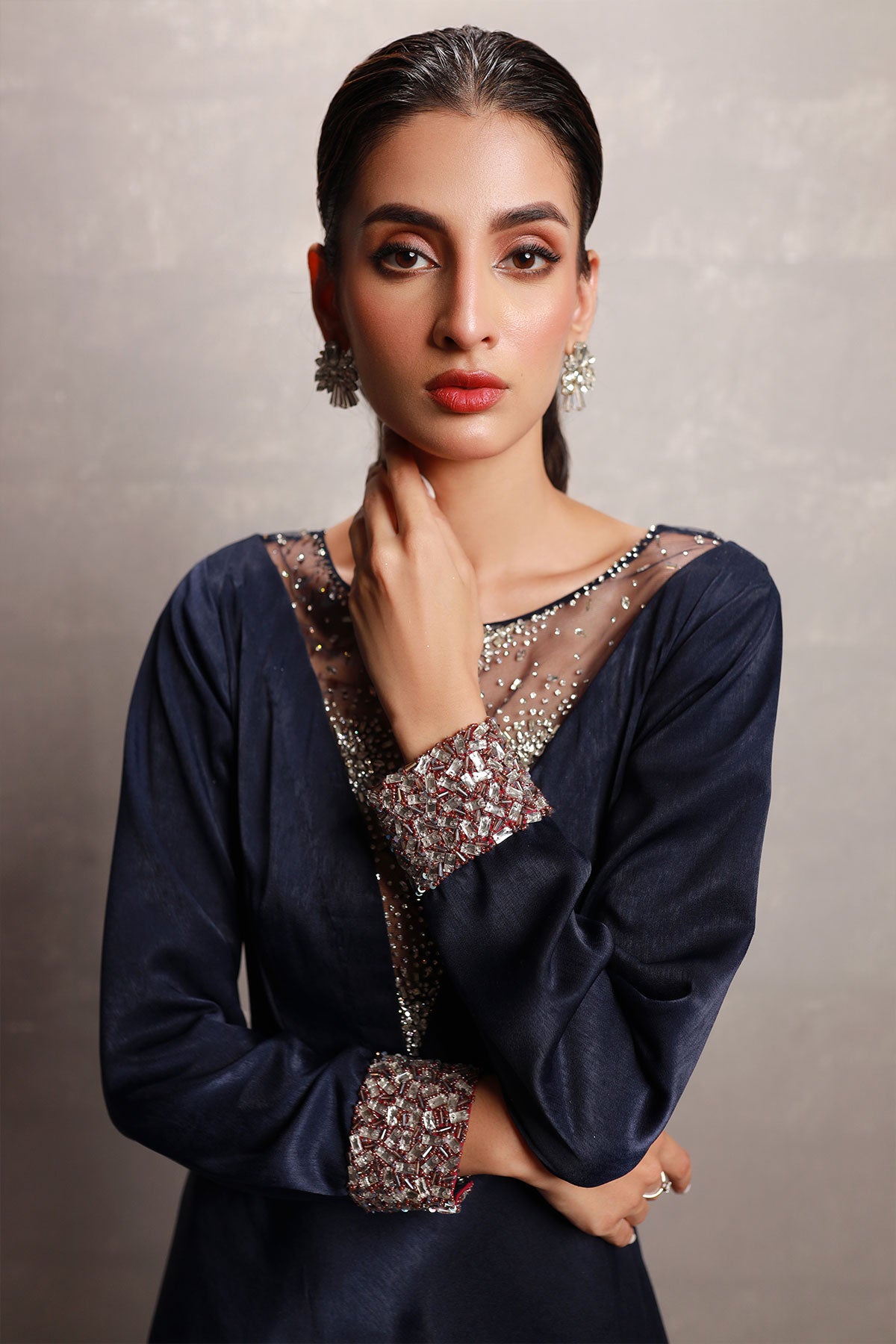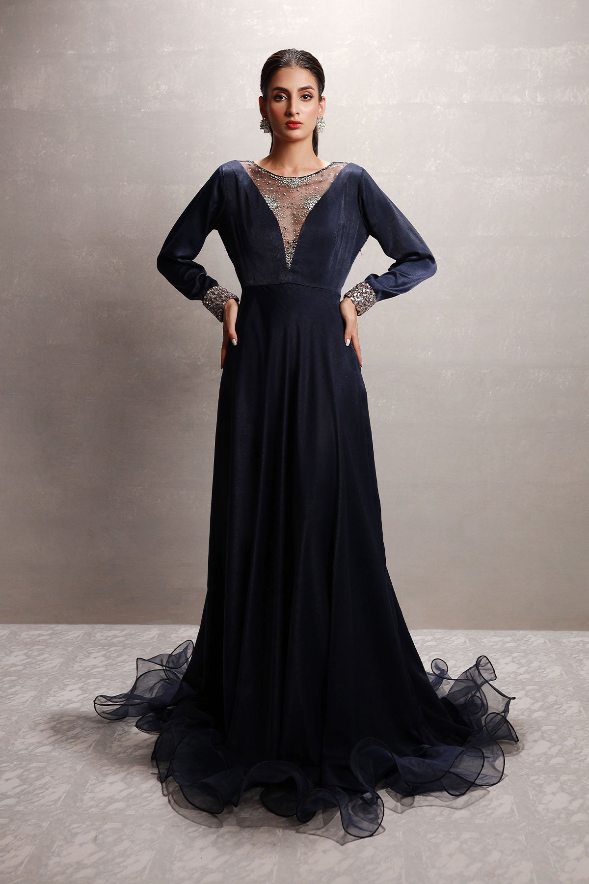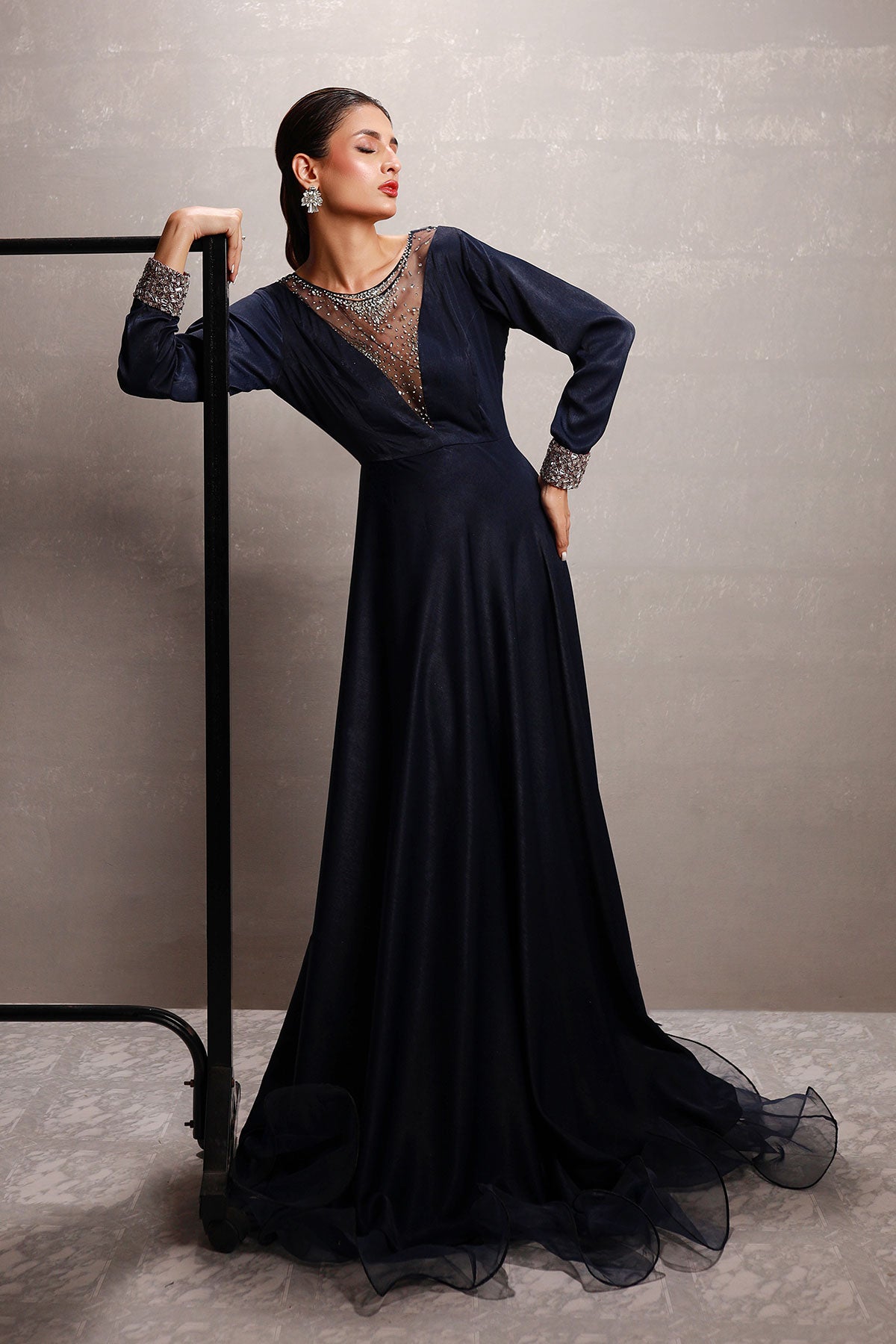 Navy Blue Embellished Dress with full sleeves. V Neckline with mesh and stone details. Full sleeves with stone details.