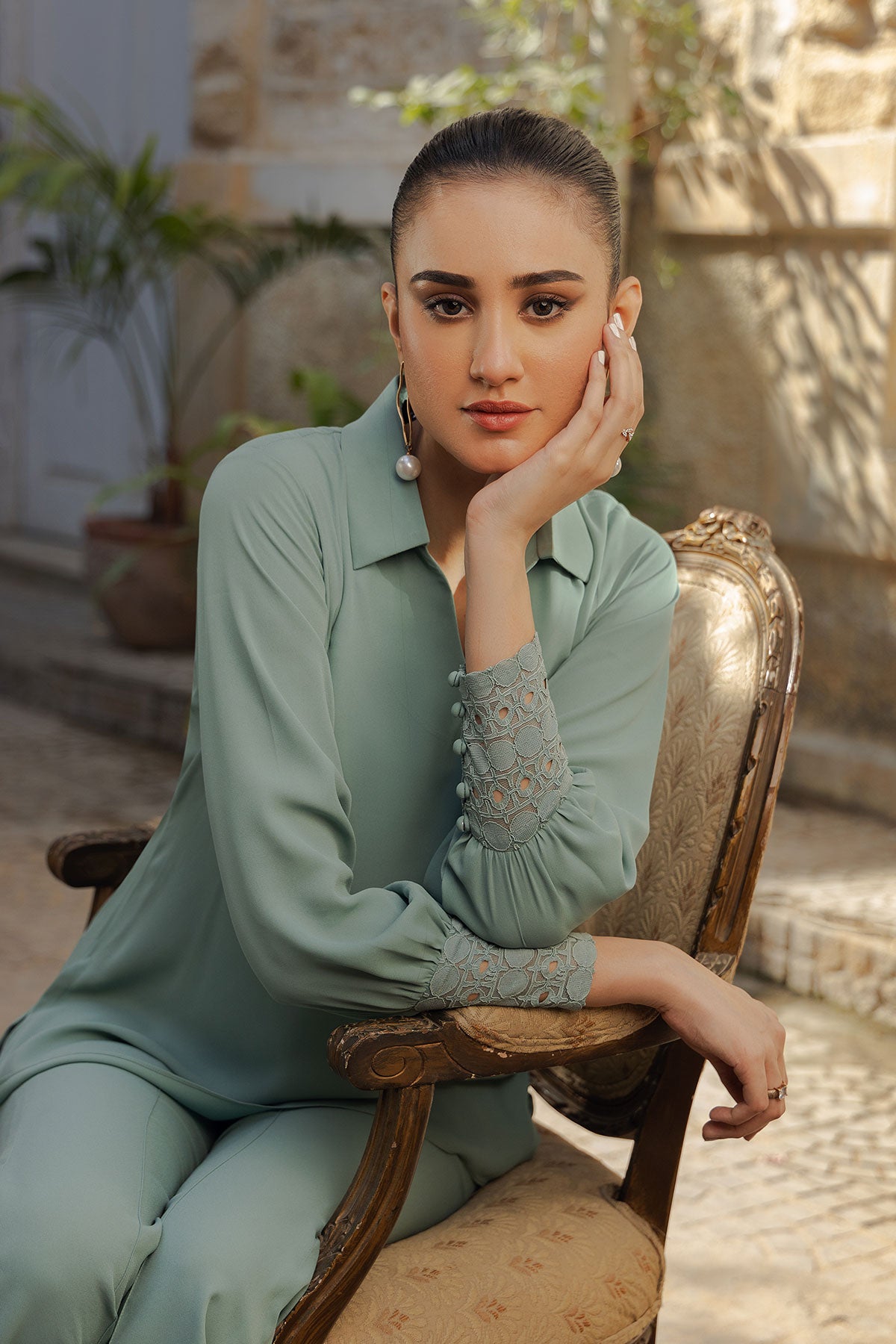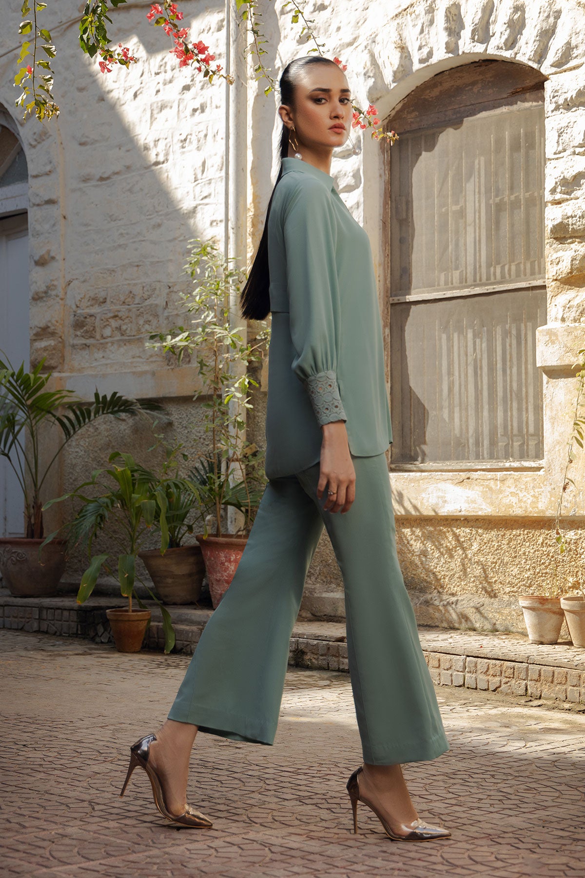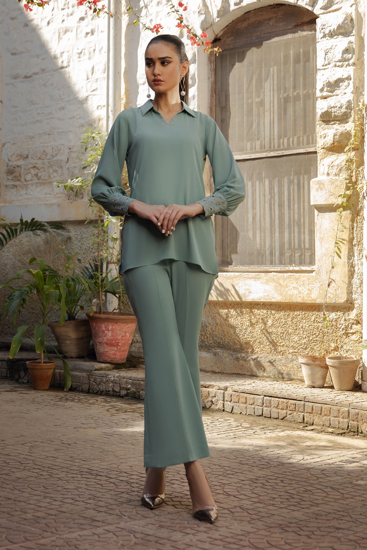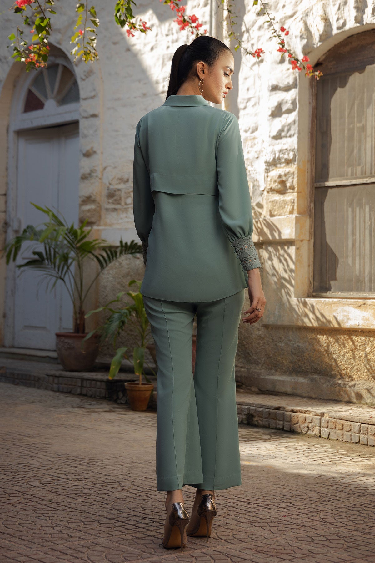 A sophisticated dark mint co-ord set: featuring collar neckline with cuff sleeves adorned with lace fabric and loop buttons adding a touch of elegance. Paired seamlessly with Ponte pants showcasing a stylish front seam, this ensemble combines chic design elements for a modern and refined look.