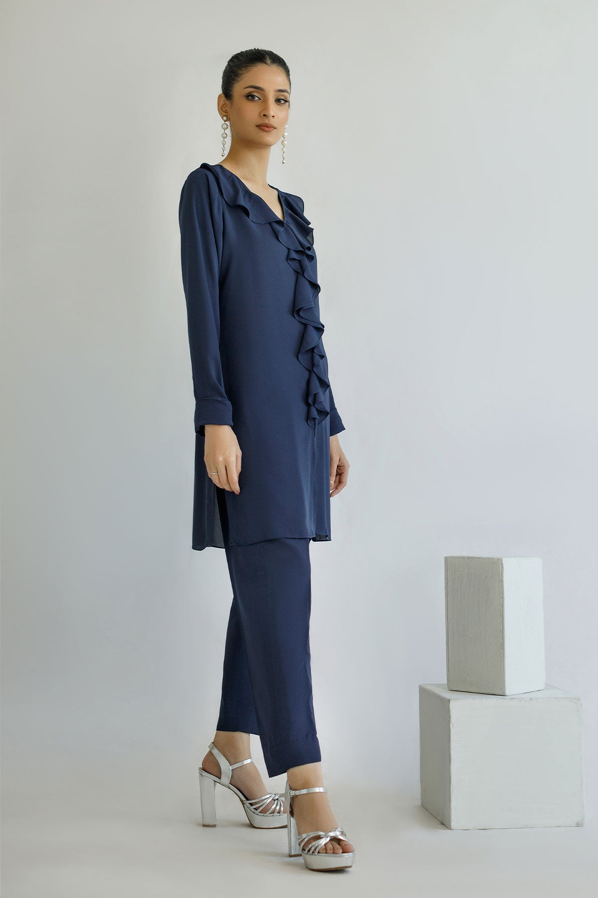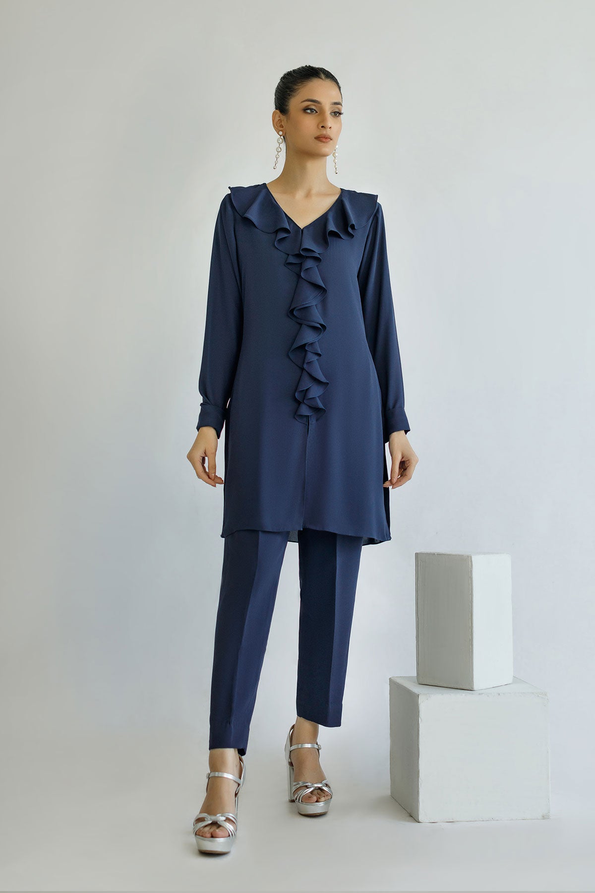 A Navy Blue co-ord set featuring intricately cascade neckline and full fitted sleeves. Paired effortlessly with straight pants, this ensemble exudes modern sophistication.