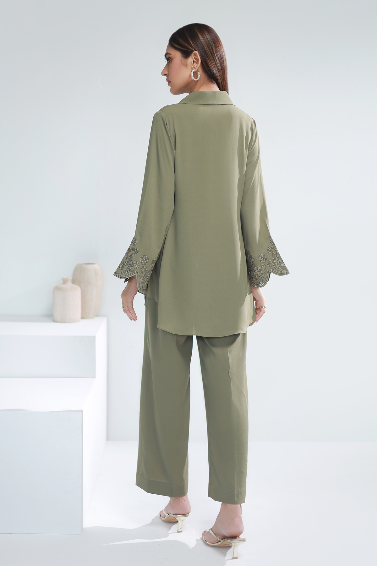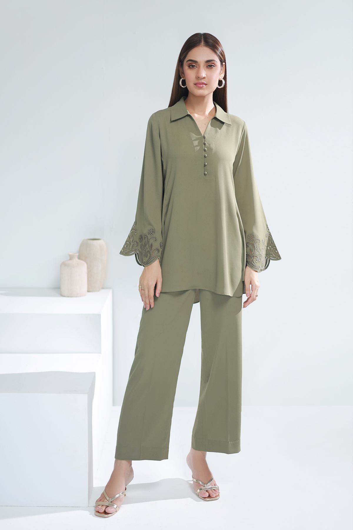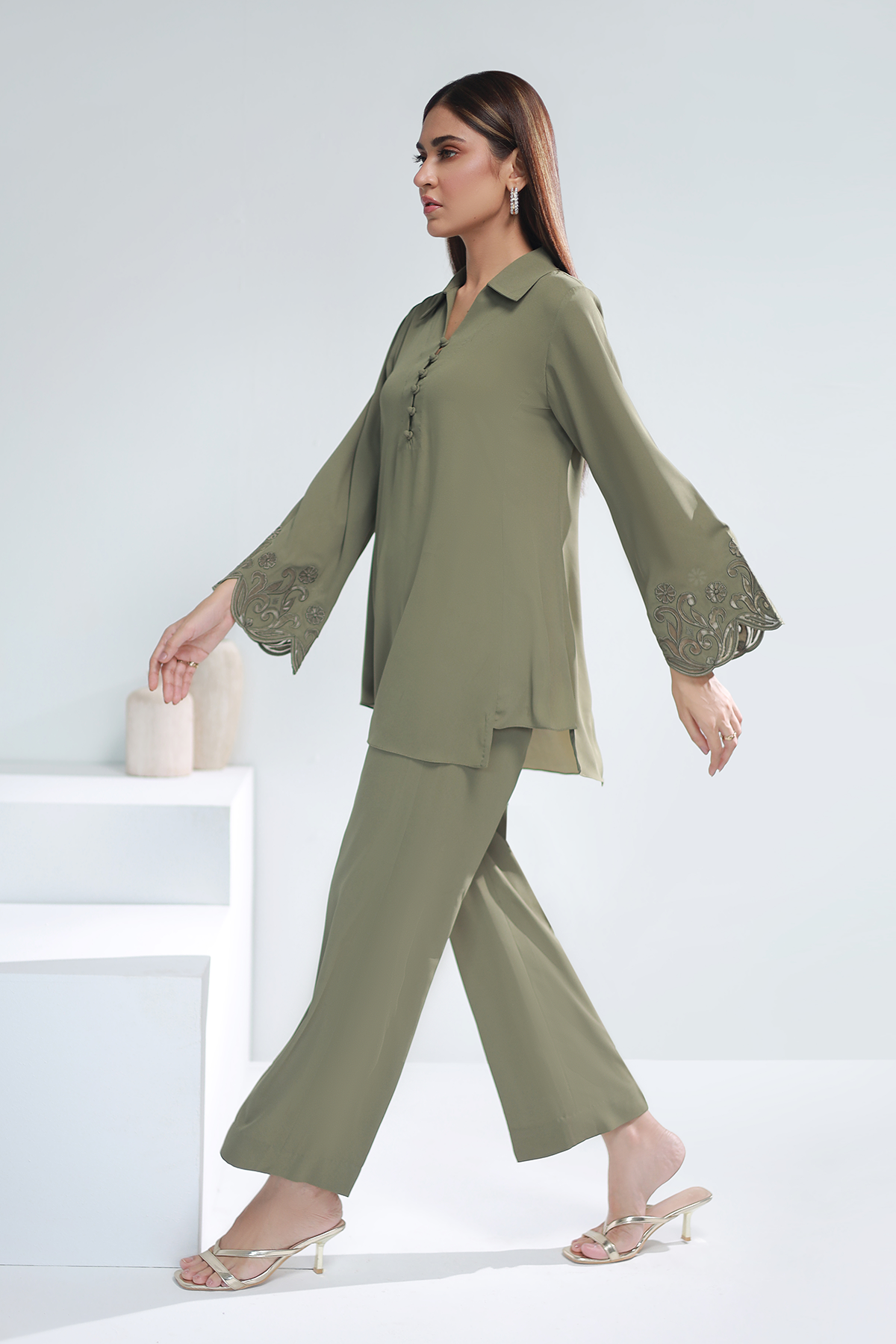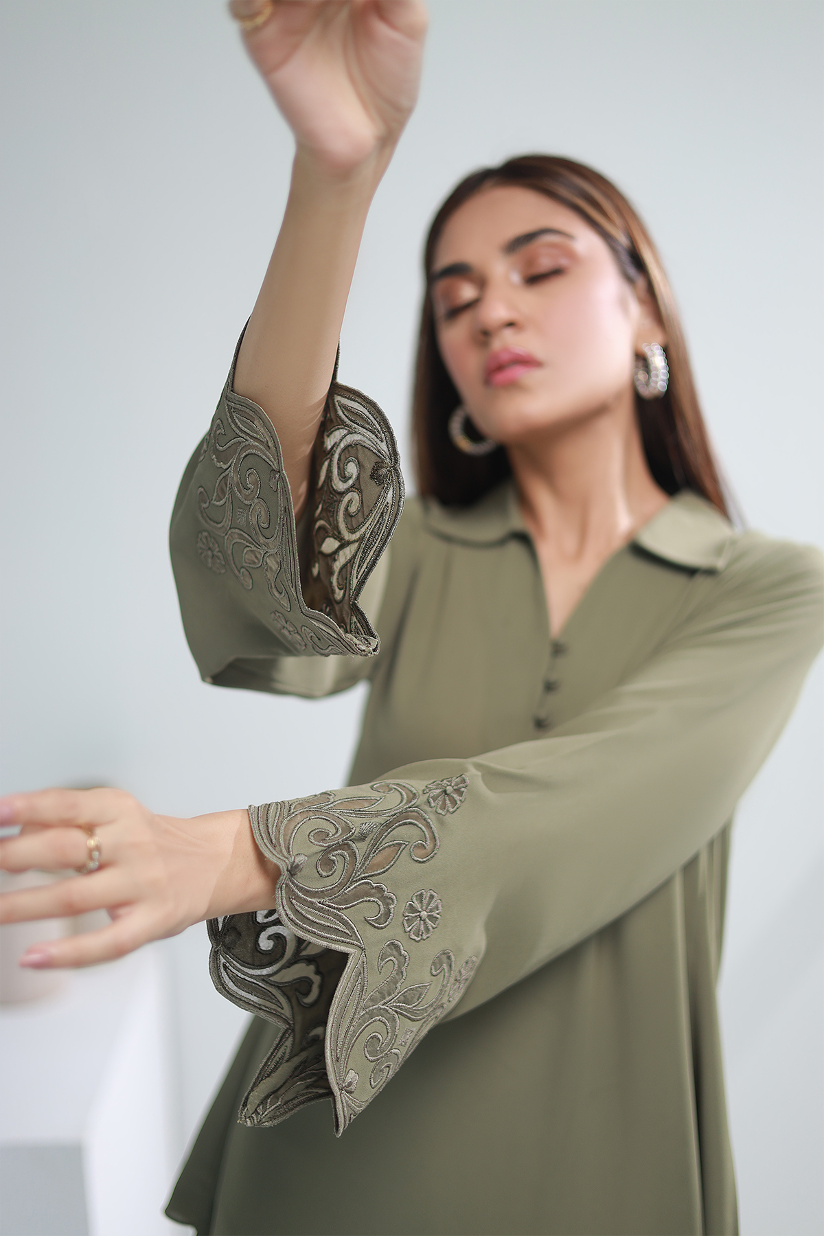A chic olive green co-ord set featuring intricately designed cutwork sleeves and a collar neckline with loop buttons. Paired effortlessly with straight pants, this ensemble exudes modern sophistication, combining intricate details with a classic silhouette for a stylish and refined look.