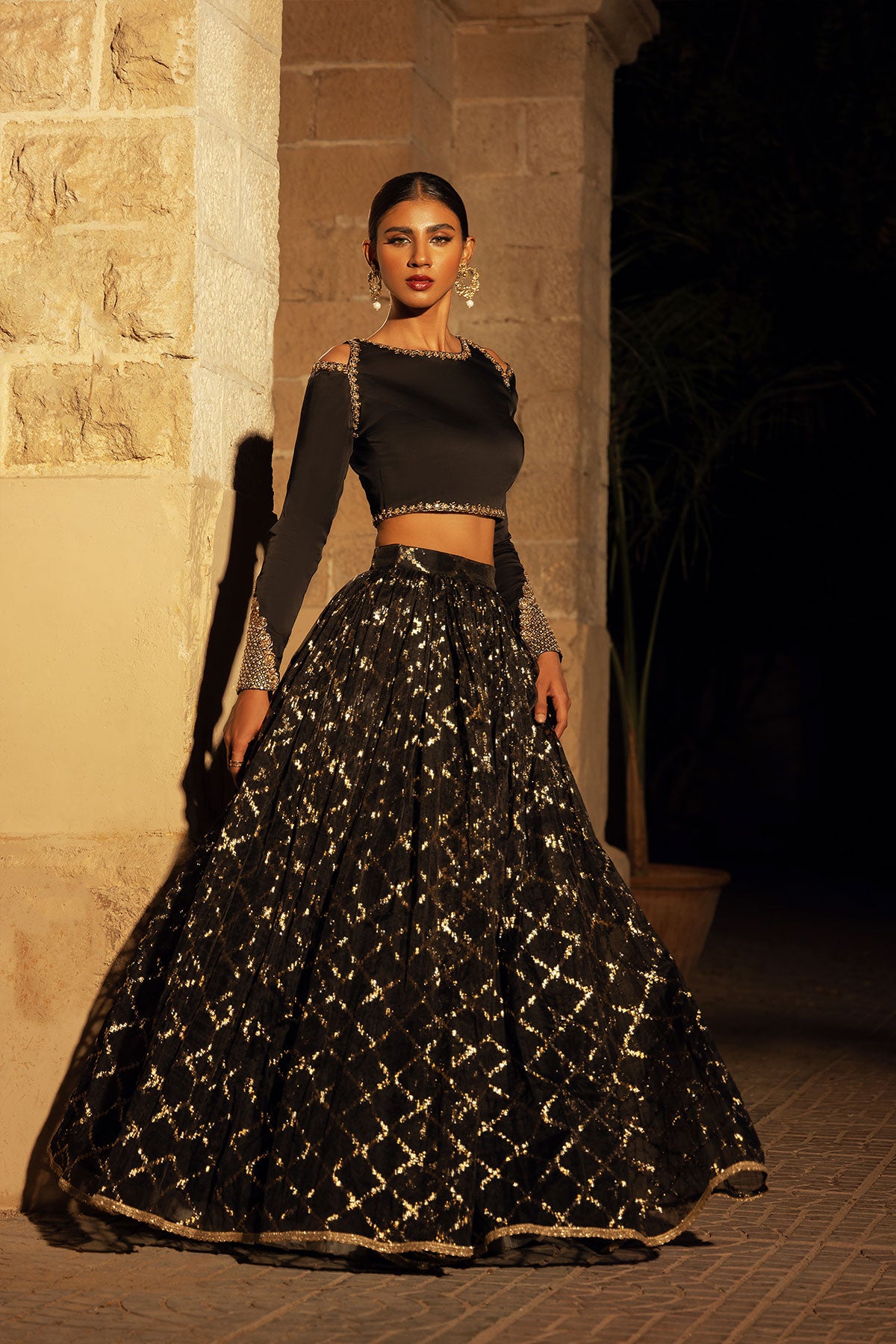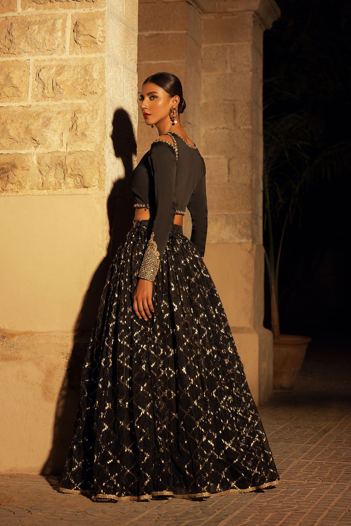 Step into enchantment with this delightful ensemble, where pure silk choli meets a glittering lehnga in a harmonious fusion of gold and black. The opulent allure of tilla, sequin, and zardozi detailing weaves a tale of romance, adorning the fabric with intricate elegance. Each stitch adds a touch of luxury, enhancing the subtle and nuanced charm of this outfit. With its captivating and exquisite craftsmanship, this ensemble invites you to embrace the magic of timeless beauty and grace.