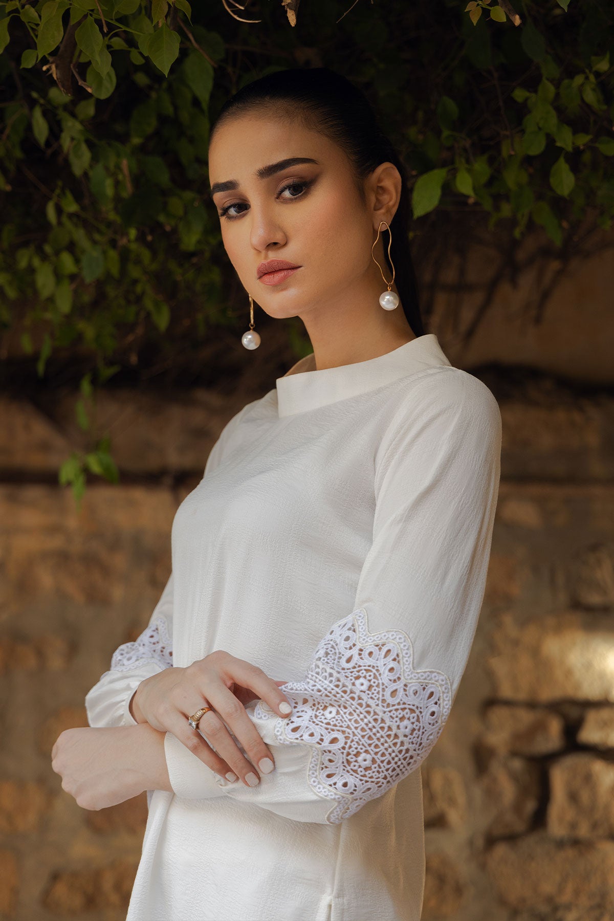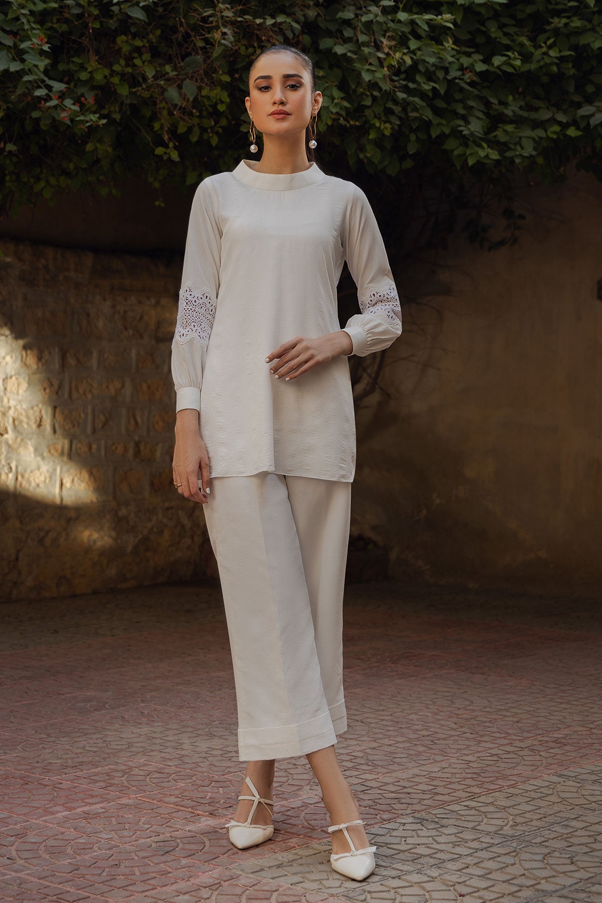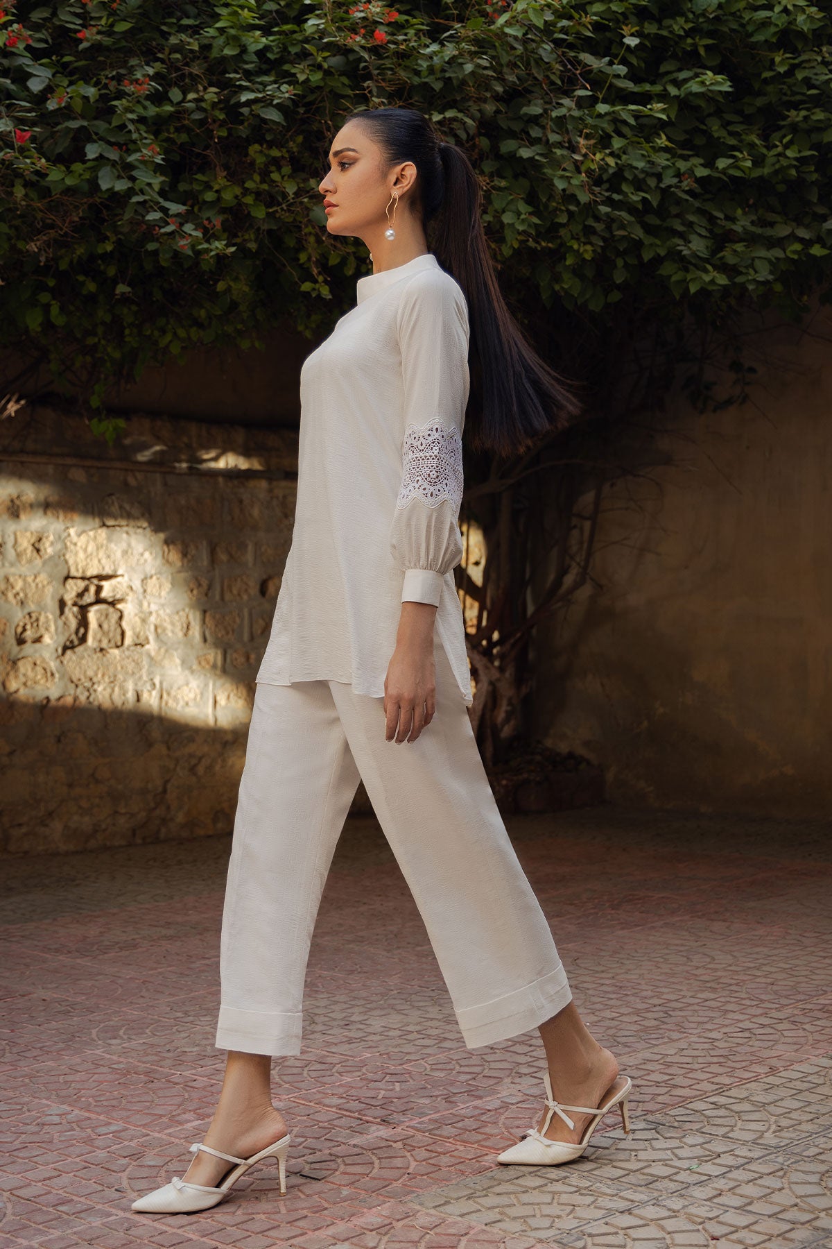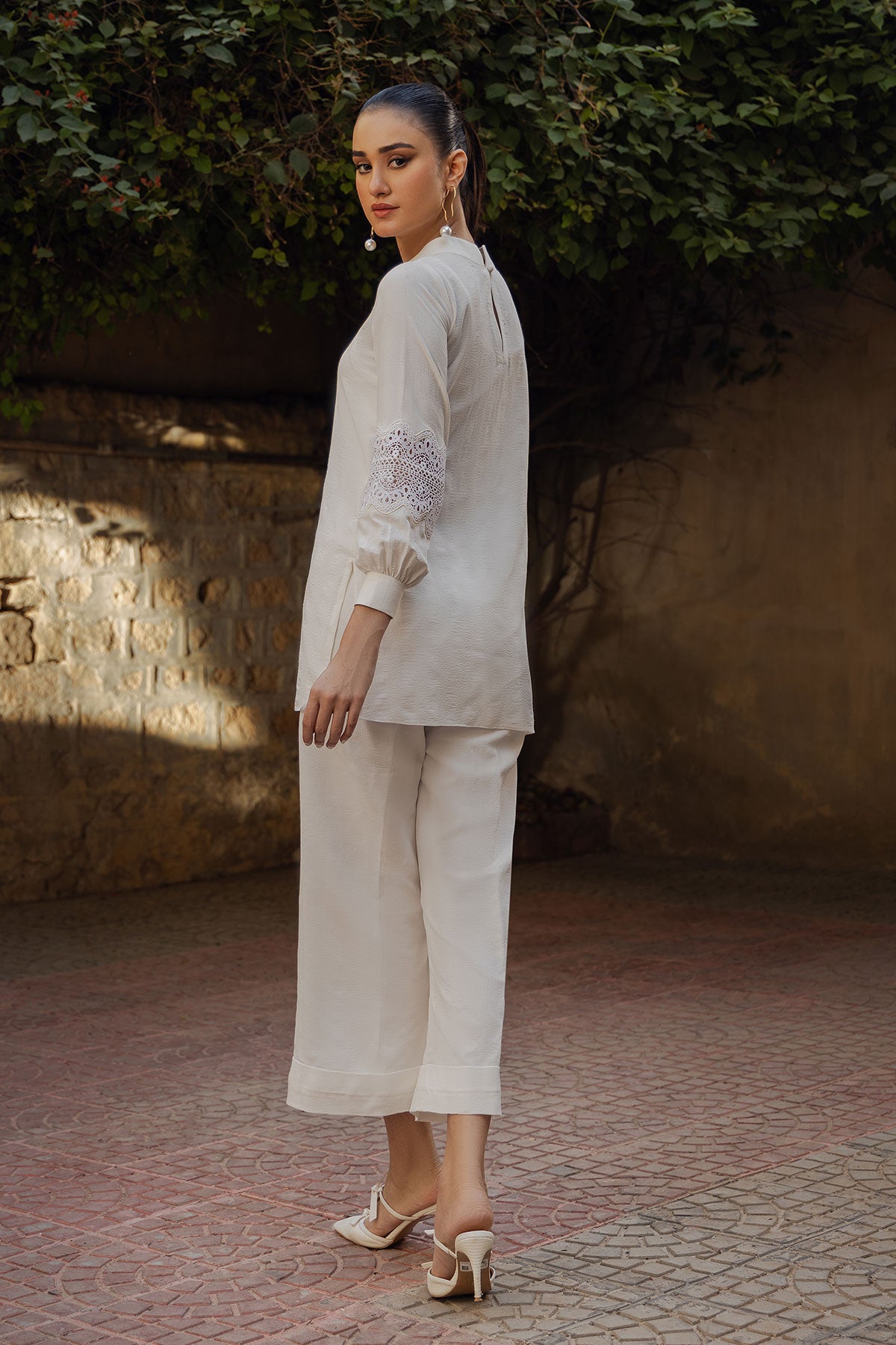 A stunning white co-ord set in georgette fabric, adorned with exquisite cutout lace work on the sleeves. The ensemble boasts a sophisticated collar style, perfectly complemented by straight pants featuring trouser cuffs.