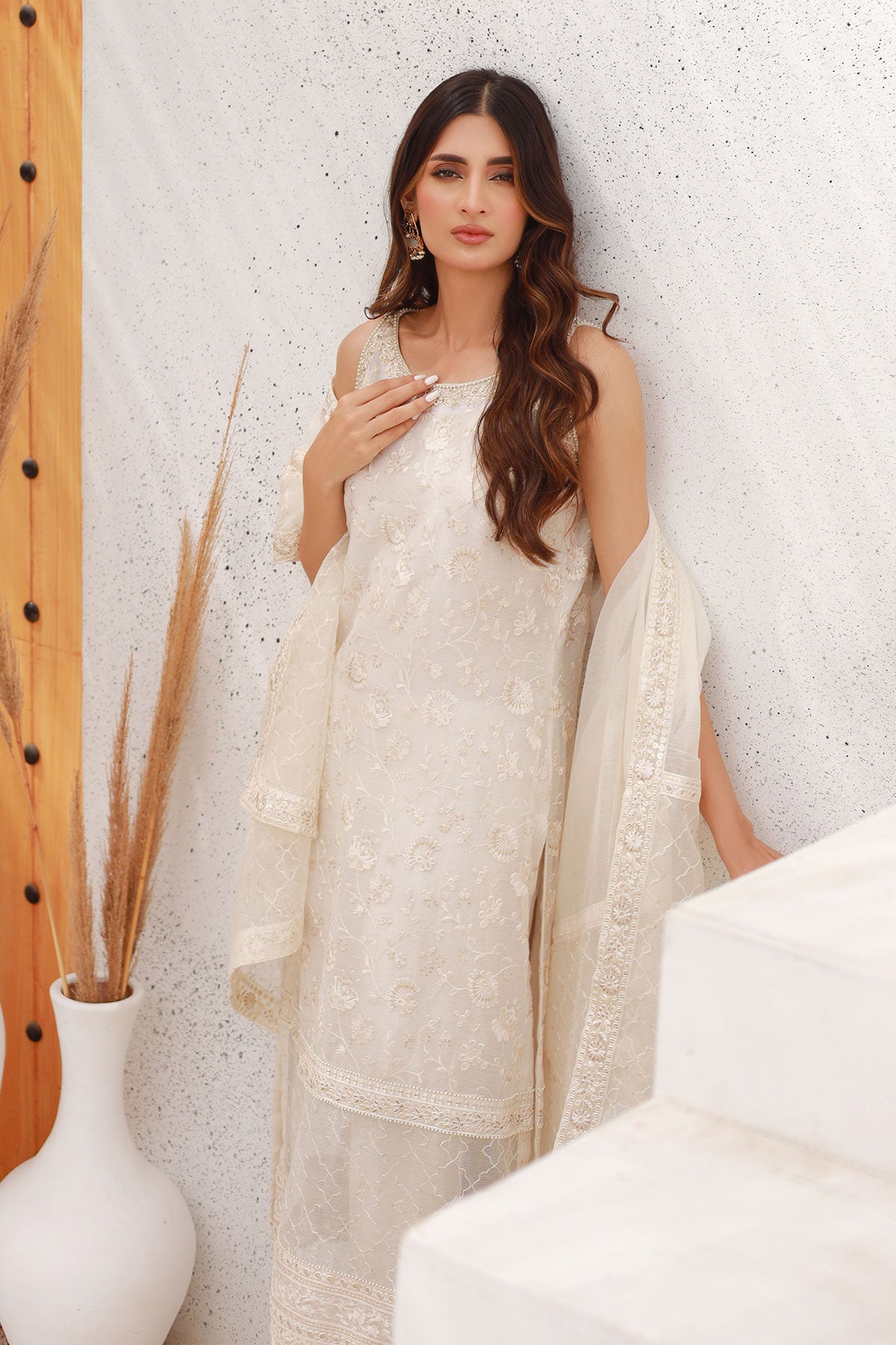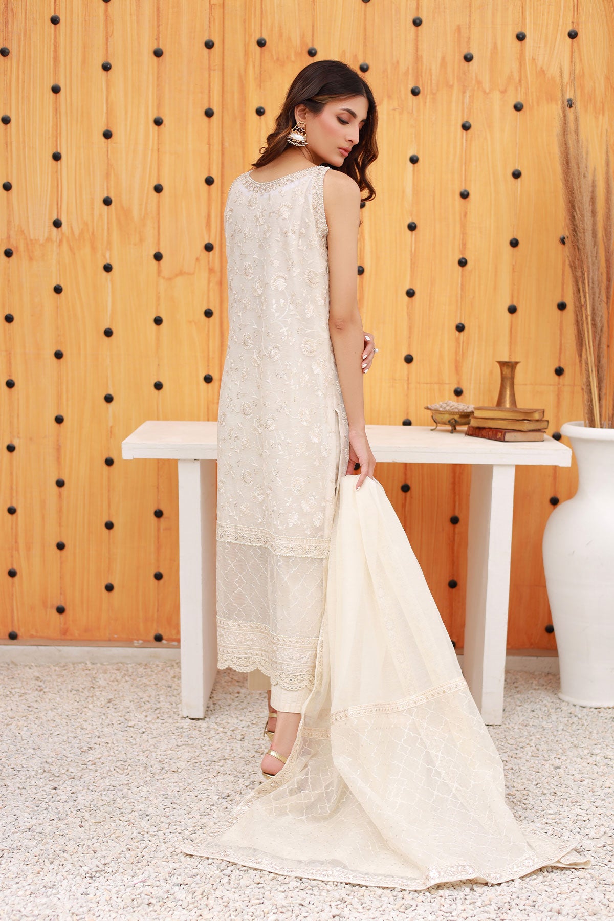 Ivory White straight cut shirt with hand embroidered details on neckline and daaman. Intricate details with pearls. It comes with beautiful embroidered dupatta and silk pants.