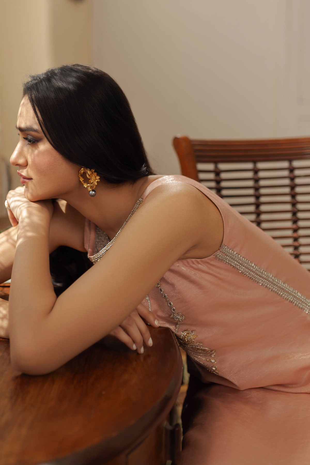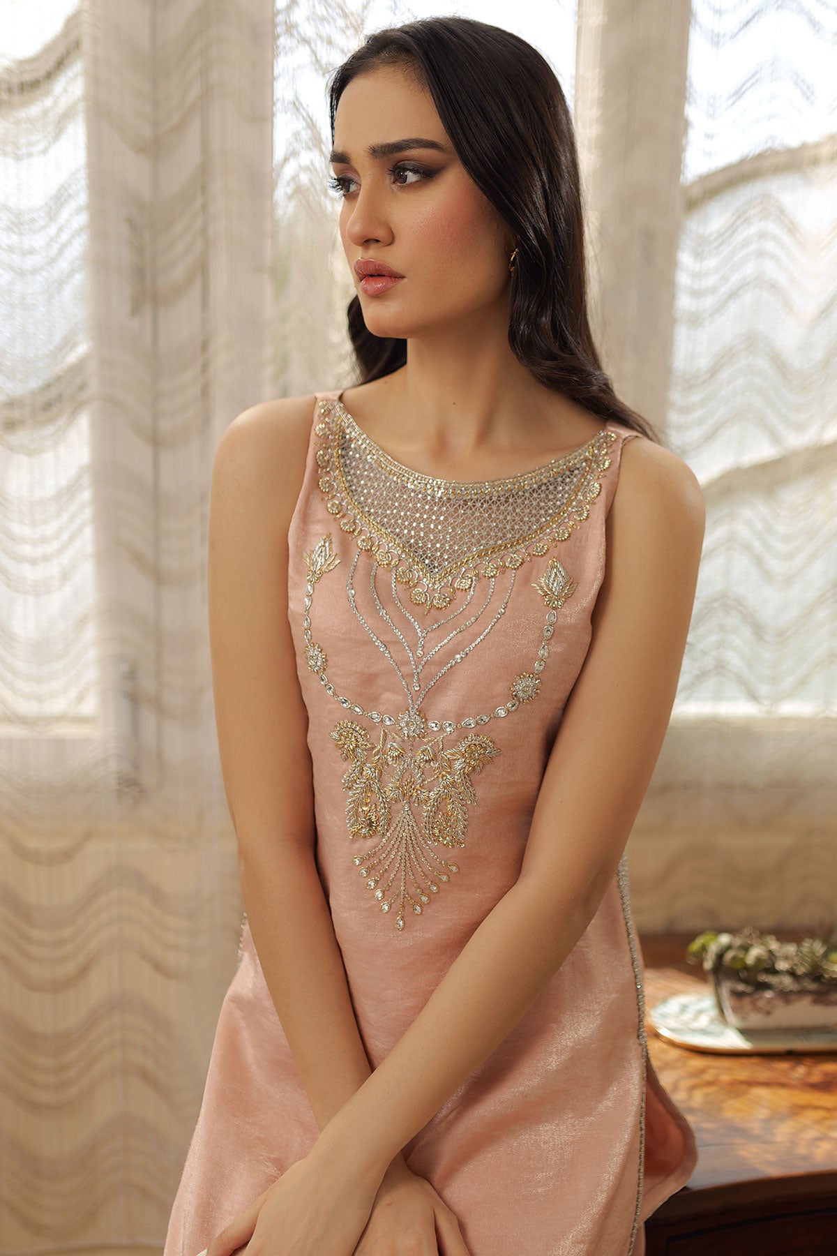 Crafted from shimmering silk fabric in Blush Pink, this outfit exudes elegance. The intricately hand-embroidered silver and gold neckline with delicate cut work adds a touch of luxury, while the hand-embroidered borders on the side chaak and daaman provide structure. Paired with wide pants featuring intricate borders on the bottoms, this ensemble is a perfect choice for festive occasions, radiating grace and sophistication.
