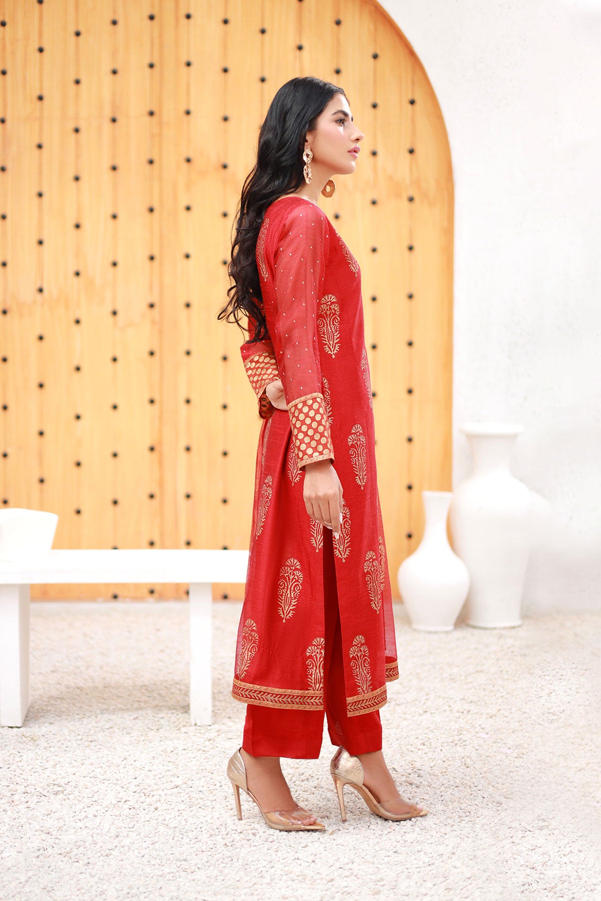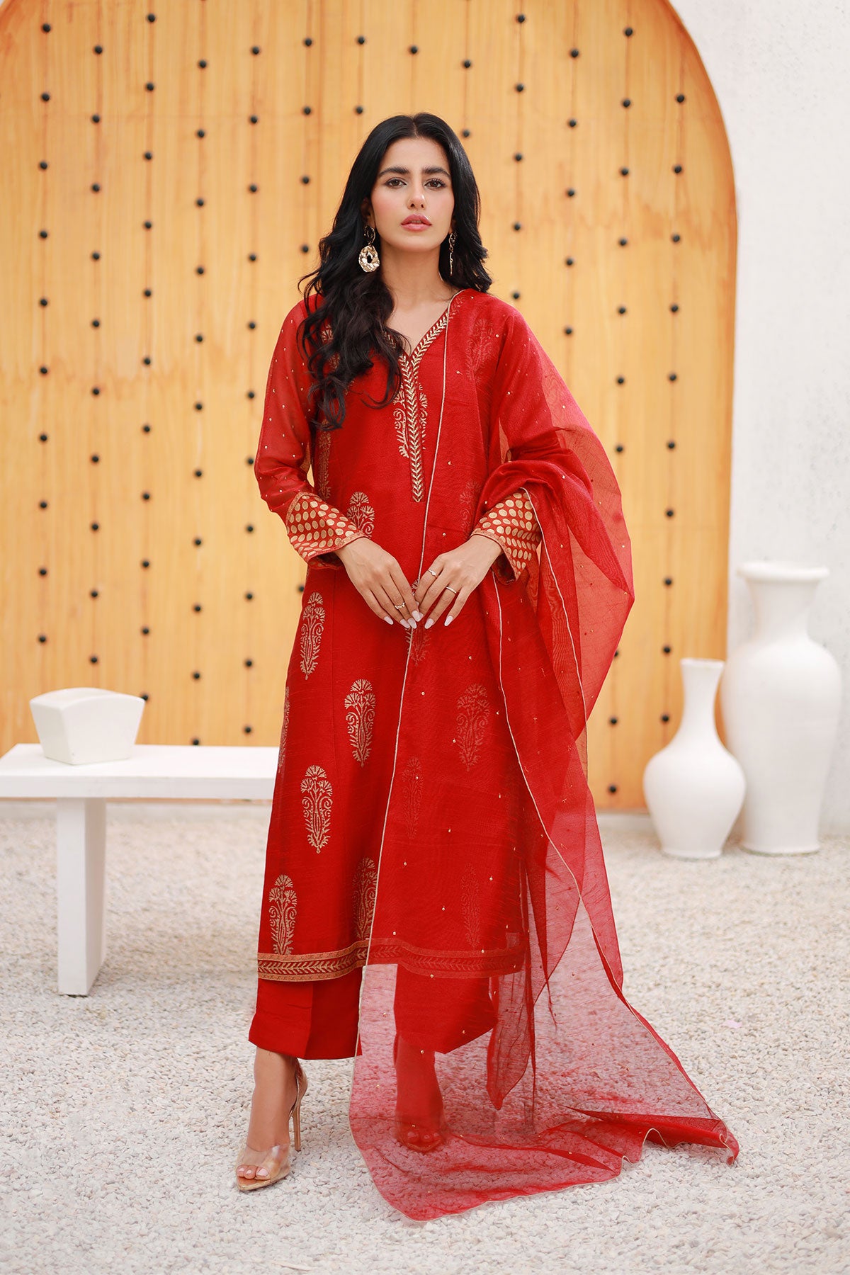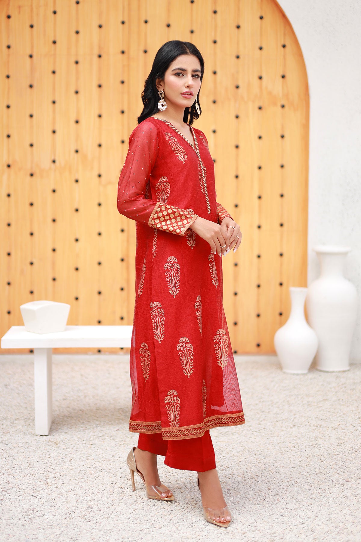 Red Block printed Khaadi Net Shirt. Block printed shirt and sleeves border in rust color. Hand embroidered neckline. Details with Rust colored jamawar.