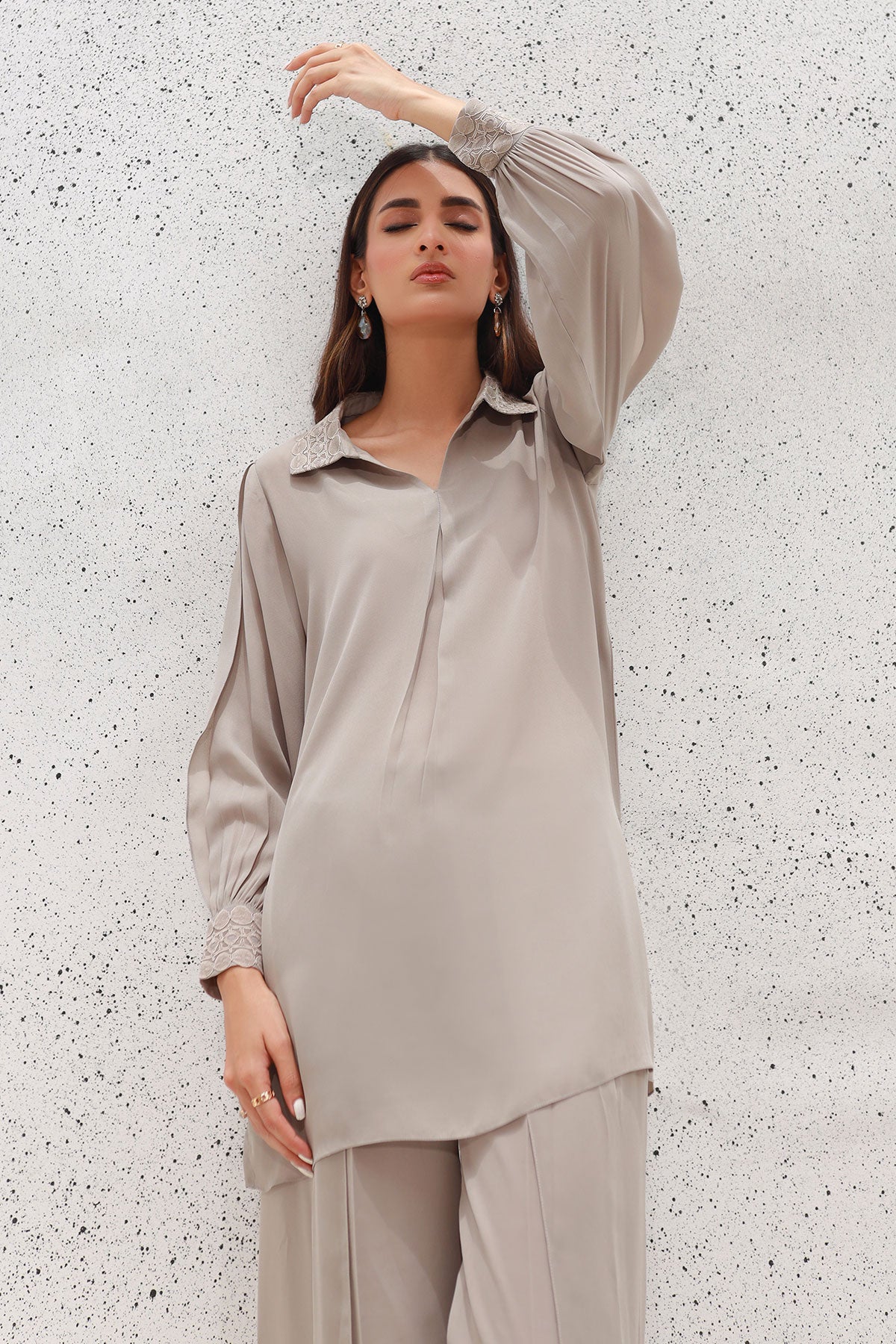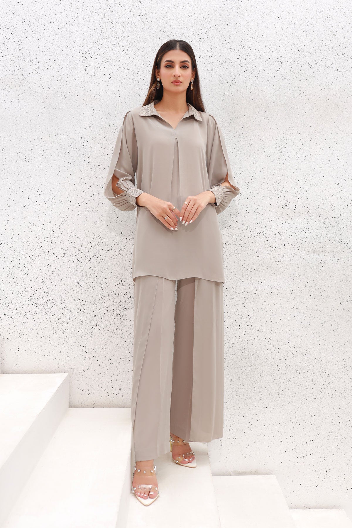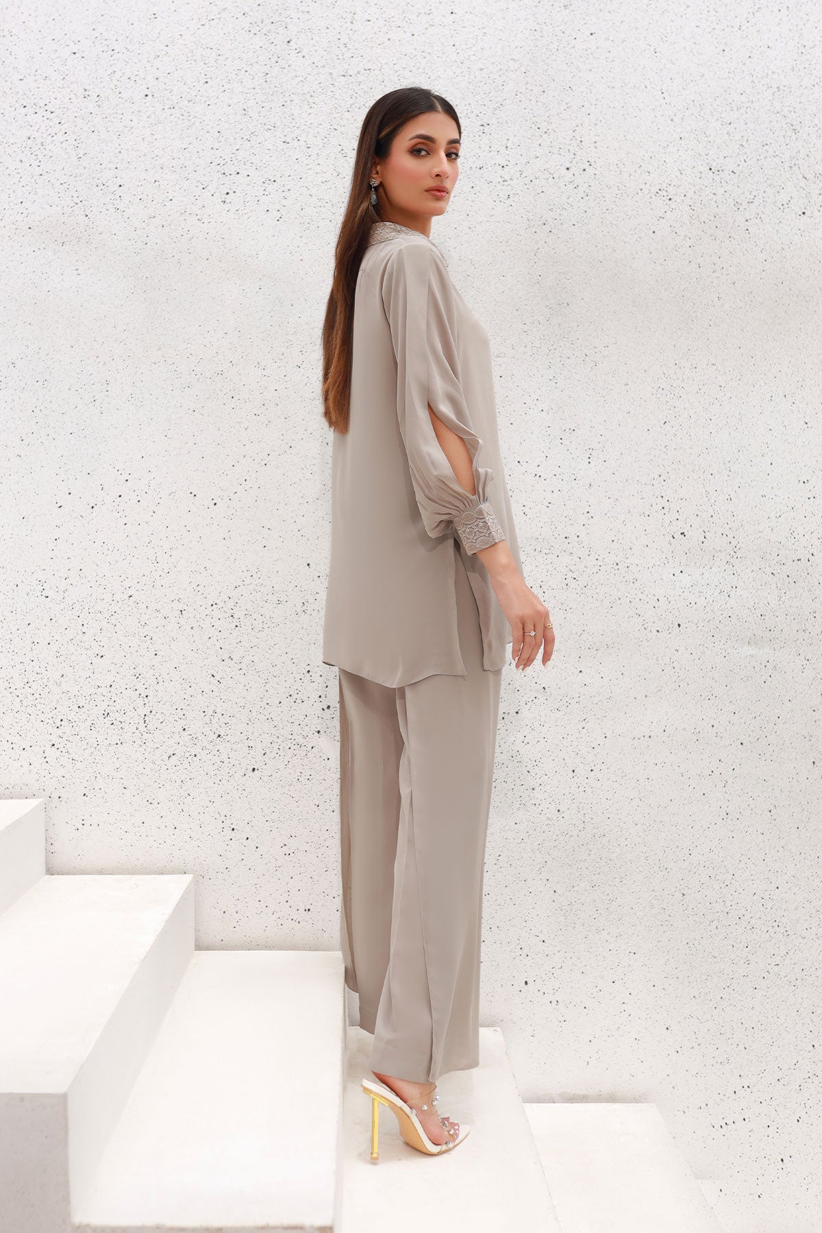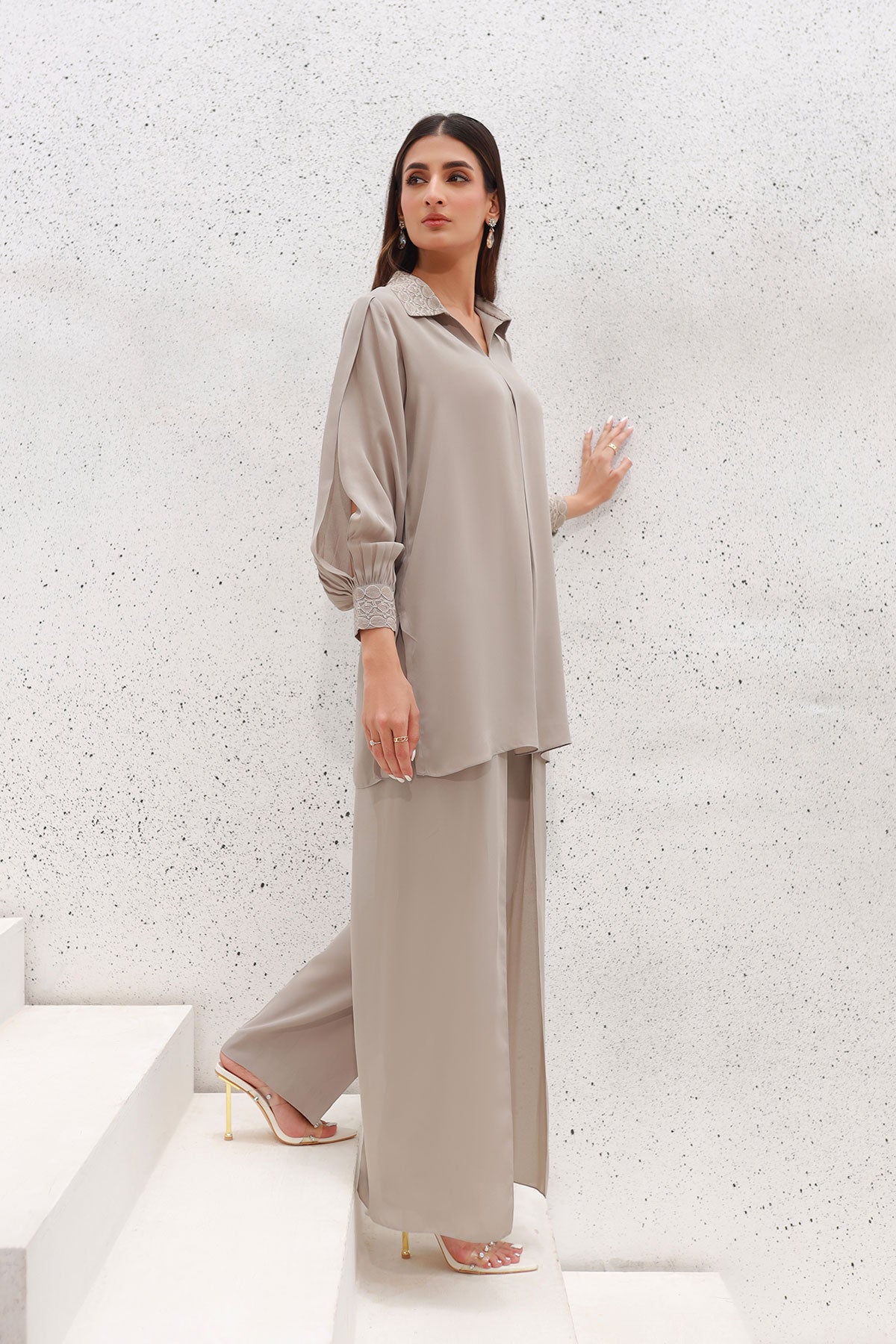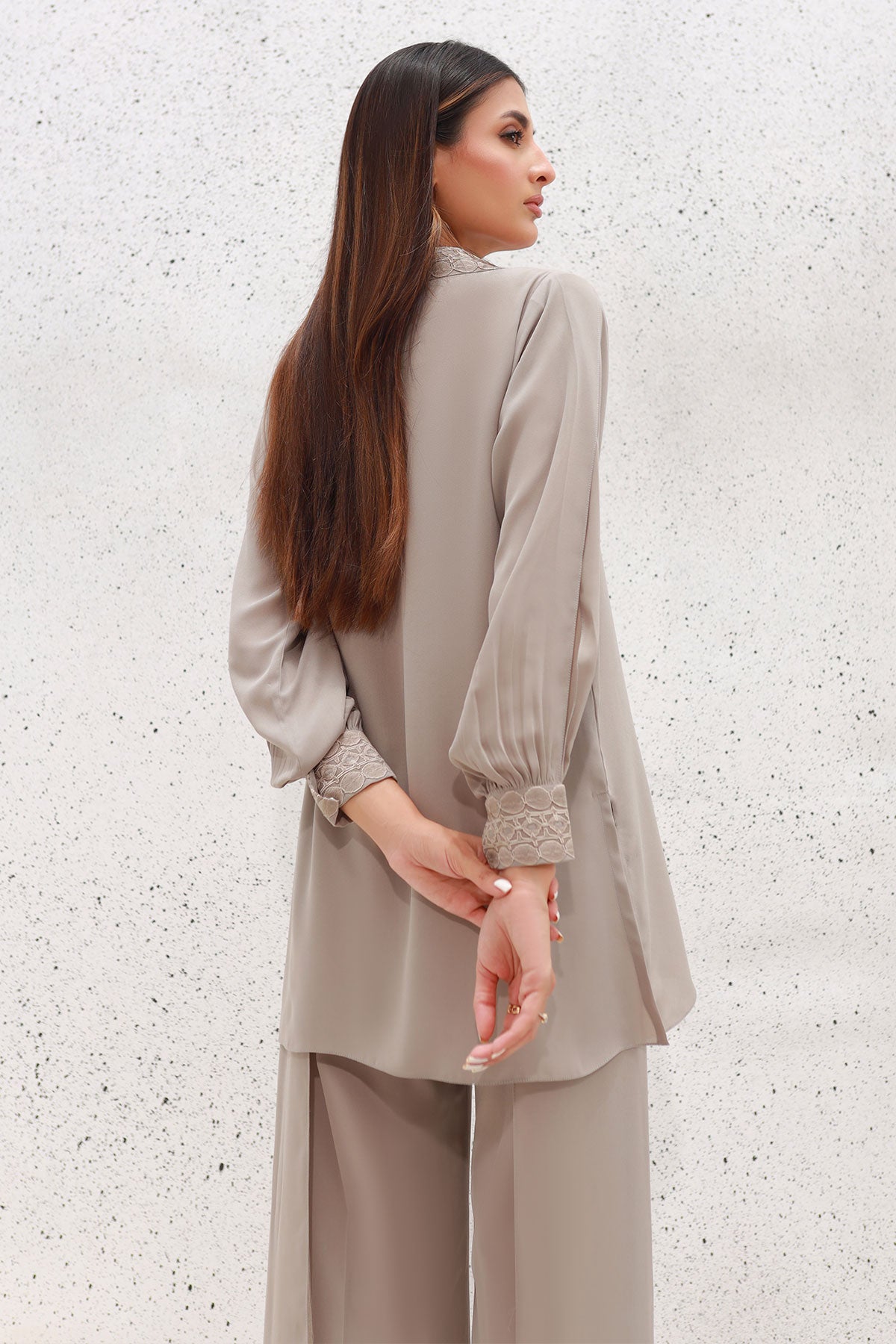Exude charm in this captivating co-ord set, designed to make a statement. The collar neckline and cuff sleeves, embellished with delicate lace fabric and sleeves slit, elevate the ensemble with a touch of timeless elegance. The layered pants gives a sophisticated flair to the look.