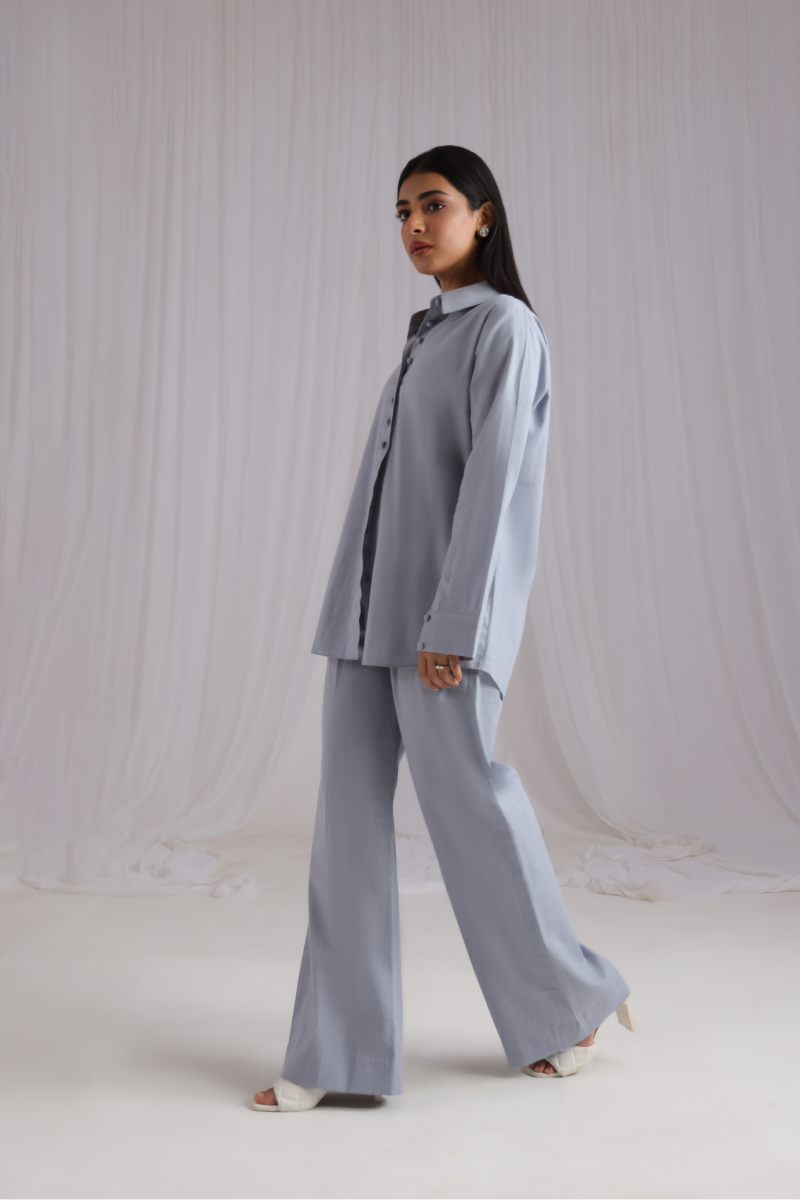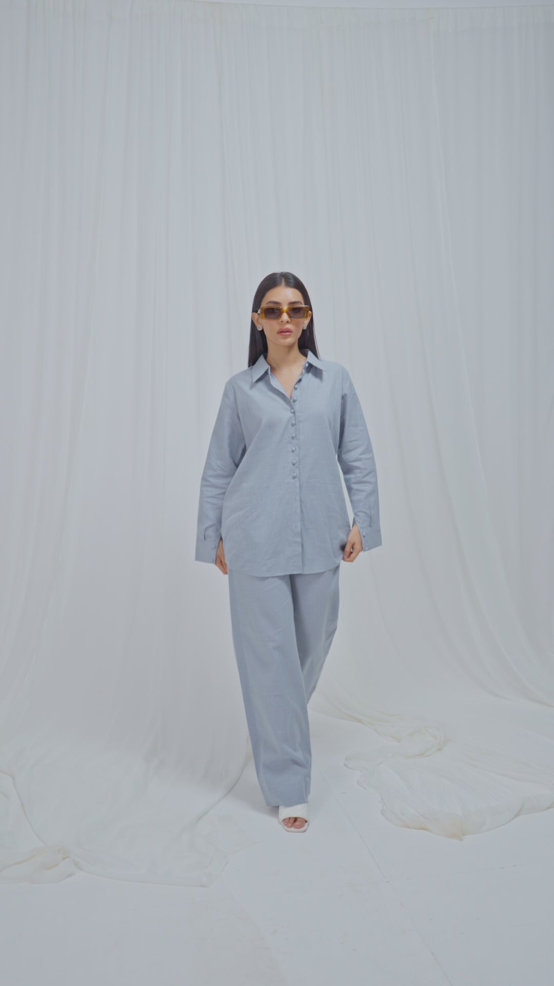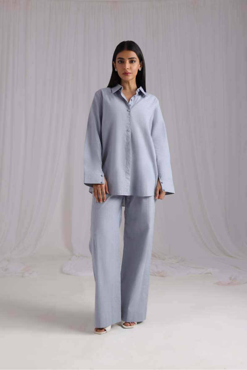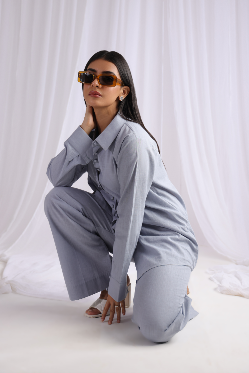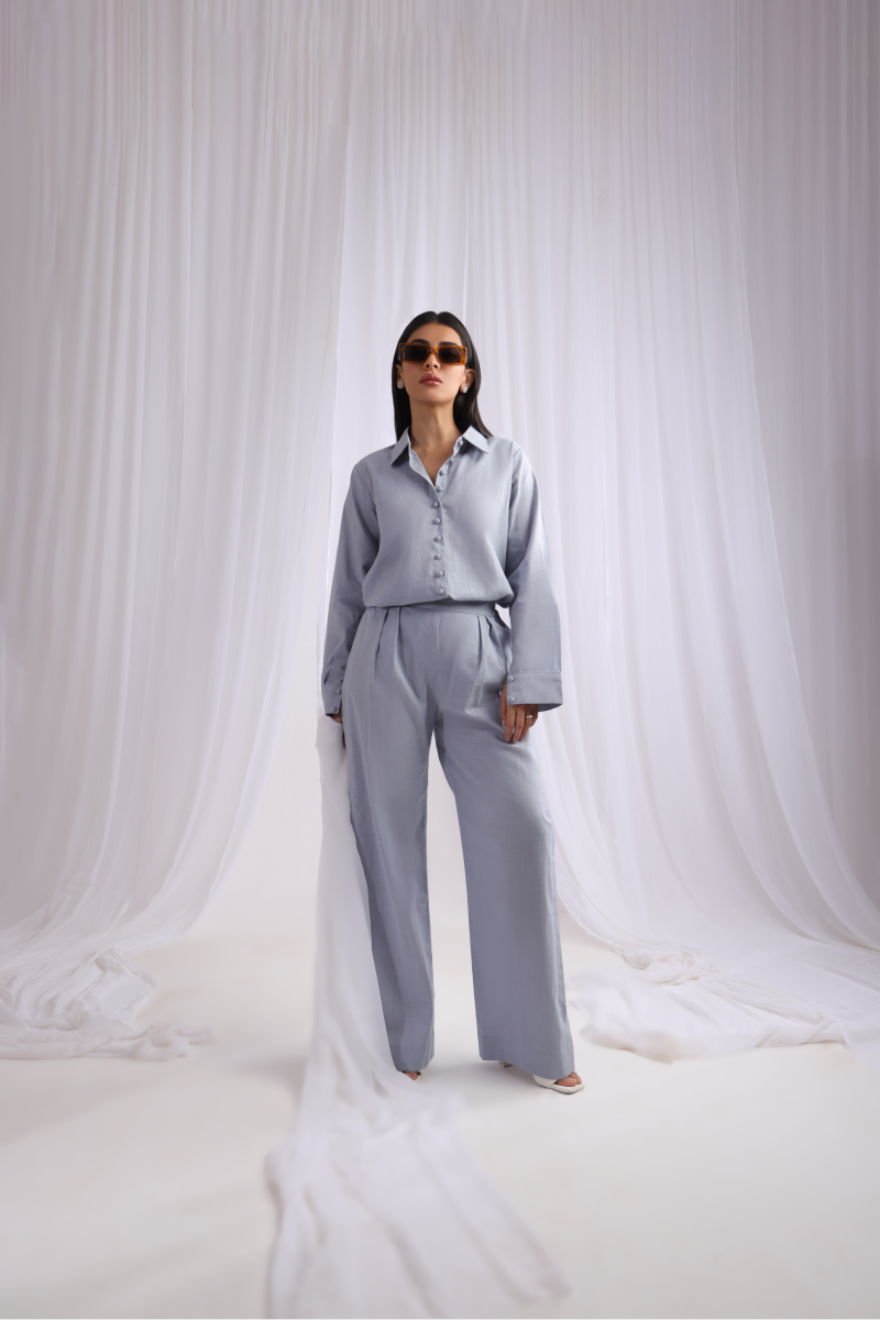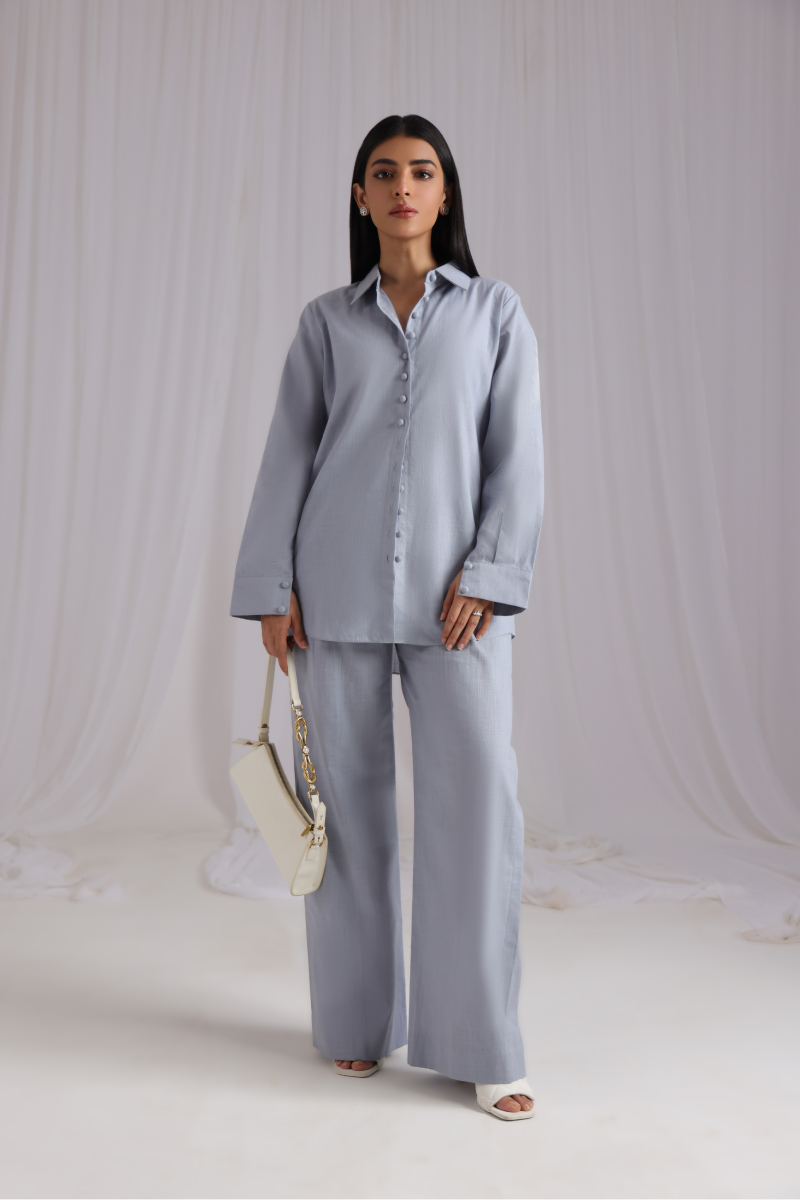 A refined button-down co-ord set crafted from summer linen fabric, featuring a collar neckline and cuffed sleeves embellished with loop buttons for a touch of sophistication. It pairs effortlessly with loose pants, blending chic design elements for a contemporary and elegant appearance.