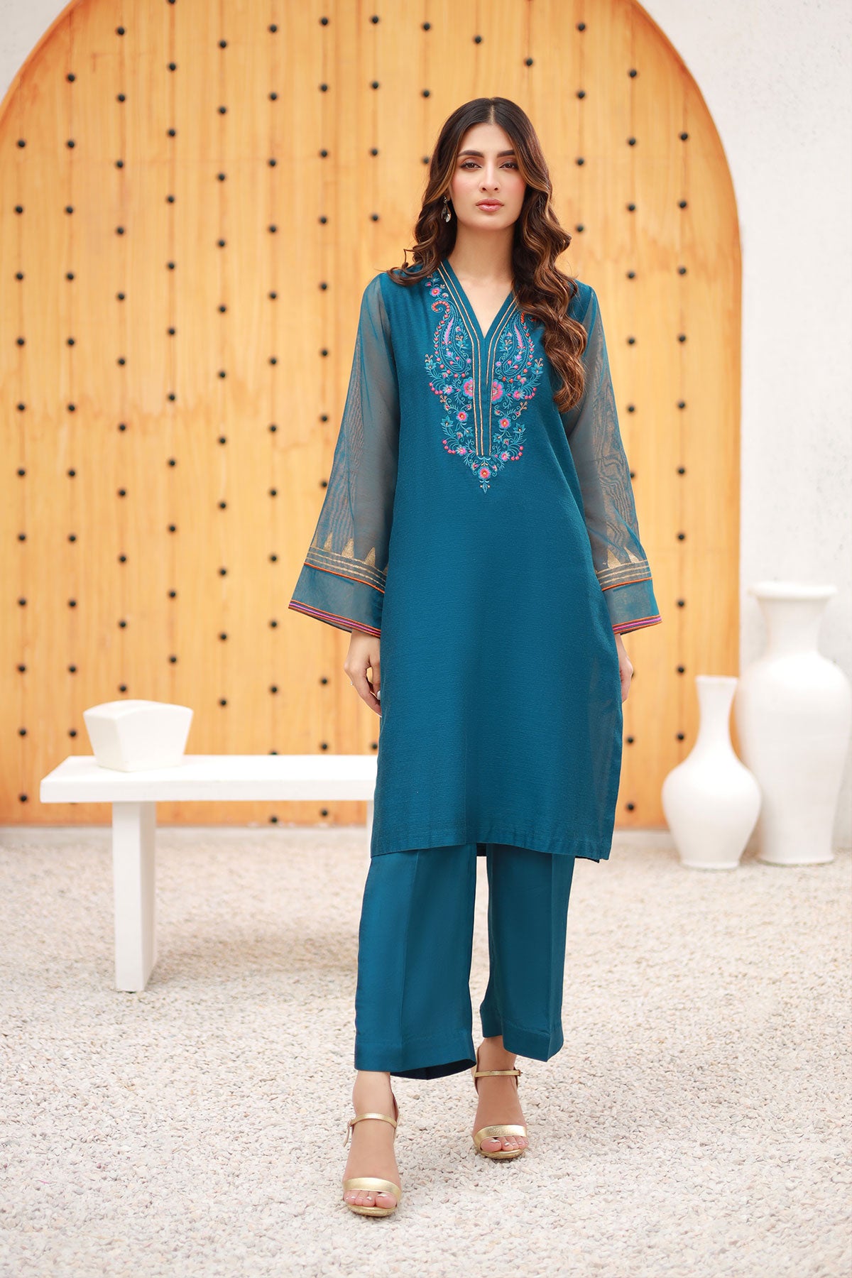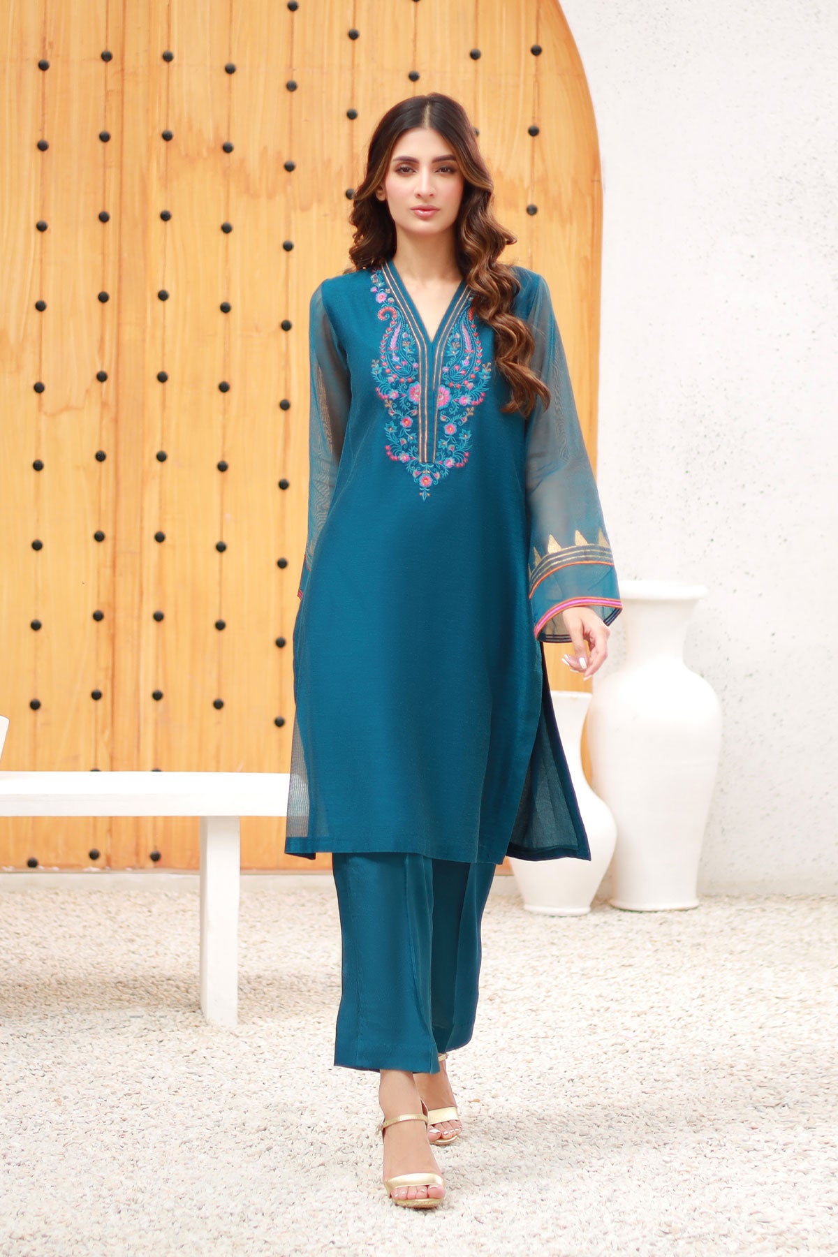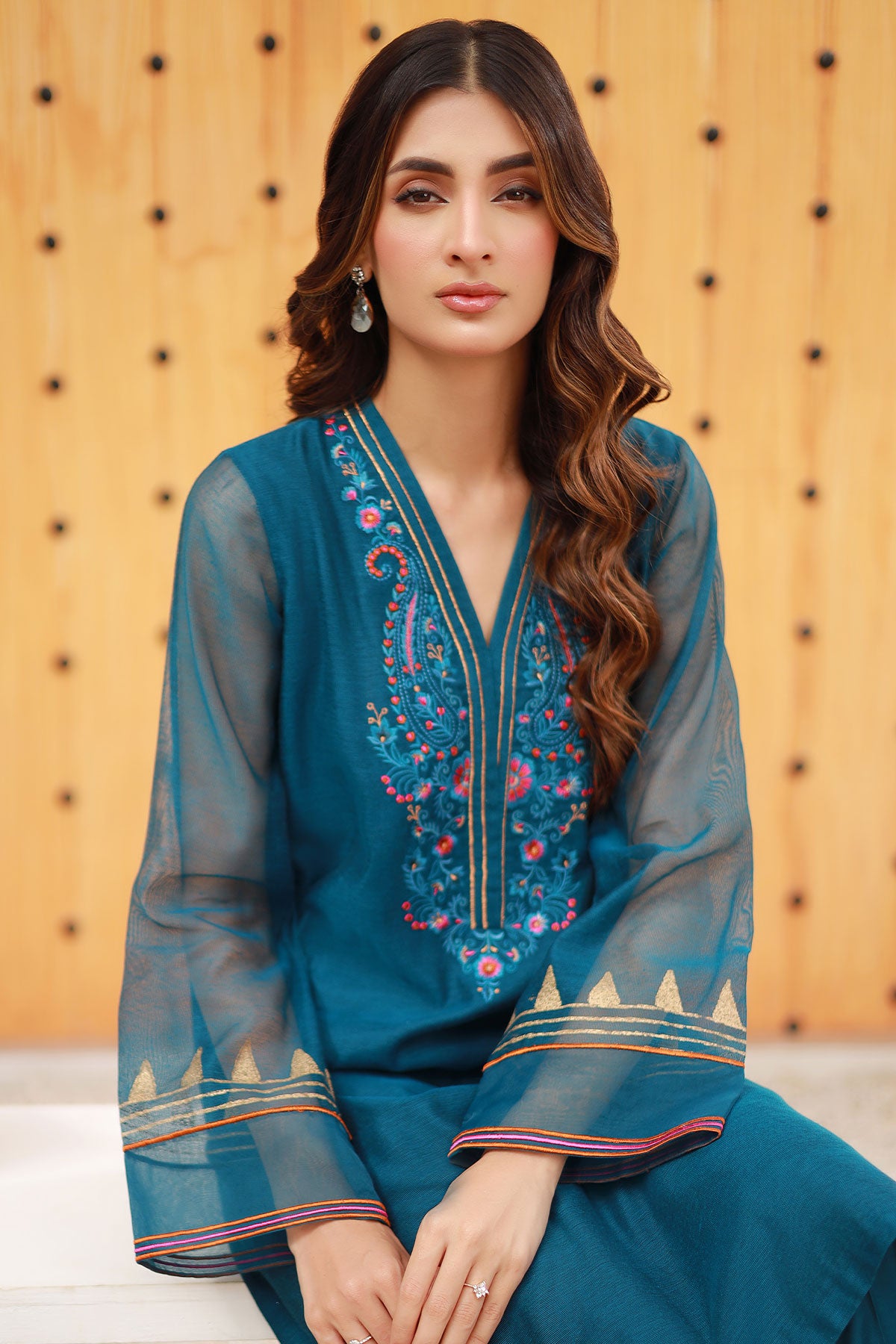 Details: Block printed sleeves, colorful embroidered neckline with resham and zari.