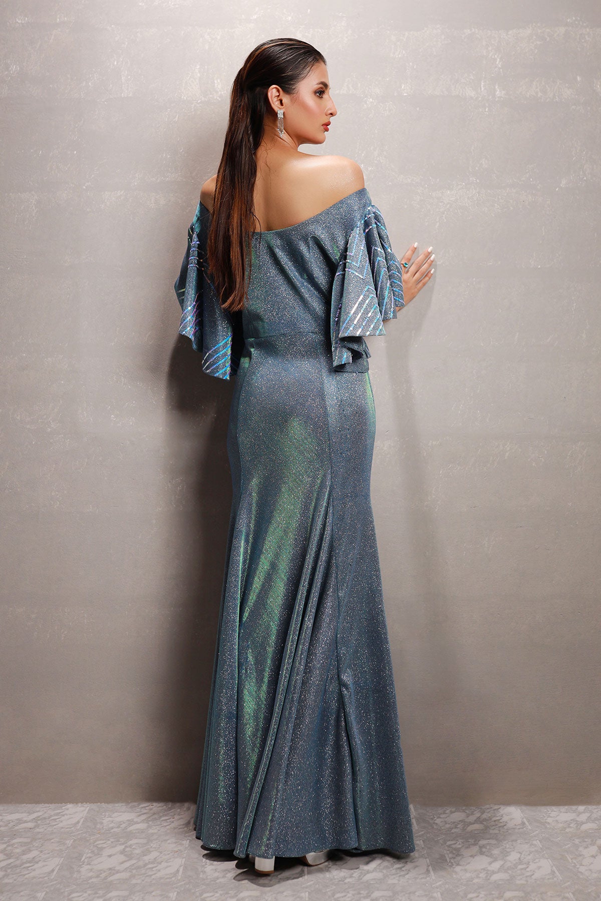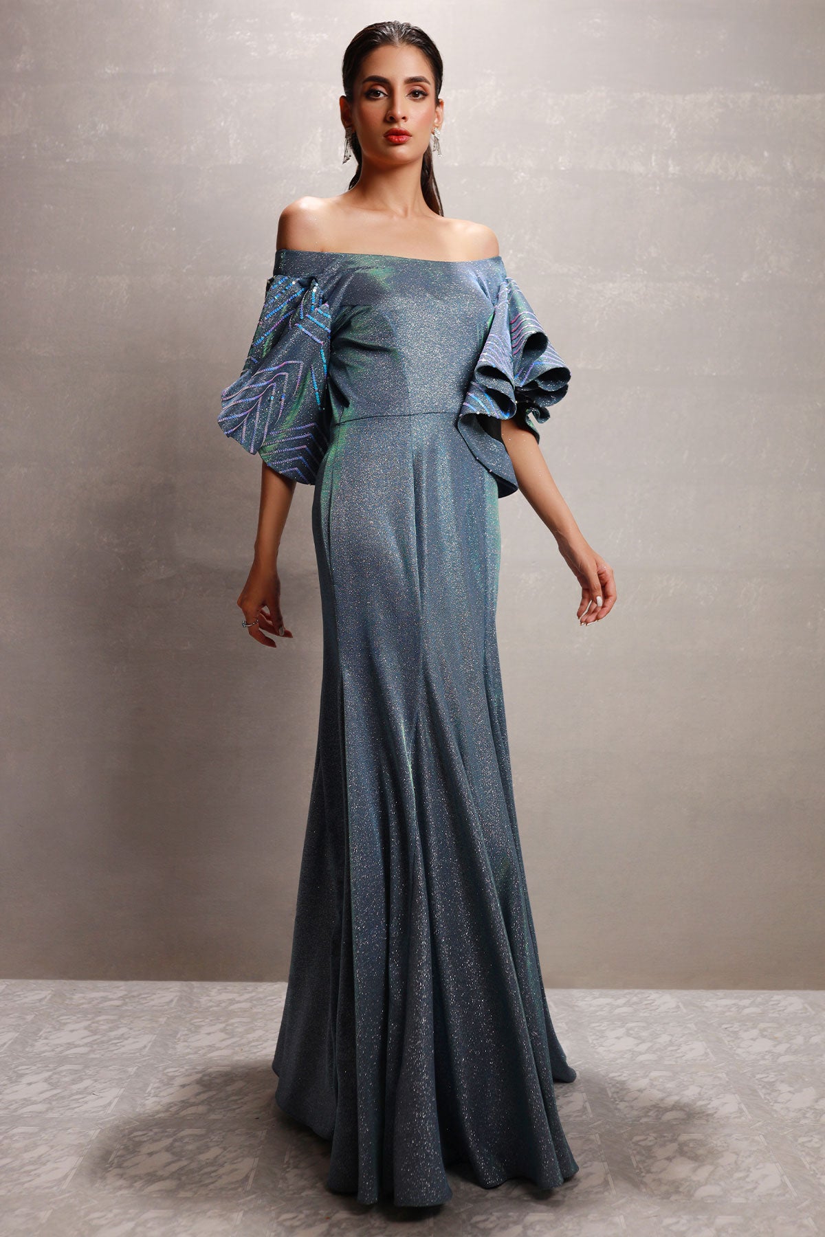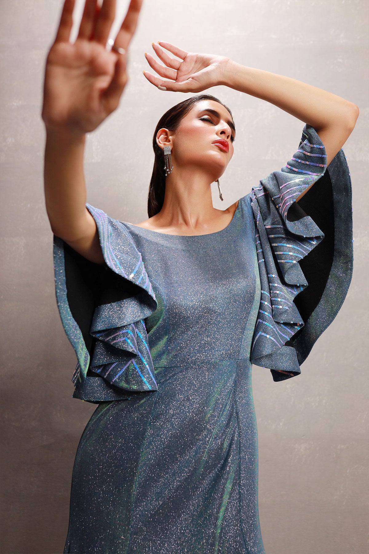 Aqua Shimmer Ankle length Couture Dress with beautifully draped sleeves and sequence details.