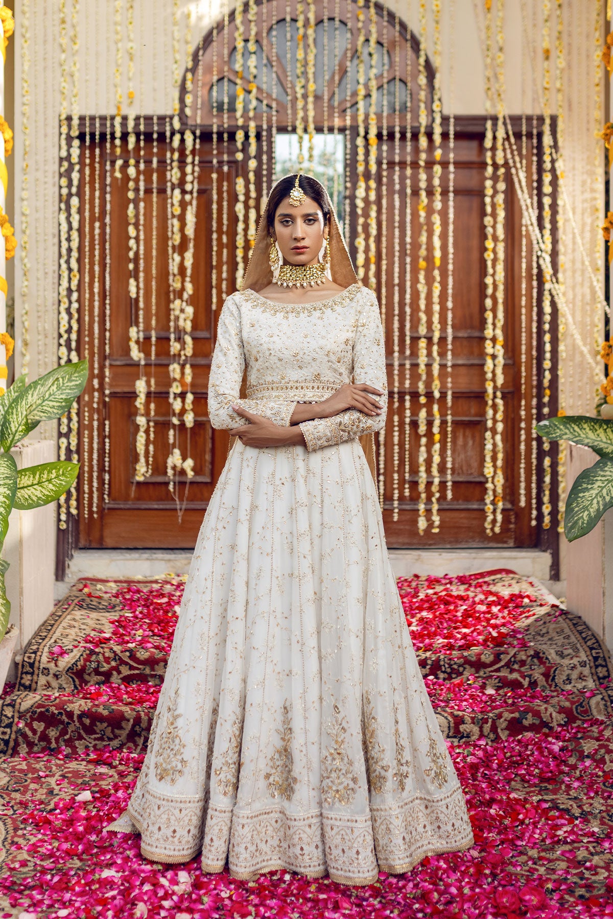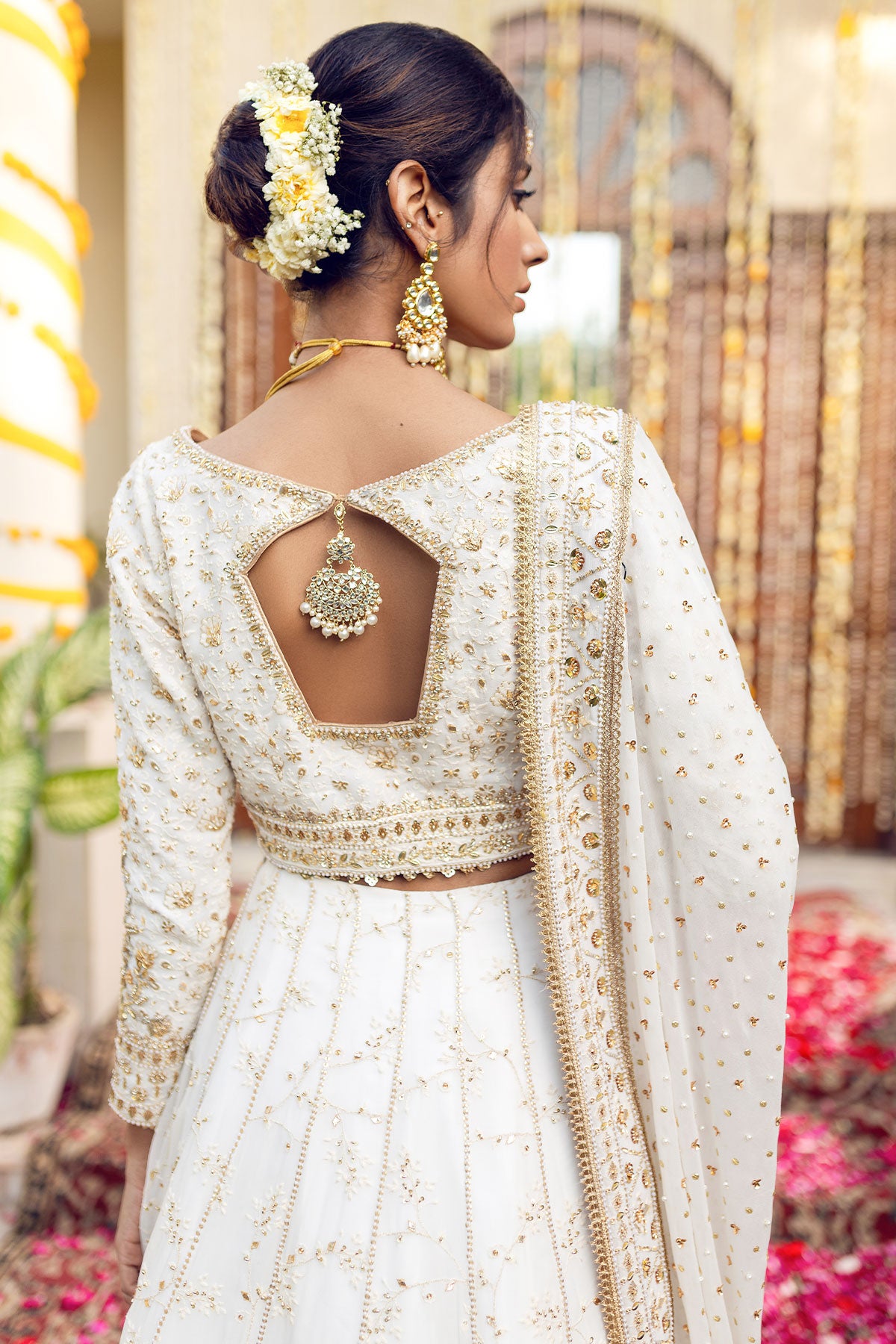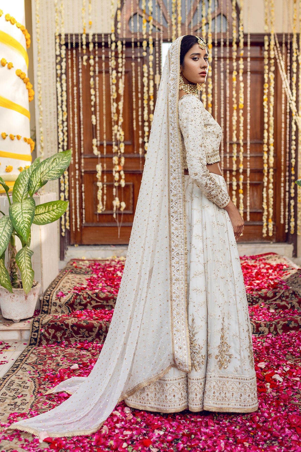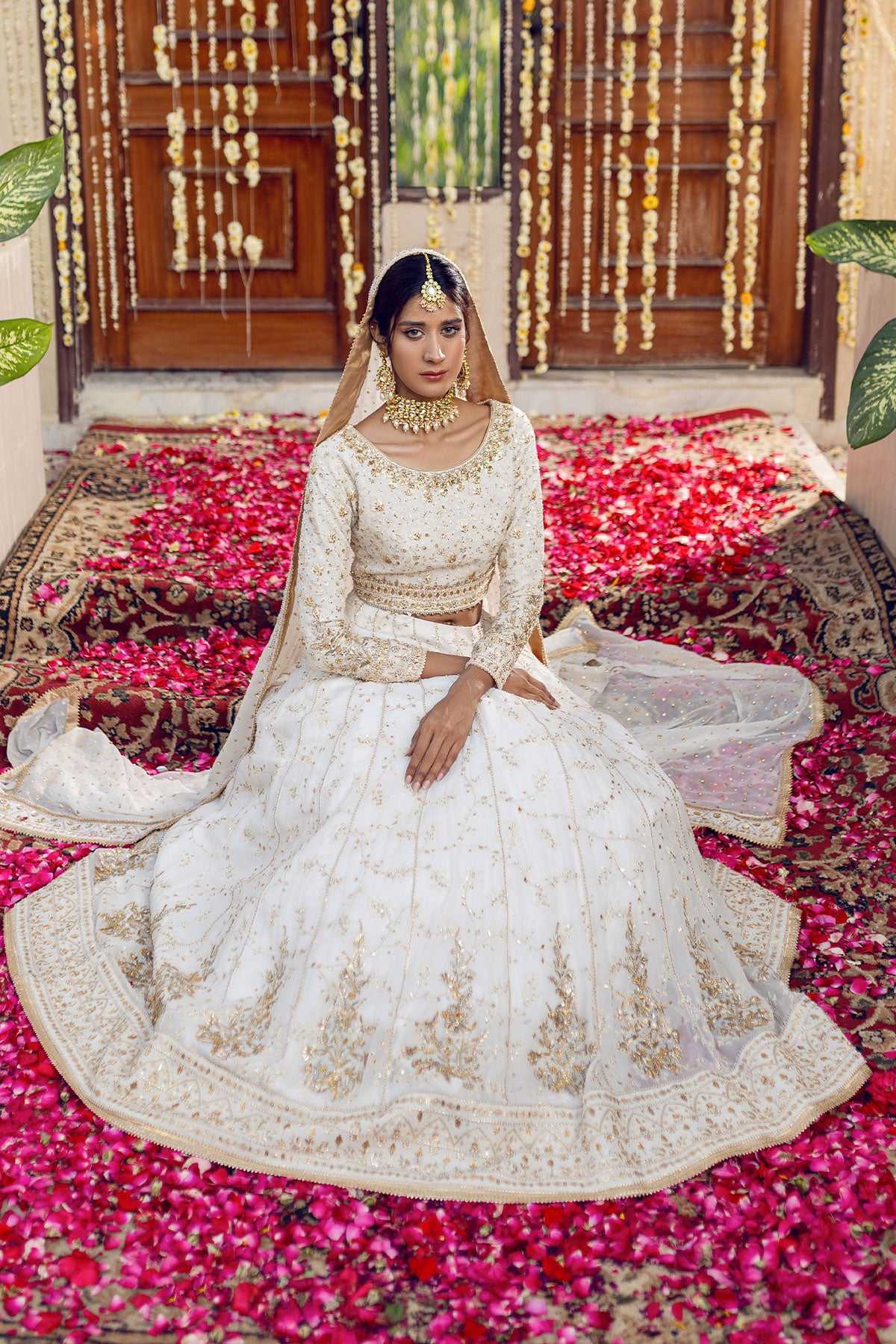Beautifully embroidered Indian chikankari lehnga and choli with fine work of dabka, tilla, pearl and naqshi on it. The exquisite embellished bunches on lehnga panel and intricate craftsmanship makes it fascinating and mysteriously attractive.