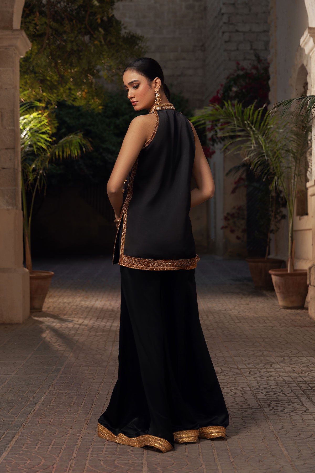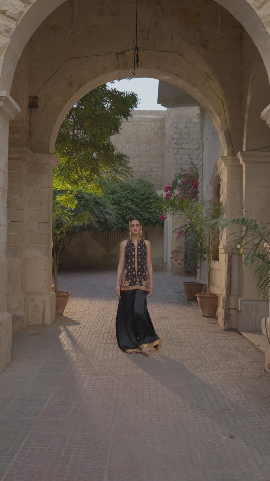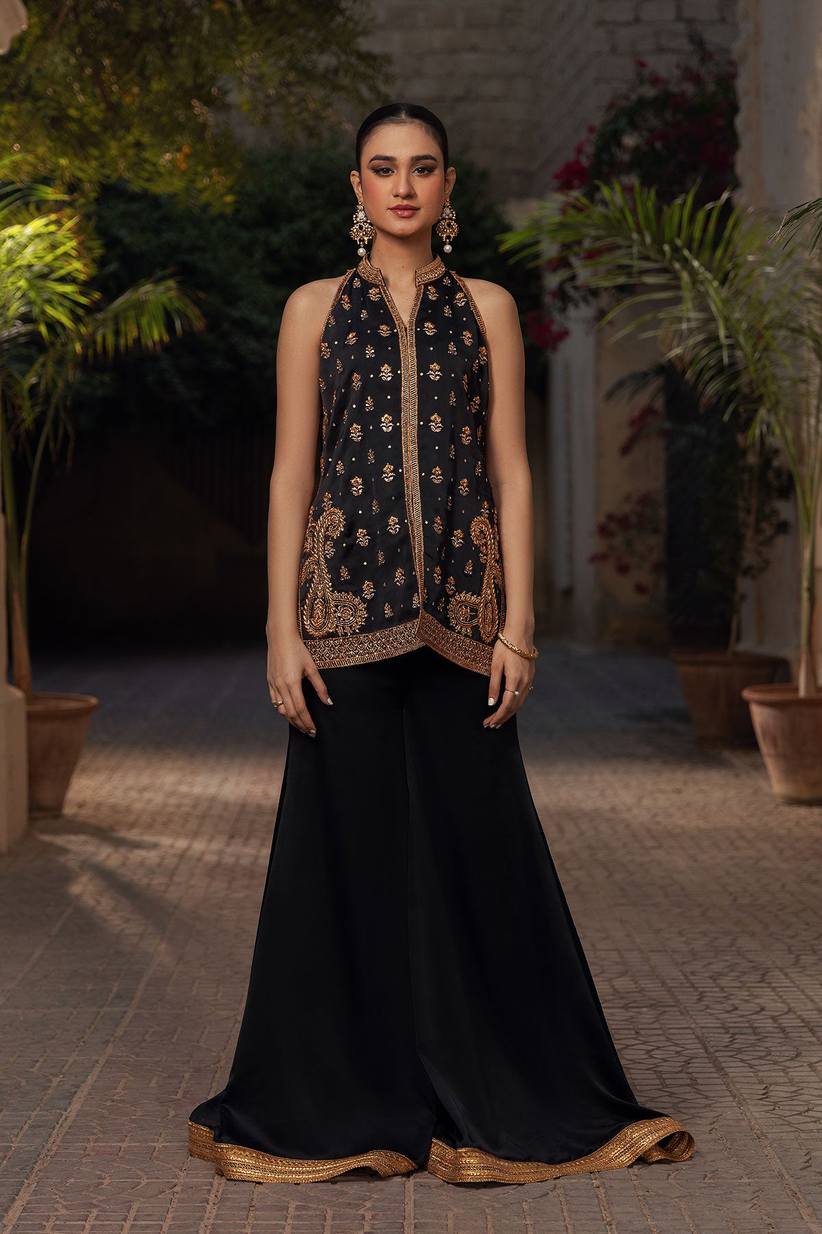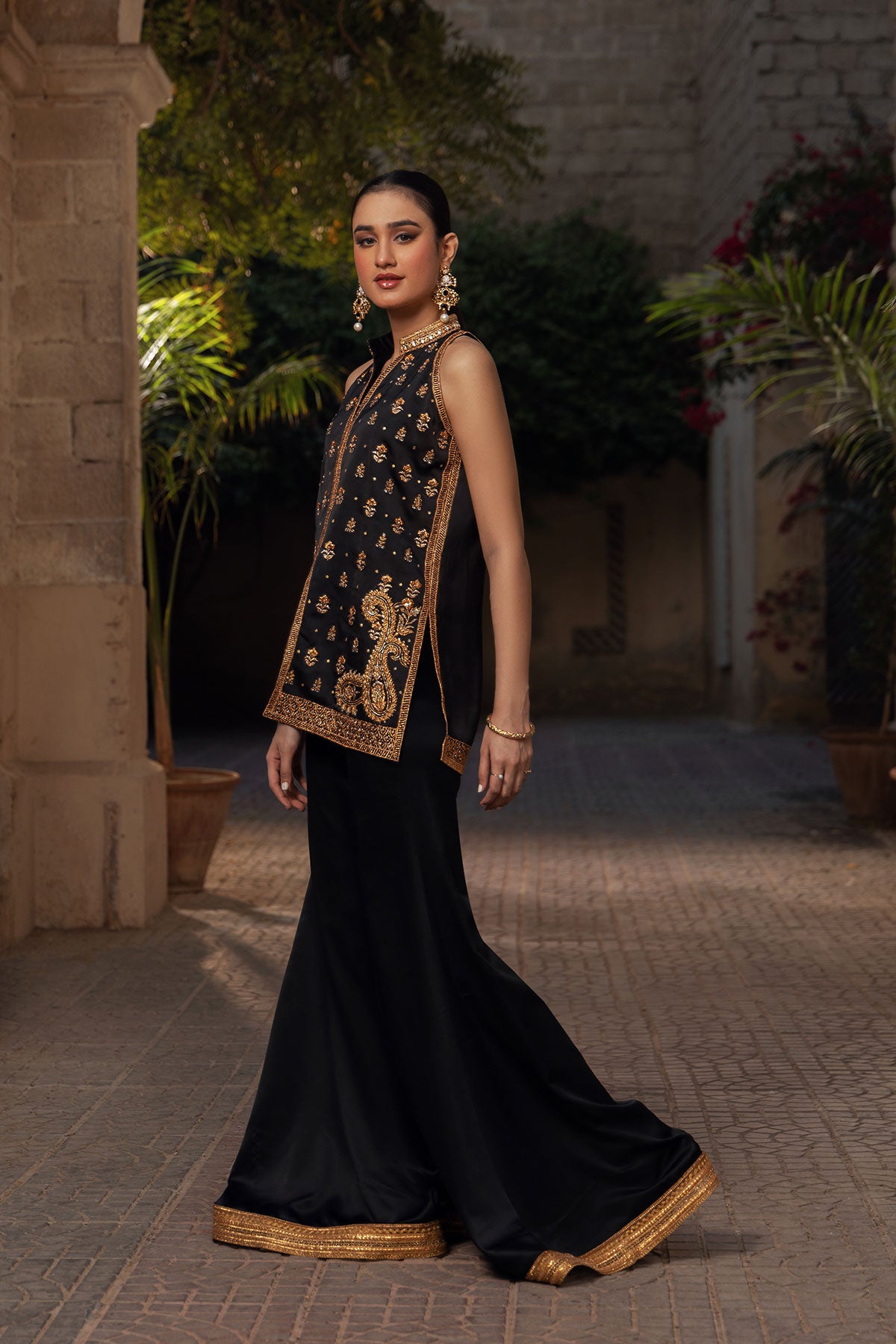 Elevate your wardrobe with our exquisite front open black jacket, meticulously crafted to perfection. Made from pure silk canvas, this jacket exudes luxury and sophistication. The all-over badla embroidery adds a touch of regality, making it a standout piece for any special occasion.